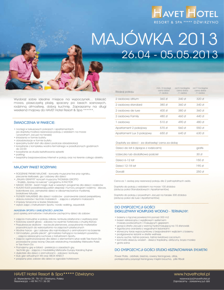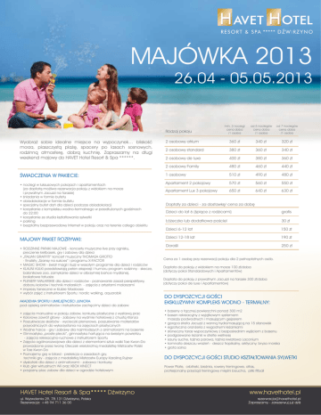 MAJÓWKA 2013 26.04 - 05.05.2013 min. 3 noclegI cena doba /1 osoba od 5 noclegów cena doba /1 osoba od 7 noclegów cena doba /1 osoba 2 osobowy atrium 360 zł 340 zł 320 zł 2 osobowy standard 380 zł 360 zł 340 zł 2 osobowy de luxe 400 zł 380 zł 360 zł 2 osobowy Family 480 zł 460 zł 440 zł 1 osobowy 510 zł 490 zł 480 zł Apartament 2 pokojowy 570 zł 560 zł 550 zł Apartament Lux 3 pokojowy 650 zł 640 zł 630 zł Rodzaj pokoju Wyobraź sobie idealne miejsce na wypoczynek… bliskość morza, piaszczystą plażę, spacery po lasach sosnowych, rodzinną atmosferę, dobrą kuchnię. Zapraszamy na długi weekend majowy do HAVET Hotel Resort & Spa ******. ŚWIADCZENIA W PAKIECIE: • noclegi w luksusowych pokojach i apartamentach (za dopłatą możliwa rezerwacja pokoju z widokiem na morze i prywatnym Jacuzzi na tarasie) • śniadania w formie bufetu • obiadokolacje w formie bufetu • specjalny bufet dań dla dzieci podczas obiadokolacji • korzystanie z kompleksu wodno-termalnego w przedłużonych godzinach do 22:00 • korzystanie ze studia kształtowania sylwetki • parking • bezpłatny bezprzewodowy Internet w pokoju oraz na terenie całego obiektu MAJOWY PAKIET ROZRYWKI: • RODZINNE PIKNIKI MAJOWE - koncerty muzyczne live przy ognisku, pieczenie kiełbasek, gry i zabawy dla dzieci • „ITALIAN GRAFFITI” koncert muzyczny THOMASA GROTTO - finalisty „Szansy na sukces” i programu X-FACTOR • MAGIC SHOW - świat magii i iluzji w wesołym programie dla dzieci i rodziców • KLAUNI KULKI przedstawiają pełen ekspresji i humoru program rodzinny - skecze, balonikowe zoo, zamykanie dzieci w olbrzymiej bańce mydlanej, brokatowe tatuaże • PLENERY MALARSKIE dla dzieci i rodziców - poznawanie zasad perspektywy, doboru kolorów i technik malarskich - zajęcia z artystami malarzami • imprezy taneczne w klubie Madoosa • wybór zajęć z Instruktorem Sportu: nordic walking, aquarobik AKADEMIA SPORTU I UMIEJĘTNOŚCI JUNIORA pod opieką animatorów i instruktorów zachęcimy dzieci do zabaw: • zajęcia manualne w pokoju zabaw, konkursy plastyczne z wystawą prac • Kolorowy zawrót głowy - zabawy na wydmie hotelowej z chustą Klanza • Poszukiwacze skarbów - wycieczki plenerowe, poszukiwanie materiałów przyrodniczych do wykorzystania na zajęciach plastycznych • Wodne harce - gry i zabawy dla najmłodszych z animatorami na basenie • Gimnastyka „proste plecki”, gimnastyka hartująca na świeżym powietrzu - zajęcia rekreacyjno-ruchowe z instruktorem Sportu • Zajęcia ogólnorozwojowe dla dzieci z elementami sztuk walki Tae Kwon-Do prowadzone przez Iwonę Oleczek wielokrotną medalistkę Mistrzostw Polski w Tae Kwon-Do • Poznajemy grę w bilard - prelekcja o zasadach gry, techniki gry - zajęcia z medalistką Mistrzostw Europy Karoliną Rujner • dyskoteki dla dzieci z animatorami - zabawa i konkursy • klub gier wirtualnych Wii oraz XBOX KINECT • przyjazny plac zabaw dla dzieci w ogrodzie hotelowym HAVET Hotel Resort & Spa ul. Wyzwolenia 29, 78-131 Dźwirzyno, Polska Rezerwacja: +48 94 711 36 00 Dźwirzyno Dopłaty za dzieci - za dostawkę/ cena za dobę Dzieci do lat 6 (śpiące z rodzicami) gratis Łóżeczko lub dodatkowa pościel 30 zł Dzieci 6-12 lat 150 zł Dzieci 12-18 lat 190 zł Dorośli 250 zł Cena za 1 osobę przy rezerwacji pokoju dla 2 pełnopłatnych osób. Dopłata do pokoju z widokiem na morze 100 zł/doba (dotyczy pokoi Standardowych i Apartamentów) Dopłata do pokoju z prywatnym Jacuzzi na tarasie 300 zł/doba (dotyczy pokoi de luxe i Apartamentów) DO DYSPOZCYCJI GOŚCI EKSKLUZYWNY KOMPLEKS WODNO - TERMALNY: • baseny o łącznej powierzchni ponad 300 m2 • basen rekreacyjny z wyjątkowym systemem masaży podwodnych i masującym gejzerem • gorąca strefa Jacuzzi z wanną hydromasującą na 15 stanowisk • egzotyczna oranżeria z wygodnymi leżankami • słoneczny taras wypoczynkowy z bezpośrednim wyjściem z basenu • podgrzewane leżanki w strefie wellness • sauny suche, łaźnia parowa, łaźnia kwiatowa Laconium • komnata deszczu wrażeń - deszcz tropikalny, arktyczny, bryza morska • grota solna DO DYSPOZCYCJI GOŚCI STUDIO KSZTAŁTOWANIA SYLWETKI Power Plate, orbitreki, bieżnia, rowery treningowe, atlas, profesjonalny przyrząd treningowy mięśni brzucha, piłki fitball www.havethotel.pl [email protected] Zapraszamy - zarezerwuj już dziś
