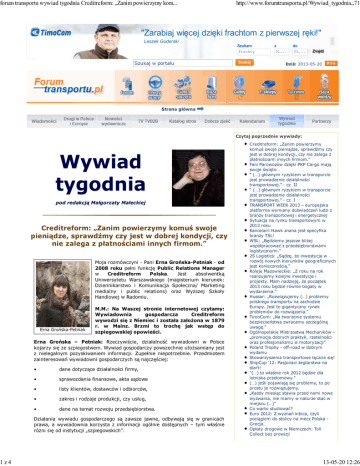 forum transportu wywiad tygodnia Creditreform: „Zanim powierzymy kom... 1z4 http://www.forumtransportu.pl/Wywiad_tygodnia,,71 "Zarabiaj więcej dzięki frachtom z pierwszej ręki!" Leszek Guderski Szukam Frachty z do Znajdź PL... Polska PL... Polska Dziś: 2013-05-20 Strona główna Czytaj poprzednie wywiady: pod redakcją Małgorzaty Małeckiej Creditreform: „Zanim powierzymy komuś swoje pieniądze, sprawdźmy czy jest w dobrej kondycji, czy nie zalega z płatnościami innych firmom.” Moja rozmówczyni - Pani Erna Grońska-Petniak - od 2008 roku pełni funkcję Public Relations Manager w Creditreform Polska. Jest absolwentką Uniwersytetu Warszawskiego (magisterium kierunek: Dziennikarstwo i Komunikacja Społeczna/ Marketing medialny i public relations) oraz Wyższej Szkoły Handlowej w Radomiu. Erna Grońska-Petniak M.M.: Na Waszej stronie internetowej czytamy: Wywiadownia gospodarcza Creditreform wywodzi się z Niemiec i została założona w 1879 r. w Mainz. Brzmi to trochę jak wstęp do szpiegowskiej opowieści. Erna Grońska – Petniak: Rzeczywiście, działalność wywiadowni w Polsce kojarzy się ze szpiegostwem. Wywiad gospodarczy powszechnie utożsamiany jest z nielegalnym pozyskiwaniem informacji. Zupełnie niepotrzebnie. Przedmiotem zainteresowań wywiadowni gospodarczych są najczęściej: • dane dotyczące działalności firmy, • sprawozdania finansowe, akta sądowe • listy klientów, dostawców i odbiorców, • zakres i rodzaje produkcji, czy usług, • dane na temat rozwoju przedsiębiorstwa. Działania wywiadu gospodarczego są zawsze jawne, odbywają się w granicach prawa, a wywiadownia korzysta z informacji ogólnie dostępnych – tym właśnie różni się od instytucji „szpiegowskich”. Creditreform: „Zanim powierzymy komuś swoje pieniądze, sprawdźmy czy jest w dobrej kondycji, czy nie zalega z płatnościami innych firmom.” Fani Parowozów dzięki PKP Cargo mają swoje święto… “ (…) głównym ryzykiem w transporcie jest prowadzenie działalności transportowej.” - cz. II “ (…) głównym ryzykiem w transporcie jest prowadzenie działalności transportowej.” - cz. I TRANSPORT WEEK 2013 – europejska platforma wymiany doświadczeń ludzi z branży transportowej i energetycznej Sytuacja na rynku transportowym w 2013 roku Kancelarii Hawk znana jest specyfika branży TSL! WSL: „Będziemy jeszcze bliżej współpracować z przedsiębiorstwami logistycznymi.” 2S Logistics: „Sądzę, że inwestycja w rozwój nowych kierunków geograficznych jest koniecznością.” Koleje Mazowieckie: „Z roku na rok realizujemy kolejne inwestycje i projekty. Mam nadzieję, że początek 2013 roku będzie równie bogaty w wydarzenia.” Hussar: „Rozwiązujemy (…) problemy polskiego transportu na zachodzie Europy. Jest to gigantyczny rynek problemów do rozwiązania.” TimoCom: „Na tworzenie systemu bezpieczeństwa zwracamy szczególną uwagę.” Ogólnopolskie Mistrzostwa Mechaników – „promocja dobrych praktyk, rzetelności oraz profesjonalizmu w motoryzacji” Poland Trophy - off-road w dobrym wydaniu Stowarzyszenia transportowe łączcie się! ShipCup '12: Pasjonaci żeglarstwa na start! "(…) to właśnie rok 2012 będzie dla lotniska przełomowy." (…) jeśli pojawiają się problemy, to po prostu je rozwiązujemy. „Każdy miesiąc stawia przed nami nowe wyzwania, nie mamy w naturze stać w miejscu (…)” Co warto studiować? Euro 2012: Z wyznań kibica, czyli pociągiem do stolicy na mecz Polska Grecja… Opłaty drogowe w Niemczech: Toll Collect bez prowizji 13-05-20 12:26 forum transportu wywiad tygodnia Creditreform: „Zanim powierzymy kom... 2z4 M.M.: Od kiedy działacie w Polsce i czy polski rynek ma jakieś cechy charakterystyczne, które różnią go od innych rynków europejskich? E.G-P.: Firma Creditreform Polska działa w Polsce już ponad 20 lat. W 2012 roku obchodziliśmy swój jubileusz. Powstała na początku lat 90’, kiedy w Polsce mogliśmy zacząć mówić o swobodzie gospodarczej. Przedsiębiorcy dostrzegli potrzebę istnienia takich usług. Creditreform Polska odwzorowała zasady działania i produkty swojej „matki” – wywiadowni Creditreform w Niemczech, która powstała w 1879 roku. Polski rynek jest jeszcze cały czas w fazie rozwoju, ciągle uczymy się od swoich sąsiadów. Przed branżą, w której działa Creditreform Polska, jest wiele do zrobienia. Polscy przedsiębiorcy nadal nieufnie podchodzą do sprawdzania siebie nawzajem – w przeciwieństwie do np. kolegów z Niemiec. M.M.: Co jest obecnie Waszą specjalności i do kogo kierujecie swoje oferty? E.G-P.: Flagowym produktem Creditreform Polska jest raport o wiarygodności płatniczej firm. Drugim filarem naszej działalności jest zarządzanie należnościami. Można powiedzieć, że opiekujemy się naszymi klientami kompleksowo – najpierw sprawdzamy potencjalnego kontrahenta, później monitorujemy spłaty należności, a w ostateczności zajmujemy się windykacją: polubowną i sądową. Oferta skierowana jest do wszystkich przedsiębiorców: małych, średnich i dużych firm, ale również do osób fizycznych, które za pośrednictwem naszego serwisu internetowego Crefo.pl mogą sprawdzić dowolny podmiot gospodarczy np. dewelopera, biuro podróży, czy pracodawcę. M.M.: Znaczącym problemem obecnie nie tylko dla branży TSL jest ściąganie należności. Jak oceniacie sytuację na rynku i czy zawsze udaje się Waszej firmie ocenić właściwie wiarygodność płatniczą kontrahenta Waszego klienta? E.G-P.: Branża transportowa, motoryzacyjna i budowlana rzeczywiście zmagają się ze wzrostem liczby niezapłaconych faktur. Ale tak naprawdę, w każdej branży aktualnie powstają zatory płatnicze. Jeżeli dostawca A nie zapłaci dostawcy B, to dostawca C nie zapłaci…itd. W ten sposób tworzy się piramida nieuregulowanych rachunków. Dlatego, tak bardzo ważna jest prewencja, o której przypominamy na każdym kroku