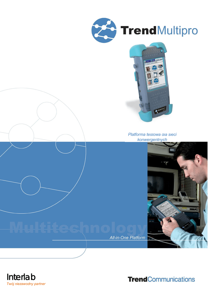 Platforma testowa dla sieci konwergentnych Interlab Twój niezawodny partner Nowa jako testów Trend Multipro jest bardzo warto ciowym narz dziem przeznaczonym do efektywnej kwalifikacji us ug oraz rozwi zywania problemów w sieciach konwergentnych. Tester daje mo liwo testowania jako ci us ug, w stopniu oczekiwanym i zadowalaj cym. Sie dostawców us ug, sprz t abonencki jak równie urz dzenia transmisyjne i koduj ce s dok adnie testowane i analizowane. Testy jako ci us ug (QoS) mog by prezentowane albo w postaci szczegu owych wyników, albo w postaci informacji typu pass/fail spe niaj cych zadane kryteria pomiarowe. Instalacje i rozwi zywanie problemów Odporna konstrukcja do pracy w terenie Trend Multipro zosta zaprojektowany z my o technikach pracuj cych cz sto w ekstremalnych warunkach. Tester posiada zasilanie bateryjne, oraz dodatkowo wzmocnion obudow . Trend Multipro jest idealnym rozwi zaniem do eksploatacji sieci konwergentnych. Nie potrzeba adnych ekstra narz dzi aby dokona pomiaru. Wystarczy tylko pod czy tester i pozwoli mu na analiz i raportowanie mo liwych problemów, czasem jeszcze zanim wp yn one na us ug . Trend Multipro jest tak e bardzo przydatny w utrzymaniu sieci, dzi ki „przep ywowemu” trybowi pracy (through mode) pozwalaj cemu na monitorowanie operacji sieciowych. Wszechstronno Nie wa ne czy warstwa fizyczna jest elektryczna czy optyczna, Trend Multipro posiada modu ow budow dzi ki której mo na dostosowa tester do du ej ilo ci interfejsów sieciowych. Dzieki budowie modu owej w ka dej chwili mo na dostosowa tester do najnowszych technologii, dok adaj c odpowiedni modu testowy. Kompleksowy i atwy w obs udze Trend Multipro posiada przyjazny graficzny interfejs u ytkownika, bazuj cy na 5,7 calowym kolorowym ekranie dotykowym wysokiej rozdzielczo ci. atwo ustawie oraz prosty sposób prezentacji wyników skraca do minimum trening w obs udze testera. Tester pozwala na zapisywanie wykonanych pomiarów oraz konfiguracji w pami ci wewn trznej, pami ci zewn trznej USB oraz karcie CF. Connectors 1 x USB port type A (Host) protected by a cover 1 x USB port type A (Host) on the side panel 1 x USB port type B (Slave) on the side panel RS-232 on 8 pin mini-DIN connector Compact Flash on the side panel Ethernet (10/100BASE-T) with VLAN function via the RJ-45 connector Microphone and headphone connectors: 3.5 mm Jack socket* Telephone handset replacement: FCC-68 4-4 connector (optional) POTS test port: RJ-11 connector (optional) Graphical User Interface 5.7” TFT colour touchscreen display with % VGA resolution (320 x 240 pixel) Remote control identical to the GUI Ergonomics Modular structure 7 LEDs situated on the front panel Genera Dimensions Mainframe: 132 x 302 x 60 mm Weight Mainframe: 1.80 kg (including battery) Battery: 7.4 V, 8.8 Ah Li-lon pack Operating Temperatur : -5 to 45 °C Storage Temperatur : -25 to +70 °C Safety EMC Emission: EN55022, EN61000-3-2 and EN61000-3-3 . Immunity: EN55024 * Only if Media board purchased Interlab Twój niezawodny partner W celu uzyskania informacji handlowych prosimy o kontakt z siedzib firmy: Interlab Sp. z o.o Ul. Kosiarzy 37 paw 20 Tel. 022-840-81-70 Fax. 022-651-83-71 [email protected] http://www.interlab.pl
