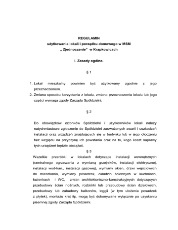 REGULAMIN użytkowania lokali i porządku domowego w MSM „ Zjednoczenie” w Krapkowicach I. Zasady ogólne. §1 1. Lokal mieszkalny powinien być użytkowany zgodnie z jego przeznaczeniem. 2. Zmiana sposobu korzystania z lokalu, zmiana przeznaczenia lokalu lub jego części wymaga zgody Zarządu Spółdzielni. §2 Do obowiązków członków Spółdzielni i użytkowników lokali należy natychmiastowe zgłoszenie do Spółdzielni zauważonych awarii i uszkodzeń instalacji oraz urządzeń znajdujących się w budynku lub w jego otoczeniu bez względu na przyczynę ich powstania oraz na to, kogo koszt naprawy tych urządzeń będzie obciążać. §3 Wszelkie przeróbki w lokalach dotyczące instalacji wewnętrznych (centralnego ogrzewania z wymianą grzejników, instalacji elektrycznej, instalacji wod-kan., instalacji gazowej), wymiany okien, drzwi wejściowych do mieszkania, wymiany posadzek, okładzin ściennych w kuchniach, łazienkach i WC, zmian architektoniczno-konstrukcyjnych dotyczących przebudowy ścian nośnych, rozbiórki lub przebudowy ścian działowych, przebudowy lub zabudowy balkonów, loggii (w tym ułożenia posadzek z płytek), montażu krat itp. mogą być dokonywane wyłącznie po uzyskaniu pisemnej zgody Zarządu Spółdzielni. §4 1. Nie wolno naprawiać poza obrębem lokalu we własnym zakresie instalacji elektrycznej w tym wymieniać bezpieczników ze względu na niebezpieczeństwo porażenia prądem oraz możliwość trwałego uszkodzenia instalacji. Kosztami z tytułu powstałych strat obciążona zostanie osoba, która je spowodowała. 2. W przypadku stwierdzenia ulatniania się gazu w godz. od 7 powszednie należy natychmiast powiadomić 00 pogotowie 00 w dni gazowe lub do 15 Spółdzielnię. Po godz. 1500 lub w dni wolne od pracy należy powiadomić osobę pełniącą dyżur pogotowia awaryjnego w Spółdzielni lub pogotowie gazowe. Numery telefonów pogotowia gazowego i pogotowia awaryjnego znajdują się w gablocie na klatkach schodowych. §5 1. Montaż oświetlenia w piwnicy indywidualnej wymaga zgody Zarządu Spółdzielni z zachowaniem warunków technicznych. 2. W celu racjonalnego zużywania energii elektrycznej nie należy pozostawiać włączonego oświetlenia w piwnicach, korytarzach piwnicznych i suszarniach. 3. Instalowanie w piwnicach indywidualnych dodatkowych punktów poboru energii elektrycznej jest zabronione. §6 1. O uszkodzeniach urządzeń i instalacji w lokalu należy niezwłocznie powiadomić Spółdzielnię lub osobę pełniącą dyżur awaryjny, w przeciwnym razie użytkownik ponosi odpowiedzialność za szkody i straty, które mogą wyniknąć wskutek awarii instalacji lub urządzeń. 2. Spółdzielnia jest uprawniona do kontrolowania i instalacji w lokalach mieszkalnych i użytkowych. 2 sprawności urządzeń §7 1. W razie awarii szkodę wywołującej lub zagrażającej bezpośrednio powstaniem szkody użytkownik lokalu jest obowiązany niezwłocznie udostępnić lokal w celu jej usunięcia. Jeżeli osoba ta jest nieobecna lub odmawia udostępnienia lokalu, Spółdzielnia ma prawo wejść do lokalu w obecności funkcjonariusza Policji, a gdy wymaga to pomocy straży pożarnej – także przy jej udziale. 2. Po wcześniejszym uzgodnieniu terminu osoba korzystająca z lokalu powinna udostępnić Spółdzielni lokal w celu: 1) przeprowadzenia planowanego remontu, 2) dokonania doraźnego okresowego, przeglądu a uzasadnionych w stanu wyposażenia wypadkach lokalu oraz również ustalenia niezbędnych prac i terminu ich wykonania, 3) wykonania operatu szacunkowego przez rzeczoznawcę majątkowego, 4) dokonania kontroli sprawności zainstalowanych w lokalu urządzeń pomiarowych po i ich zaplombowania, odczytu podzielników kosztów zakończeniu sezonu grzewczego, założenia nowych fiolek w podzielnikach kosztów przed rozpoczęciem sezonu grzewczego. §8 1. Wymagane przepisami kontrole stanu technicznego przewodów spalinowych, wentylacyjnych oraz instalacji gazowej i elektrycznej, a także odczyty podzielników kosztów po zakończeniu sezonu grzewczego i wymiana fiolek wyparkowych w podzielnikach na kolejny sezon grzewczy, muszą być poprzedzone odpowiednimi ogłoszeniami umieszczonymi na drzwiach klatki schodowej, na co najmniej 3 dni przed dokonaniem kontroli, odczytu podzielników kosztów lub wymiany fiolek w tych podzielnikach. 2. W ogłoszeniu musi być podany termin przeprowadzenia kontroli, odczytu lub wymiany fiolek. 3. W przypadku nie uzasadnionej nieobecności użytkownika lokalu, za powtórne dojście pracownika w celu dokonania kontroli, odczytu lub wymiany fiolek 3 w podzielnikach użytkownik zostanie obciążony dodatkowymi kosztami ustalonymi przez Zarząd Spółdzielni. 4. Spółdzielnia ma prawo bez uprzedniego powiadomienia, do kontroli zainstalowanych podzielników w szczególności założonych plomb, elementów mocujących i miejsca montażu podzielnika na grzejniku, sprawdzenia temperatury wewnętrznej w lokalu i nastawu głowic termostatycznych oraz kontroli wodomierzy. Nie udostępnienie lokalu w tych przypadkach, będzie stanowiło podstawę do rozliczenia jako lokal nieopomiarowany. §9 1. Samowolne wchodzenie na dach jest zabronione. 2. Montaż wszelkiego rodzaju instalacji i anten radiowych lub telewizyjnych na elewacji lub dachu budynku może być dokonywany jedynie za zgodą Zarządu Spółdzielni. II. Utrzymanie porządku, higieny i estetyki zasobów spółdzielczych. § 10 1. Wszyscy mieszkańcy zasobów spółdzielczych zobowiązani są do utrzymania czystości na klatkach schodowych, piwnicach, suszarniach, strychach i terenach przydomowych. Wszelkie zanieczyszczenia pomieszczeń wspólnego użytku powstałe podczas remontu, użytkownik obowiązany jest usunąć niezwłocznie we własnym zakresie. 2. Zabrania się umieszczania na elewacji budynku reklam, ogłoszeń bez uzyskania zgody Spółdzielni. 3. Zabrania się wyrzucać przez okno jakichkolwiek śmieci, niedopałków papierosów, resztek je
