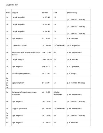 Zajęcia z BO klasa zajęcia termin sala 1a śr. 13:45 23 Język angielski prowadzący p. J. Jamróz - Haładyj 1b Język angielski śr. 12:50 26 p. J. Jamróz - Haładyj 1c Język angielski śr. 14:40 23 p. J. Jamróz - Haładyj 1d Jęz. angielski śr. 7:45 17 p. K. Tomaka 2a Zajęcia ruchowe pt. 14:40 17/podwórko p. R. Rogaliński 2b Podstawy gier zespołowych – uni czw. 13:45 hokey Ms p. M. Nesterowicz 2c Język rosyjski pon. 15:30 27 p. A. Myszka 2d Jęz. angielski pon. 8:00 17 p. J. Ogorzelec 2e Akrobatyka sportowa wt. 12:50 sił. p. A. Krupa 2a 2b 2c 2d 2e Język angielski śr. 15:30 15 p. J. Jamróz - Haładyj Relaksacja/zajęcia sportoworuchowe pt. 9:50 Szkoła podwórko p. M. Nesterowicz 3b Jęz. angielski wt. 14:40 24 p. J. Jamróz - Haładyj 3c Zajęcia sportowe pt. 14:40 15/podwórko p. M. Nesterowicz 3a 3b 3c Jęz. angielski wt. 15:30 24 p. J. Jamróz - Haładyj 4a Jęz. angielski pt. 13:45 25 p. E. Mleczko 3a 4b Jęz. angielski pt. 13:45 27 p. S. Czekaj 5a Matematyka pon. 14:40 23 p. A. Kaniecka 5b Zabawy sportowo-logiczne śr. 13:45 Ms p. P. Łyczko 5c Programowanie wt. 15:30 29 p. B. Sowa 6a Gimnastyka korekcyjna pt. 13:45 sił p. K. Jarosz 6b Zajęcia teatralne śr. 13:45 21 p. M. Konatowicz 6c Zajęcia literacko-dziennikarskie pt. 8:00 26 p. M. Krzywda