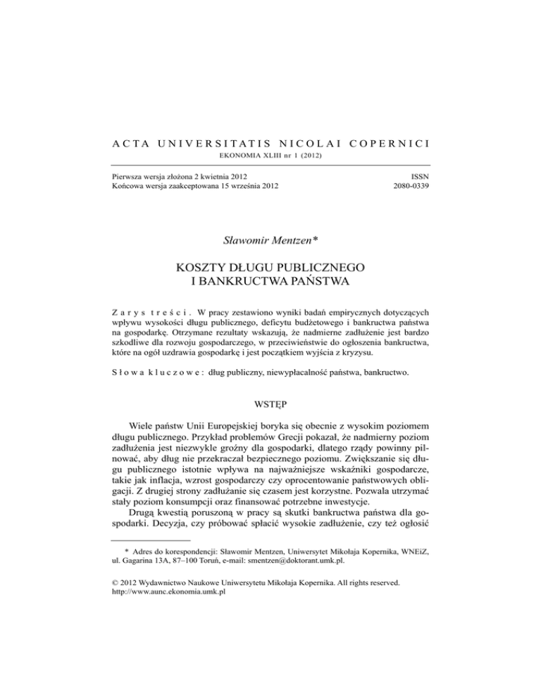A C TA U N I V E R S I TAT I S N I C O L A I C O P E R N I C I EKONOMIA XLIII n r 1 (2012) Pierwsza wersja złożona 2 kwietnia 2012 Końcowa wersja zaakceptowana 15 września 2012 ISSN 2080-0339 Sławomir Mentzen* KOSZTY DŁUGU PUBLICZNEGO I BANKRUCTWA PAŃSTWA Z a r y s t r e ś c i . W pracy zestawiono wyniki badań empirycznych dotyczących wpływu wysokości długu publicznego, deficytu budżetowego i bankructwa państwa na gospodarkę. Otrzymane rezultaty wskazują, że nadmierne zadłużenie jest bardzo szkodliwe dla rozwoju gospodarczego, w przeciwieństwie do ogłoszenia bankructwa, które na ogół uzdrawia gospodarkę i jest początkiem wyjścia z kryzysu. S ł o w a k l u c z o w e : dług publiczny, niewypłacalność państwa, bankructwo. WSTĘP Wiele państw Unii Europejskiej boryka się obecnie z wysokim poziomem długu publicznego. Przykład problemów Grecji pokazał, że nadmierny poziom zadłużenia jest niezwykle groźny dla gospodarki, dlatego rządy powinny pilnować, aby dług nie przekraczał bezpiecznego poziomu. Zwiększanie się długu publicznego istotnie wpływa na najważniejsze wskaźniki gospodarcze, takie jak inflacja, wzrost gospodarczy czy oprocentowanie państwowych obligacji. Z drugiej strony zadłużanie się czasem jest korzystne. Pozwala utrzymać stały poziom konsumpcji oraz finansować potrzebne inwestycje. Drugą kwestią poruszoną w pracy są skutki bankructwa państwa dla gospodarki. Decyzja, czy próbować spłacić wysokie zadłużenie, czy też ogłosić * Adres do korespondencji: Sławomir Mentzen, Uniwersytet Mikołaja Kopernika, WNEiZ, ul. Gagarina 13A, 87–100 Toruń, e-mail: [email protected]. © 2012 Wydawnictwo Naukowe Uniwersytetu Mikołaja Kopernika. All rights reserved. http://www.aunc.ekonomia.umk.pl 78 Sławomir Mentzen niewypłacalność, może mieć niezwykle ważne konsekwencje dla przyszłości gospodarki krajowej. Z jednej strony spłacanie bardzo wysokiego długu może doprowadzić do wieloletniej stagnacji gospodarczej wynikającej z nałożenia wysokich podatków niezbędnych do obsługi długu. Z drugiej strony odmowa spłaty zadłużenia może wiązać się z utratą przez państwo reputacji oraz problemami co do możliwości zaciągania długu w przyszłości. Celem pracy jest prezentacja dotychczasowych wyników badań dotyczących konsekwencji zwiększania długu publicznego oraz bankructwa państwa. W sytuacji podobnej do tej, w której niedawno znalazła się Grecja, rządzący muszą wiedzieć, jakie skutki przyniesie ogłoszenie bankructwa, a jakie próba obsługi ogromnego długu lub nawet jego dalsze zwiększanie. Wiedza ta jest niezbędna do podjęcia racjonalnej decyzji dotyczącej przyszłości długu. 1. WPŁYW ZADŁUŻENIA NA GOSPODARKĘ 1.1. WPŁYW ZADŁUŻENIA NA PKB I INFLACJĘ Najpoważniejszą konsekwencją wzrostu zadłużenia może być ograniczenie wzrostu gospodarczego i wzrost inflacji. Negatywny wpływ zadłużenia na wzrost gospodarczy został opisany w klasycznej pracy Barro (1979). Obsługa rosnącego długu publicznego wymaga zwiększenia podatków lub ograniczenia wydatków rządowych. Zarówno jedno, jak i drugie wiąże się ze zmniejszeniem wzrostu gospodarczego. W ciągu ostatnich trzech lat wielu autorów podjęło próby oszacowania zależności wzrostu PKB od wysokości długu publicznego. Pierwsze badanie, będące dla kolejnych autorów punktem odniesienia, zostało opisane w pracy Reinhart, Rogoff (2010). Autorzy przeanalizowali dane dla 44 państw z ostatnich 200 lat. Dzięki temu otrzymali około 3700 rocznych obserwacji, tym cenniejszych, że zebranych w najróżniejszych systemach politycznych i różnych momentach dziejowych. Osobno dokonano analizy dla krajów rozwijających się i rozwiniętych, ponieważ te drugie dzięki wyższemu rozwojowi gospodarczemu mogą sobie pozwolić na finansowanie znacznie wyższego zadłużenia, dlatego dług będzie miał mniejszy wpływ na dynamikę ich gospodarek. Autorzy policzyli średni i medianowy wzrost gospodarczy dla państw o zadłużeniu poniżej 30% PKB, w przedziałach pomiędzy 30 a 60% PKB, 60 a 90% PKB oraz powyżej 90% PKB. Okazało się, że w przypadku państw rozwiniętych gospodarczo wysokość wzrostu gospodarczego nie ma związku z wysokością relacji długu do PKB dla zadłużenia poniżej 90% PKB. Po prze- ACTA UNIVERSITATIS NICOLAI COPERNICI, EKONOMIA XLIII nr 1 (2012) 77–89 Koszty długu publicznego i bankructwa państwa 79 kroczeniu tej granicy średni wzrost gospodarczy spada o około 4 punkty procentowe w stosunku do państw znajdujących się w przedziale o najniższym długu, a medianowy wzrost jest niższy o ponad 1%. Badanie pokazało też, że nie obserwuje się równoczesnego wzrostu inflacji i zmniejszenia dynamiki PKB w wyniku pojawienia się wysokiego zadłużenia państwa. W przypadku państw rozwijających się wyniki są podobne. Zauważalne zmniejszenie się wzrostu gospodarczego następuje dopiero po przekroczeniu granicy 90% PKB. Spadek średniego wzrostu PKB wynosi ponad 3 p.p., a spadek medianowego wzrostu 1,5 p.p. Inaczej niż dla krajów rozwiniętych zachowuje się inflacja. Stale rośnie wraz ze wzrostem zadłużenia, jest o ponad 10 p.p. wyższa dla państw o zadłużeniu powyżej 90% niż dla tych o relacji długu do PKB poniżej 30%. Osobno przeanalizowano wpływ na wzrost gospodarczy zadłużenia zagranicznego, traktowanego jak suma zadłużenia zagranicznego publicznego i prywatnego. Ograniczenie dynamiki wzrostu gospodarczego można zaobserwować już po przekroczeniu granicy zadłużenie w wysokości 60% PKB. Średni wzrost gospodarczy zmniejsza się wtedy o ponad 2,5 p.p., a medianowy wzrost o 1 p.p. Gdy relacja zadłużenia zagranicznego do PKB przekracza 90%, średni wzrost spada o kolejne 2,5 p.p. i staje się ujemny, medianowy wzrost PKB zmniejsza się o 1 p.p., a średnia inflacja rośnie o prawie 4 p.p. Fucceri i Zdzienicka (2012, s. 736) w badaniu obejmującym 154 pańs