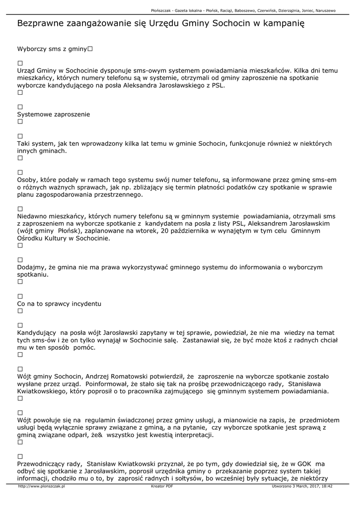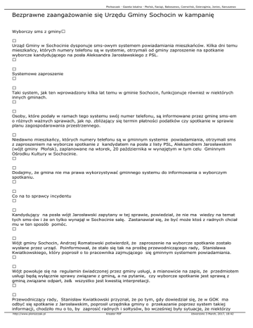 Płońszczak - Gazeta lokalna - Płońsk, Raciąż, Baboszewo, Czerwińsk, Dzierzążnia, Joniec, Naruszewo Bezprawne zaangażowanie się Urzędu Gminy Sochocin w kampanię Wyborczy sms z gminy Urząd Gminy w Sochocinie dysponuje sms-owym systemem powiadamiania mieszkańców. Kilka dni temu mieszkańcy, których numery telefonu są w systemie, otrzymali od gminy zaproszenie na spotkanie wyborcze kandydującego na posła Aleksandra Jarosławskiego z PSL. Systemowe zaproszenie Taki system, jak ten wprowadzony kilka lat temu w gminie Sochocin, funkcjonuje również w niektórych innych gminach. Osoby, które podały w ramach tego systemu swój numer telefonu, są informowane przez gminę sms-em o różnych ważnych sprawach, jak np. zbliżający się termin płatności podatków czy spotkanie w sprawie planu zagospodarowania przestrzennego. Niedawno mieszkańcy, których numery telefonu są w gminnym systemie powiadamiania, otrzymali sms z zaproszeniem na wyborcze spotkanie z kandydatem na posła z listy PSL, Aleksandrem Jarosławskim (wójt gminy Płońsk), zaplanowane na wtorek, 20 października w wynajętym w tym celu Gminnym Ośrodku Kultury w Sochocinie. Dodajmy, że gmina nie ma prawa wykorzystywać gminnego systemu do informowania o wyborczym spotkaniu. Co na to sprawcy incydentu Kandydujący na posła wójt Jarosławski zapytany w tej sprawie, powiedział, że nie ma wiedzy na temat tych sms-ów i że on tylko wynajął w Sochocinie salę. Zastanawiał się, że być może ktoś z radnych chciał mu w ten sposób pomóc. Wójt gminy Sochocin, Andrzej Romatowski potwierdził, że zaproszenie na wyborcze spotkanie zostało wysłane przez urząd. Poinformował, że stało się tak na prośbę przewodniczącego rady, Stanisława Kwiatkowskiego, który poprosił o to pracownika zajmującego się gminnym systemem powiadamiania. Wójt powołuje się na regulamin świadczonej przez gminy usługi, a mianowicie na zapis, że przedmiotem usługi będą wyłącznie sprawy związane z gminą, a na pytanie, czy wyborcze spotkanie jest sprawą z gminą związane odparł, że& wszystko jest kwestią interpretacji. Przewodniczący rady, Stanisław Kwiatkowski przyznał, że po tym, gdy dowiedział się, że w GOK ma odbyć się spotkanie z Jarosławskim, poprosił urzędnika gminy o przekazanie poprzez system takiej informacji, chodziło mu o to, by zaprosić radnych i sołtysów, bo wcześniej były sytuacje, że niektórzy http://www.plonszczak.pl Kreator PDF Utworzono 3 March, 2017, 18:42 Płońszczak - Gazeta lokalna - Płońsk, Raciąż, Baboszewo, Czerwińsk, Dzierzążnia, Joniec, Naruszewo mieli pretensje, iż nie wiedzą o różnych spotkaniach. - Uważałem, że należy o takim spotkaniu powiadomić - powiedział przewodniczący, którego zdaniem spotkanie wyborcze jest sprawą gminy, bo mieszkańcy są przecież wyborcami. PKW - gmina nie może Biuro prasowe Państwowej Komisji Wyborczej poinformowało, że gmina nie może używać środków publicznych, a za takie środki musi być prowadzony system powiadamiania, do prowadzenia w jakikolwiek sposób kampanii wyborczej. Zakaz ten jednakże wynika nie z kodeksu wyborczego, ale przepisów regulujących zadania własne gminy. Biuro prasowe PKW podkreśla, iż gmina nie może wykorzystywać urzędowego systemu powiadamiania do informowania mieszkańców o spotkaniu wyborczym. Katarzyna Olszewska http://www.plonszczak.pl Kreator PDF Utworzono 3 March, 2017, 18:42