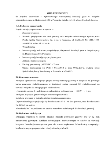 OPIS TECHNICZNY do projektu budowlano – wykonawczego wewnętrznej instalacji gazu w budynku mieszkalnym przy ul. Bukowskiej 328 w Poznaniu, działka nr 148, arkusz 04, obręb Ławica. 1.0. Podstawa opracowania Projekt niniejszy opracowano w oparciu o: - Zlecenie Inwestora - Warunki przyłączenia do sieci gazowej śr/c budynku mieszkalnego wydane przez Polską Spółkę Gazownictwa Sp. z o.o. w Poznaniu, ul. Grobka 15 Nr: ODK-4100103303/14 z dnia 18.11.2014r. - Wizję lokalną - Inwentaryzację budowlaną uzupełniającą dla potrzeb instalacji gazu w budynku przy ul. Bukowskiej 328 w Poznaniu - Inwentaryzację istniejącego przyłącza gazu - Aktualne normy i przepisy - Katalog gazomierzy „METRIX” – Tczew - Opinię kominiarską Nr P-III / 0666/2014 z dnia 09.12.2014r. wydaną przez Spółdzielnię Pracy Kominiarzy w Poznaniu ul. Górki 13. 2.0 Zakres opracowania Niniejsze opracowanie obejmuje projekt nowej instalacji gazowej w budynku od głównego kurka gazowego zlokalizowanego w istniejącej szafce gazowej SG zlokalizowanej na elewacji budynku do następujących odbiorników: - kuchenka gazowa 4 – palnikowa z piekarnikiem elektrycznym 11 kW - 4 szt. Istniejące przyłącze gazowe nie jest tematem opracowania. Instalacja grzewcza w budynku nie jest tematem opracowania. Doprowadzenie gazu projektuje się do mieszkania Nr 1 i Nr 2 na parterze, oraz do mieszkania Nr 4 i Nr 5 na piętrze. Mieszkanie Nr 7 na poddaszu nie spełnia warunków technicznych dla instalacji gazowej. 3.0 Opis stanu istniejącego Istniejący budynek w chwili obecnej posiada przyłącze gazowe śr/c Ø 32 mm zakończone głównym kurkiem odcinającym umieszczonym w szafce na elewacji budynku. Instalacja wewnętrzna gazu nie została wykonana. Mieszkańcy korzystają z kuchenek na gaz propan-butan z indywidualnych butli. 4.0 Rozwiązanie projektowe W istniejącym budynku mieszkalnym przy ul. Bukowskiej 328 w Poznaniu zaprojektowano nową instalację gazową od głównego kurka gazowego do odbiorników. W istniejącej szafce zamontować reduktor gazu Ø 32 mm o wydajności Q=10m3/h. Główny poziomy przewód gazowy prowadzony jest pod stropem klatki schodowej parteru do pionu G1 i G2. Z pionów gaz zostaje doprowadzony do gazomierzy zlokalizowanych na klatce schodowej i następnie zostaje wprowadzony do mieszkań do kuchenek gazowych. Jako odbiorniki gazu projektuje się w każdym mieszkaniu kuchenkę gazową 4-palnikową z piekarnikiem elektrycznym. Pomiar gazu przez gazomierze mieszkaniowe miechowe G 1,6 Qnom = 1,6 m3/h - Metrix Instalację gazową wykonać z rur i kształtek miedzianych wg PN-EN 1057: 1999 Miedź i stopy miedzi. Rury miedziane bez szwu do wody i gazu stosowane w instalacjach sanitarnych. Połączenia rur w systemie połączeń zaprasowywanych do instalacji gazowych z miedzi typ Profipress G. Jako armaturę odcinającą zastosować zawory kulowe gazowe. Przewody prowadzić po ścianach wewnętrznych w odległości 2 cm od tynku w przepisowych odległościach od innych instalacji ze spadkiem i = 4 ‰ w kierunku przyborów gazowych. Przejścia przez stropy i ściany wykonać w rurach ochronnych, uszczelnionych szczeliwem elastycznym. Gazomierze połączyć z rurociągami za pomocą połączeń gwintowanych. Połączenie powinno być wolne od naprężeń i mieć możliwość regulacji rozstawienia przyłączy. Instalację gazową zabezpieczyć antykorozyjnie przez pomalowanie zgodnie z instrukcją KOR-3A w kolorze żółtym. Wszystkie instalacje gazowe na propan-butan należy bezwzględnie zdemontować. Po wykonaniu instalacji gazowej należy sprawdzić jej szczelność dwukrotnie, raz przez Wykonawcę, a drugi raz w obecności przedstawiciela PSG sp. z o.o. Sprawdzenie polega na: a) kontroli zgodności wykonania z projektem, b) kontroli szczelności przewodów i połączenia z przyborami gazowymi, c) kontroli jakości wykonania. 5.0 Obliczenia Obliczenia zapotrzebowania gazu wykonano w oparciu o następujące założenia: - gaz ziemny zaazotowany GZ-50 - kuchenka gazowa 4– palnikowa z piekarnikiem elektr, -1,3 m3/h , 11 kW Zapotrzebowanie gazu przez budynek 44 m3/h Liczba odbiorców 4 Współczynnik jednoczesności rozbioru gazu 0,486 Współczynnik K dla gazu ziemnego 1,095 - 4 szt. 3 Qmax = 1,3 x 4 x 0,486 x 1,095 = 2,77 m /h Istniejące przyłącze gazu Dn 32 mm jest wystarczające. 6.0 Wentylacja pomieszczeń Wentylacja pomieszczeń grawitacyjna. Nawiew przez infiltrację oraz rozszczelniane okna. Wywiew przez istniejące kanały murowane 14 x 14 cm. 6.1 Wytyczne dla wentylacji pomieszczeń W oparciu o opinię kominiarską, wizję lokalną, oraz dodatkową konsultację z autorem opinii – mistrzem kominiarskim projektuje się następujące rozwiązanie wentylacji: Mieszkanie Nr 1 - odłączyć rurę pochłaniacza od kanału Nr 1 w Gr. I - zamontować kratkę w kuchni pod stropem i połączyć ją kanałem z bl. stal. oc. 14x14 cm z kanałem Nr 1 w Gr. I - zamontować kratkę w łazience pod stropem na kanale Nr 4 w Gr. I (kanał wywiewny wspólny z łazienką mieszkania Nr 5 na piętrze) Mieszkanie Nr 2 - odłączyć kominek od kanału Nr 4 w Gr. II - zamontować kratkę w kuchni pod stropem i połączyć ją kanałem z bl. stal. oc. 14x14 cm z kanałem Nr 3 w Gr. II (kanał wywiewny wspólny z kuchnią mieszkania Nr 4 na piętrze) - zamurować wentylację z pokoju w kanale Nr 3 w Gr. II - zlikwidować wentylator wywiewny z łazienki w kanale Nr 2 Gr II i zamontować kratkę (kanał wywiewny wspólny z łazienką mieszkania Nr 4 na piętrze) Mieszkanie Nr 4 - zamontować kratkę w kuchni pod stropem i połączyć ją kanałem z bl. stal. oc. 14x14 cm z kanałem Nr 3 w Gr. II (kanał wywiewny wspólny z kuchnią mieszkania Nr 2 na parterze - zamontować kratkę w łazience pod stropem na kanale 2 w Gr. II (kanał wywiewny wspólny z łazienką mieszkania Nr 2 na parterze) - zamontować kratkę nawiewną do kuchni pod parapetem okna o wym. 20x14 cm Mieszkanie Nr 5 - zamontować kratkę 