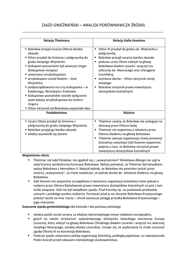 ZJAZD GNIEŹNIEOSKI – ANALIZA PORÓWNAWCZA ŹRÓDEŁ __________________________________________________________________________________ Relacja Thietmara Relacja Galla Anonima Bolesław przyjął cesarza Ottona bardzo okazale Otton przybył do Gniezna z pielgrzymką do grobu świętego Wojciecha biskupem poznaoskim był wówczas Unger (biskupstwo misyjne) utworzono arcybiskupstwo arcybiskupem został Radzim – brat Wojciecha podporządkowano mu trzy biskupstwa – w Kołobrzegu, Wrocławiu i Krakowie biskupstwo poznaoskie zostało wyłączone spod władzy arcybiskupstwa do śmierci Ungera Otton otrzymał od Bolesława wspaniałe dary Podobieństwa Otton III przybył do grobu św. Wojciecha z pielgrzymką Bolesław przyjął cesarza bardzo okazale podczas uczty Otton nałożył na głowę Bolesława diadem cesarki i wręczył mu włócznię św. Maurycego oraz chorągiew triumfalną wymiana darów – Otton otrzymał ramię świętego Bolesław otrzymał prawo inwestytury dostojników kościelnych Cesarz Otton przybył do Gniezna z pielgrzymką do grobu świętego Wojciecha Bolesław przyjął go bardzo okazale władcy wymienili się darami Thietmar uważa, że Bolesław nie zasługuje na okazaną przez Ottona łaskę Thietmar nie wspomina o włożeniu przez Ottona diademu na głowę Bolesława Thietmar opisuje organizację nowej prowincji kościelnej natomiast Gall Anonim wspomina jedynie o tym, że Bolesław otrzymał prawo inwestytury dostojników kościelnych Różnice Wyjaśnienie różnic Thietmar nie lubił Polaków; nie zgadzał się z „wywyższeniem” Bolesława dlatego nie ujął w swej kronice symbolicznej koronacji Bolesława. Należy pamiętad, że Thietmar był świadkiem wojny Bolesława z Henrykiem II. Napisał jednak, że Bolesław nie powinien zostad przez cesarza „wywyższony”, co może świadczyd, ze jednak doszło do włożenia diademu na głowę Bolesława. Gall Anonim nie wspomina szczegółowo o tworzeniu organizacji kościelnej mówi jednak o nadaniu przez Ottona Bolesławowi prawa inwestytury dostojników kościelnych co jest z tym ściśle związane. Gall nie był świadkiem zjazdu. Pisał kronikę np. na podstawie przekazów ustnych z polskiego punktu widzenia. Ponieważ pisał ja na zlecenie Bolesława Krzywoustego położył nacisk na inne rzeczy – chciał zaznaczyd potęgę przodka Bolesława Krzywoustego i jego znaczenie. Znaczenie zjazdu gnieźnieńskiego dla Kościoła i dla paostwa polskiego władca polski został uznany za władcę równorzędnego innym władcom europejskim, gościł na swoim terytorium najważniejszego dostojnika świeckiego ówczesnej Europy (cesarza), który włożył na głowę Bolesława Chrobrego diadem cesarski i wręczył mu włócznię świętego Maurycego, oznakę władzy cesarskiej. Uznaje się, że wydarzenie to miało oznaczad zgodę Ottona III na koronację Bolesława. Podczas zjazdu utworzono polską organizację kościelną, podległą papieżowi, co zabezpieczało Polski Kościół przed zakusami niemieckiego duchowieostwa.