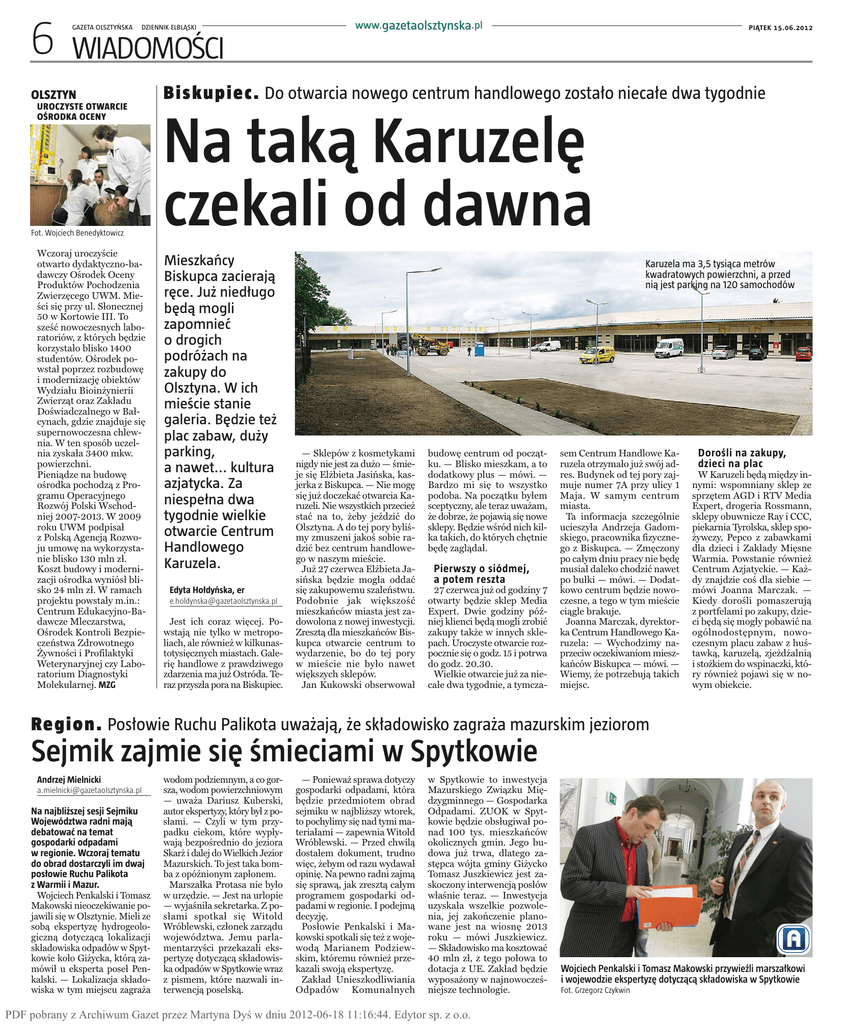 6 GAZETA OLSZTYŃSKA DZIENNIK ELBLĄSKI www.gazetaolsztynska.pl PIĄTEK 15.06.2012 WIADOMOŚCI OLSZTYN UROCZYSTE OTWARCIE OŚRODKA OCENY Fot. Wojciech Benedyktowicz Wczoraj uroczyście otwarto dydaktyczno-badawczy Ośrodek Oceny Produktów Pochodzenia Zwierzęcego UWM. Mieści się przy ul. Słonecznej 50 w Kortowie III. To sześć nowoczesnych laboratoriów, z których będzie korzystało blisko 1400 studentów. Ośrodek powstał poprzez rozbudowę i modernizację obiektów Wydziału Bioinżynierii Zwierząt oraz Zakładu Doświadczalnego w Bałcynach, gdzie znajduje się supernowoczesna chlewnia. W ten sposób uczelnia zyskała 3400 mkw. powierzchni. Pieniądze na budowę ośrodka pochodzą z Programu Operacyjnego Rozwój Polski Wschodniej 2007-2013. W 2009 roku UWM podpisał z Polską Agencją Rozwoju umowę na wykorzystanie blisko 130 mln zł. Koszt budowy i modernizacji ośrodka wyniósł blisko 24 mln zł. W ramach projektu powstały m.in.: Centrum Edukacyjno-Badawcze Mleczarstwa, Ośrodek Kontroli Bezpieczeństwa Zdrowotnego Żywności i Profilaktyki Weterynaryjnej czy Laboratorium Diagnostyki Molekularnej. MZG B i skupi e c . Do otwarcia nowego centrum handlowego zostało niecałe dwa tygodnie Na taką Karuzelę czekali od dawna Mieszkańcy Biskupca zacierają ręce. Już niedługo będą mogli zapomnieć o drogich podróżach na zakupy do Olsztyna. W ich mieście stanie galeria. Będzie też plac zabaw, duży parking, a nawet... kultura azjatycka. Za niespełna dwa tygodnie wielkie otwarcie Centrum Handlowego Karuzela. Edyta Hołdyńska, er [email protected] Jest ich coraz więcej. Powstają nie tylko w metropoliach, ale również w kilkunastotysięcznych miastach. Galerię handlowe z prawdziwego zdarzenia ma już Ostróda. Teraz przyszła pora na Biskupiec. Karuzela ma 3,5 tysiąca metrów kwadratowych powierzchni, a przed nią jest parking na 120 samochodów — Sklepów z kosmetykami nigdy nie jest za dużo — śmieje się Elżbieta Jasińska, kasjerka z Biskupca. — Nie mogę się już doczekać otwarcia Karuzeli. Nie wszystkich przecież stać na to, żeby jeździć do Olsztyna. A do tej pory byliśmy zmuszeni jakoś sobie radzić bez centrum handlowego w naszym mieście. Już 27 czerwca Elżbieta Jasińska będzie mogła oddać się zakupowemu szaleństwu. Podobnie jak większość mieszkańców miasta jest zadowolona z nowej inwestycji. Zresztą dla mieszkańców Biskupca otwarcie centrum to wydarzenie, bo do tej pory w mieście nie było nawet większych sklepów. Jan Kukowski obserwował budowę centrum od początku. — Blisko mieszkam, a to dodatkowy plus — mówi. — Bardzo mi się to wszystko podoba. Na początku byłem sceptyczny, ale teraz uważam, że dobrze, że pojawią się nowe sklepy. Będzie wśród nich kilka takich, do których chętnie będę zaglądał. Pierwszy o siódmej, a potem reszta 27 czerwca już od godziny 7 otwarty będzie sklep Media Expert. Dwie godziny później klienci będą mogli zrobić zakupy także w innych sklepach. Uroczyste otwarcie rozpocznie się o godz. 15 i potrwa do godz. 20.30. Wielkie otwarcie już za niecałe dwa tygodnie, a tymcza- sem Centrum Handlowe Karuzela otrzymało już swój adres. Budynek od tej pory zajmuje numer 7A przy ulicy 1 Maja. W samym centrum miasta. Ta informacja szczególnie ucieszyła Andrzeja Gadomskiego, pracownika fizycznego z Biskupca. — Zmęczony po całym dniu pracy nie będę musiał daleko chodzić nawet po bułki — mówi. — Dodatkowo centrum będzie nowoczesne, a tego w tym mieście ciągle brakuje. Joanna Marczak, dyrektorka Centrum Handlowego Karuzela: — Wychodzimy naprzeciw oczekiwaniom mieszkańców Biskupca — mówi. — Wiemy, że potrzebują takich miejsc. Dorośli na zakupy, dzieci na plac W Karuzeli będą między innymi: wspomniany sklep ze sprzętem AGD i RTV Media Expert, drogeria Rossmann, sklepy obuwnicze Ray i CCC, piekarnia Tyrolska, sklep spożywczy, Pepco z zabawkami dla dzieci i Zakłady Mięsne Warmia. Powstanie również Centrum Azjatyckie. — Każdy znajdzie coś dla siebie — mówi Joanna Marczak. — Kiedy dorośli pomaszerują z portfelami po zakupy, dzieci będą się mogły pobawić na ogólnodostępnym, nowoczesnym placu zabaw z huśtawką, karuzelą, zjeżdżalnią i stożkiem do wspinaczki, który również pojawi się w nowym obiekcie. Region . Posłowie Ruchu Palikota uważają, że składowisko zagraża mazurskim jeziorom Sejmik zajmie się śmieciami w Spytkowie Andrzej Mielnicki [email protected] Na najbliższej sesji Sejmiku Województwa radni mają debatować na temat gospodarki odpadami w regionie. Wczoraj tematu do obrad dostarczyli im dwaj posłowie Ruchu Palikota z Warmii i Mazur. Wojciech Penkalski i Tomasz Makowski nieoczekiwanie pojawili się w Olsztynie. Mieli ze sobą ekspertyzę hydrogeologiczną dotyczącą lokalizacji składowiska odpadów w Spytkowie koło Giżycka, którą zamówił u eksperta poseł Penkalski. — Lokalizacja składowiska w tym miejscu zagraża wodom podziemnym, a co gorsza, wodom powierzchniowym — uważa Dariusz Kuberski, autor ekspertyzy, który był z posłami. — Czyli w tym przypadku ciekom, które wypływają bezpośrednio do jeziora Skarż i dalej do Wielkich Jezior Mazurskich. To jest taka bomba z opóźnionym zapłonem. Marszałka Protasa nie było w urzędzie. — Jest na urlopie — wyjaśniła sekretarka. Z posłami spotkał się Witold Wróblewski, członek zarządu województwa. Jemu parlamentarzyści przekazali ekspertyzę dotyczącą składowiska odpadów w Spytkowie wraz z pismem, które nazwali interwencją poselską. — Ponieważ sprawa dotyczy gospodarki odpadami, która będzie przedmiotem obrad sejmiku w najbliższy wtorek, to pochylimy się nad tymi materiałami — zapewnia Witold Wróblewski. — Przed chwilą dostałem dokument, trudno więc, żebym od razu wydawał opinię. Na pewno radni zajmą się sprawą, jak zresztą całym programem gospodarki odpadami w regionie. I podejmą