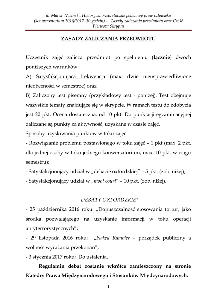 dr Marek Wasiński, Historyczno-teoretyczne podstawy praw człowieka (konwersatorium 2016/2017, 30 godzin) – Zasady zaliczania przedmiotu oraz Część Pierwsza Skryptu ZASADY ZALICZANIA PRZEDMIOTU Uczestnik zajęć zalicza przedmiot po spełnieniu (łącznie) dwóch poniższych warunków: A) Satysfakcjonująca frekwencja (max. dwie nieusprawiedliwione nieobecności w semestrze) oraz B) Zaliczony test pisemny (przykładowy test - poniżej). Test obejmuje wszystkie tematy znajdujące się w skrypcie. W ramach testu do zdobycia jest 20 pkt. Ocena dostateczna: od 10 pkt. Do punktacji egzaminacyjnej zaliczane są punkty za aktywność, uzyskane w czasie zajęć. Sposoby uzyskiwania punktów w toku zajęć: - Rozwiązanie problemu postawionego w toku zajęć – 1 pkt (max. 2 pkt. dla jednej osoby w toku jednego konwersatorium, max. 10 pkt. w ciągu semestru); - Satysfakcjonujący udział w „debacie oxfordzkiej” – 5 pkt. (zob. niżej); - Satysfakcjonujący udział w „moot court” – 10 pkt. (zob. niżej). "DEBATY OXFORDZKIE" - 25 października 2016 roku: „Dopuszczalność stosowania tortur, jako środka pozwalającego na uzyskanie informacji w toku operacji antyterrorystycznych”; - 29 listopada 2016 roku: „Naked Rambler – porządek publiczny a wolność wyrażania przekonań”; - 3 stycznia 2017 roku: Do ustalenia. Regulamin debat zostanie wkrótce zamieszczony na stronie Katedry Prawa Międzynarodowego i Stosunków Międzynarodowych. 1 dr Marek Wasiński, Historyczno-teoretyczne podstawy praw człowieka (konwersatorium 2016/2017, 30 godzin) – Zasady zaliczania przedmiotu oraz Część Pierwsza Skryptu MOOT COURTS Symulacja rozprawy przed Europejskim Trybunałem Praw Człowieka w Strasburgu. - 10 stycznia 2017 roku, - 17 stycznia 2017 roku. Tematy, materiały oraz regulamin zostaną wkrótce zamieszczone na stronie Katedry Prawa Międzynarodowego i Stosunków Międzynarodowych. PRZYKŁADOWY TEST (imię i nazwisko oraz nr indeksu) (gwiazdka (*) oznacza, że w danym pytaniu wchodzi w grę wybór więcej niż jednej odpowiedzi, tzn. poprawne mogą być: jedna, dwie bądź więcej odpowiedzi. W pytaniach nieoznaczonych gwiazdką, poprawna jest zawsze tylko jedna odpowiedź. Prawa człowieka to: (a) wszelkie prawa przyznane jednostce na gruncie prawa krajowego; (b) wszelkie prawa przyznane jednostce na gruncie prawa międzynarodowego; (c) prawa chroniące powszechnie uznane dobra, zagwarantowane przez prawo pozytywne i związane z przyrodzoną godnością człowieka; (d) wyłącznie prawa określone w Powszechnej Deklaracji Praw Człowieka z 1948 roku. Europejski Trybunał Praw Człowieka w swoim orzecznictwie: (a) bezwzględnie wyklucza możliwość relatywizacji ochrony praw człowieka ze względu na np. kontekst kulturowy; (b) dopuszcza możliwość relatywizacji ochrony praw człowieka ze względu na np. kontekst kulturowy, stosując m. in. koncepcję marginesu oceny. (*) Proszę wskazać poprawne odpowiedzi dotyczące tzw. koncepcji marginesu oceny (margin of appreciation): (a) nie może być ona stosowana do pewnych praw gwarantowanych w Konwencji Europejskiej (np. wolności od tortur); (b) szerszy zakres marginesu oceny istnieje w odniesieniu do tzw. zobowiązań 2 dr Marek Wasiński, Historyczno-teoretyczne podstawy praw człowieka (konwersatorium 2016/2017, 30 godzin) – Zasady zaliczania przedmiotu oraz Część Pierwsza Skryptu pozytywnych państwa; (c) na zakres marginesu oceny ma wpływ brak „wspólnego podejścia” do danego problemu w ustawodawstwie państw członkowskich. Prawo do życia jest prawem należącym do generacji: (a) pierwszej; (b) drugiej; (c) trzeciej; (d) czwartej. Z ratyfikowanego przez Polskę traktatu (opublikowanego w Dzienniku Ustaw) wynika, że państwa „uznają, że należy udzielić jak najszerszej ochrony i pomocy rodzinie”. To postanowienie nie może stanowić podstawy dochodzenia przed sądem polskim przez jednostkę prawa do zasiłku socjalnego, ponieważ: (a) powołana regulacja nie jest samowykonalna (m. in. dlatego, że nie jest dostatecznie jasna i precyzyjna); (b) prawa człowieka nigdy nie są bezpośrednio skuteczne w krajowych porządkach prawnych; (c) normy zawarte w traktatach nigdy nie są bezpośrednio skuteczne w polskim porządku prawnym. (*) W przypadku poważnych i masowych naruszeń praw człowieka, dokonanych przez państwo X na jego terytorium, Rada Bezpieczeństwa ONZ może podjąć decyzję o zastosowaniu wobec tego państwa takich środków, jak: (a) sankcje ekonomiczne; (b) użycie siły zbrojnej; (c) zerwanie stosunków dyplomatycznych. Termin „międzynarodowe prawo humanitarne”: (a) opisuje jeden z działów praw człowieka, dotyczący ochrony praw drugiej generacji; (b) to synonim „praw człowieka”; (c) to dział prawa międzynarodowego dotyczący udzielania pomocy ofiarom klęsk żywiołowych; (d) to synonim "prawa konfliktów zbrojnych". (*) Prawami, które nie podlegają derogacji (zawieszeniu w czasie konfliktu zbrojnego), są: (a) prawo do prywatności; (b) prawo do wolności myśli, sumienia i wyznania; (c) prawo do życia; (d) prawo do tego, by nie być karanym na podstawie retroaktywnie stosowanej ustawy karnej. Powszechna Deklaracja Praw Człowieka z 1948 roku to: (a) umowa międzynarodowa; (b) polityczna deklaracja przywódców Stanów Zjednoczonych, Wielkiej Brytanii i Związku Radzieckiego; (c) niewiążąca uchwała Zgromadzenia Ogólnego ONZ, której niektóre postanowienia nabrały już mocy prawa zwyczajowego. (*) Postanowienia Międzynarodowego Paktu Praw Obywatelskich i Politycznych z 1966 roku są realizowane przez: (a) system sprawozdawczości (państwa przekazują do Komitetu Praw Człowieka informacje o środkach przyjętych w celu realizacji praw gwarantowanych w Pakcie); (b) skarg międzypaństwowych (państwo przeciwko państwu); (c) skarg indywidualnych (jednostka przeciwko państwu). Proszę wskazać poprawne stwierdzenie: (a) Warunkiem uznania danej zbrodni za lud
