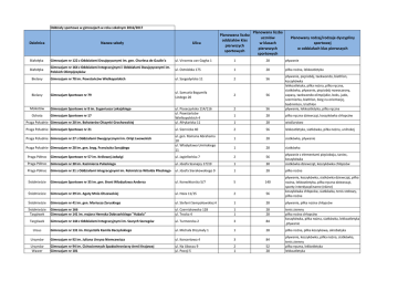 Oddziały sportowe w gimnazjach w roku szkolnym 2016/2017 Dzielnica Nazwa szkoły Ulica Planowana liczba oddziałów klas pierwszych sportowych Planowana liczba uczniów w klasach pierwszych sportowych Planowany rodzaj/rodzaje dyscypliny sportowej w oddziałach klas pierwszych Białołęka Gimnazjum nr 122 z Oddziałami Dwujęzycznymi im. gen. Charlesa de Gaulle'a ul. Vincenta van Gogha 1 1 28 pływanie Białołęka Gimnazjum nr 164 z Oddziałami Integracyjnymi i Oddziałami Dwujęzycznymi im. Polskich Olimpijczyków ul. Ostródzka 175 1 28 piłka nożna, lekkoatletyka Bielany Gimnazjum nr 78 im. Powstańców Wielkopolskich ul. Szegedyńska 11 2 56 Bielany Gimnazjum Sportowe nr 79 ul. Samuela Bogumiła Lindego 20 2 56 2 56 1 28 piłka ręczna dziewcząt, koszykówka chłopców Praga Południe Gimnazjum nr 20 im. Bohaterów Olszynki Grochowskiej ul. Piaseczyńska 114/116 ul. Powstańców Wielkopolskich 4 ul. Afrykańska 11 pływanie, pięciobój, taekwondo, biathlon, koszykówka lekkoatletyka, piłka nożna, piłka ręczna, siatkówka, pływanie, pięciobój nowoczesny, zapasy, taekwondo olimpijskie, boks, judo, szermierka, biathlon, bieg na orientację, badminton, triathlon pływanie, lekkoatletyka, piłka ręczna 1 28 wioślarstwo Praga Południe Gimnazjum Sportowe nr 21 ul. Siennicka 40 2 56 lekkoatletyka, siatkówka, piłka nożna, unihokej 1 28 siatkówka, pływanie 1 28 siatkówka Mokotów Ochota Gimnazjum Sportowe nr 8 im. Eugeniusza Lokajskiego Gimnazjum Sportowe nr 17 Praga Południe Gimnazjum nr 27 z Oddziałami Dwujęzycznymi im. Orląt Lwowskich Praga Południe Gimnazjum nr 28 im. gen. bryg. Franciszka Sznajdego ul. gen. Romana Abrahama 10 ul. Władysława Umińskiego 11 Praga Północ Gimnazjum Sportowe nr 57 im. Królowej Jadwigi ul. Jagiellońska 7 2 56 Praga Północ Gimnazjum nr 30 im. Kazimierza Pułaskiego ul. Józefa Szanajcy 17/19 1 30 pływanie z elementami pięcioboju, taniec, koszykówka siatkówka dziewcząt, koszykówka chłopców Praga Północ Gimnazjum nr 31 z Oddziałami Integracyjnymi im. Rotmistrza Witolda Pileckiego ul. Józefa Sierakowskiego 9 1 28 piłka nożna Śródmieście Gimnazjum Sportowe nr 35 im. gen. Broni Władysława Andersa ul. Konwiktorska 5/7 5 140 Śródmieście Gimnazjum nr 39 im. Agaty Mróz-Olszewskiej ul. Hoża 11/15 2 56 Śródmieście Gimnazjum nr 41 im. gen. Mariusza Zaruskiego ul. Stefanii Sempołowskiej 4 1 28 pływanie, piłka nożna chłopców Śródmieście Targówek Gimnazjum nr 166 Gimnazjum nr 141 im. majora Henryka Dobrzańskiego "Hubala" ul. Czerniakowska 128 ul. Trocka 4 1 1 28 28 Gimnazjum nr 144 z Oddziałami Integracyjnymi im. Szarych Szeregów ul. Turmoncka 2 3 84 tenis ziemny piłka nożna chłopców koszykówka, piłka nożna, siatkówka, lekkoatletyka ,pływanie Gimnazjum nr 131 im. Krzysztofa Kamila Baczyńskiego ul. Michała Drzymały 1 1 28 Ursynów Gimnazjum nr 92 im. Juliana Ursyna Niemcewicza ul. Koncertowa 4 3 84 Ursynów Wawer Gimnazjum nr 94 im. Cichociemnych Spadochroniarzy Armii Krajowej Gimnazjum nr 101 ul. Na Uboczu 9 ul. Poezji 5 2 1 52 28 Targówek Ursus pływanie, koszykówka, siatkówka dziewcząt, piłka nożna, lekkoatletyka, piłka ręczna dziewcząt, sporty interdyscplinarne (różne) koszykówka chłopców, siatkówka, tenis stołowy, piłka nożna piłka nożna, piłka koszykowa, akrobatyka pływanie, koszykówka, piłka nożna, siatkówka, tenis ziemny piłka ręczna, lekkotletyka lekkoatletyka Oddziały sportowe w gimnazjach w roku szkolnym 2016/2017 Dzielnica Wawer Wawer Wawer Wilanów Nazwa szkoły Gimnazjum nr 103 z Oddziałami Integracyjnymi i Oddziałami Dwujęzycznymi im. ks. Jana Twardowskiego Gimnazjum nr 105 im. Olimpijczyków Polskich Gimnazjum nr 106 im. 19 Pułku Ułanów Wołyńskich Gimnazjum nr 117 im. Wandy Rutkiewicz Planowana liczba oddziałów klas pierwszych sportowych Planowana liczba uczniów w klasach pierwszych sportowych ul. Alpejska 16 1 28 pływanie ul. Króla Maciusia 5 ul. Bajkowa 17/21 ul. Gubinowska 28/30 1 1 1 28 28 28 lekkoatletyka koszykówka piłka ręczna, pływanie ul. Żelazna 71 1 28 koszykówka Ulica Planowany rodzaj/rodzaje dyscypliny sportowej w oddziałach klas pierwszych Wola Gimnazjum nr 45 z Oddziałami Integracyjnymi im. Powstania Warszawskiego Wola Gimnazjum nr 47 z Oddziałami Dwujęzycznymi im. Marszałka Józefa Piłsudskiego ul. Grenady 16 1 28 piłka nożna Wola Gimnazjum nr 48 im. Jana Pawła II ul. Deotymy 25/33 4 112 piłka nożna, siatkówka, lekkoatletyka, unihokej, judo Gimnazjum nr 55 z Oddziałami Integracyjnymi im. Jana Bytnara ps. "Rudy" Aleja Wojska Polskiego 1a 3 84 pływanie, piłka nożna, siatkówka, koszykówka Żoliborz