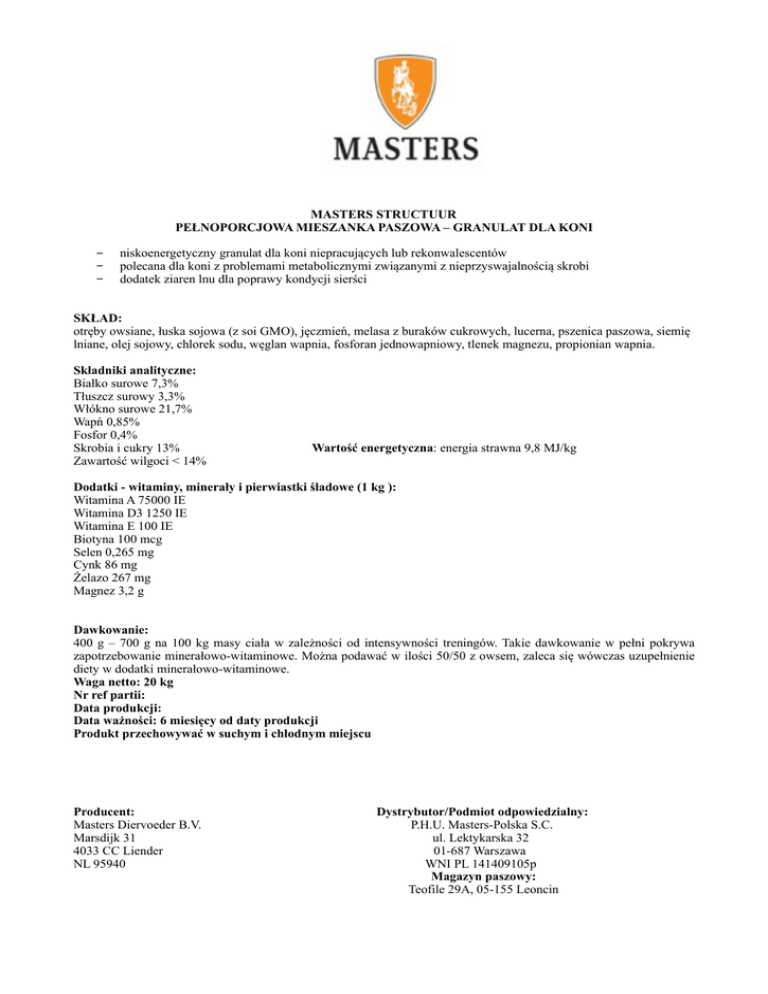 MASTERS STRUCTUUR PEŁNOPORCJOWA MIESZANKA PASZOWA – GRANULAT DLA KONI − − − niskoenergetyczny granulat dla koni niepracujących lub rekonwalescentów polecana dla koni z problemami metabolicznymi związanymi z nieprzyswajalnością skrobi dodatek ziaren lnu dla poprawy kondycji sierści SKŁAD: otręby owsiane, łuska sojowa (z soi GMO), jęczmień, melasa z buraków cukrowych, lucerna, pszenica paszowa, siemię lniane, olej sojowy, chlorek sodu, węglan wapnia, fosforan jednowapniowy, tlenek magnezu, propionian wapnia. Składniki analityczne: Białko surowe 7,3% Tłuszcz surowy 3,3% Włókno surowe 21,7% Wapń 0,85% Fosfor 0,4% Skrobia i cukry 13% Zawartość wilgoci < 14% Wartość energetyczna: energia strawna 9,8 MJ/kg Dodatki - witaminy, minerały i pierwiastki śladowe (1 kg ): Witamina A 75000 IE Witamina D3 1250 IE Witamina E 100 IE Biotyna 100 mcg Selen 0,265 mg Cynk 86 mg Żelazo 267 mg Magnez 3,2 g Dawkowanie: 400 g – 700 g na 100 kg masy ciała w zależności od intensywności treningów. Takie dawkowanie w pełni pokrywa zapotrzebowanie minerałowo-witaminowe. Można podawać w ilości 50/50 z owsem, zaleca się wówczas uzupełnienie diety w dodatki minerałowo-witaminowe. Waga netto: 20 kg Nr ref partii: Data produkcji: Data ważności: 6 miesięcy od daty produkcji Produkt przechowywać w suchym i chłodnym miejscu Producent: Masters Diervoeder B.V. Marsdijk 31 4033 CC Liender NL 95940 Dystrybutor/Podmiot odpowiedzialny: P.H.U. Masters-Polska S.C. ul. Lektykarska 32 01-687 Warszawa WNI PL 141409105p Magazyn paszowy: Teofile 29A, 05-155 Leoncin