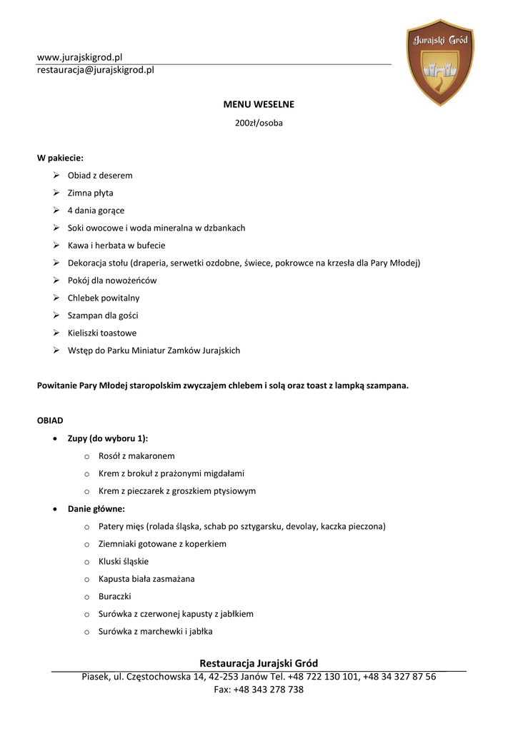 www.jurajskigrod.pl [email protected] MENU WESELNE 200zł/osoba W pakiecie: Obiad z deserem Zimna płyta 4 dania gorące Soki owocowe i woda mineralna w dzbankach Kawa i herbata w bufecie Dekoracja stołu (draperia, serwetki ozdobne, świece, pokrowce na krzesła dla Pary Młodej) Pokój dla nowożeńców Chlebek powitalny Szampan dla gości Kieliszki toastowe Wstęp do Parku Miniatur Zamków Jurajskich Powitanie Pary Młodej staropolskim zwyczajem chlebem i solą oraz toast z lampką szampana. OBIAD Zupy (do wyboru 1): o Rosół z makaronem o Krem z brokuł z prażonymi migdałami o Krem z pieczarek z groszkiem ptysiowym Danie główne: o Patery mięs (rolada śląska, schab po sztygarsku, devolay, kaczka pieczona) o Ziemniaki gotowane z koperkiem o Kluski śląskie o Kapusta biała zasmażana o Buraczki o Surówka z czerwonej kapusty z jabłkiem o Surówka z marchewki i jabłka Restauracja Jurajski Gród Piasek, ul. Częstochowska 14, 42-253 Janów Tel. +48 722 130 101, +48 34 327 87 56 Fax: +48 343 278 738 www.jurajskigrod.pl [email protected] DESER (do wyboru 1): Lody waniliowe z musem z owoców leśnych i bitą śmietaną Lody z owocami i bitą śmietaną ZIMNA PŁYTA: Deski mięs pieczonych i wędlin: karczek pieczony, schab pieczony, rolada z boczku, pasztet domowy, wędliny tradycyjne Tymbalik drobiowy Schab po warszawsku w galarecie Rożki szynkowe z musem chrzanowym w galarecie Pstrąg w galarecie Śledź w oleju Ryba po grecku Sałatka Floryda z szynką, serem i ananasem Sałatka jarzynowa Sałatka grecka Jaja faszerowane Pikle, marynaty Pieczywo, masło I DANIE GORĄCE (do wyboru 1): Kotlet cordon bleu, ziemniaki opiekane, surówka z kapusty pekińskiej Sznycel szwajcarski, ziemniaki piurre, sałatka wiosenna Pstrąg z rusztu, ziemniaki opiekane, surówka z białej kapusty II DANIE GORĄCE (do wyboru 1): Bogracz Jurajska zupa gulaszowa Strogonow Restauracja Jurajski Gród Piasek, ul. Częstochowska 14, 42-253 Janów Tel. +48 722 130 101, +48 34 327 87 56 Fax: +48 343 278 738 www.jurajskigrod.pl [email protected] III DANIE GORĄCE (do wyboru 1): Potrawka z kurczaka, z pieczarkami i warzywami podana na ryżu Gulasz zbójecki z grzybami leśnymi podany w chlebie IV DANIE GORĄCE (do wyboru 1): Barszczyk czerwony z krokietem Żurek śląski w chlebie Flaczki wołowe NAPOJE (bez ograniczeń): Bufet z kawą i herbatą Soki owocowe i woda mineralna w dzbankach CIASTO I OWOCE (na stołach lub w bufecie kawowym) 3-4 rodzaje ciasta DODATKOWA OFERTA: Stół wiejski- 25zł/osoba Ciasto na wynos dla gości- 17zł/sztuka Napoje gazowane firmy coca-cola (but. 0,5l)- bez ograniczeń- 15zł Udziec staropolski z sosem chrzanowym, z ziemniakami podsmażanymi i ćwikłą serwowane przez Szefa Kuchni Jurajskiego Grodu- 30zł/osoba Barek alkoholowy- 500zł usługa barmańska + alkohol Fontanna czekoladowa- ok. 1000zł Alkohol- do uzgodnienia (może być we własnym zakresie, bez dodatkowych opłat) Dodatkowe atrakcje (np. pokaz rycerski, pokaz kuglarski, sztuczne ognie) do uzgodnienia Dzieci do lat 3- gratis Dzieci do lat 10- 30% zniżki Restauracja Jurajski Gród Piasek, ul. Częstochowska 14, 42-253 Janów Tel. +48 722 130 101, +48 34 327 87 56 Fax: +48 343 278 738