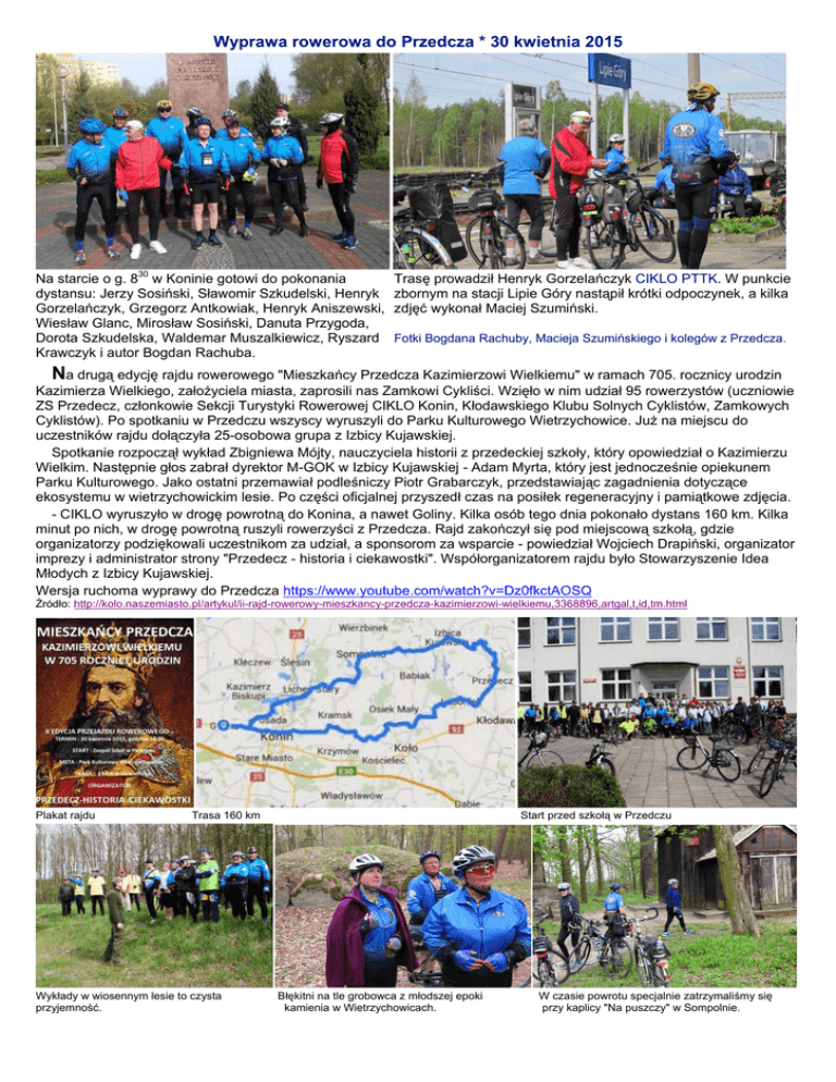 Wyprawa rowerowa do Przedcza * 30 kwietnia 2015 Na starcie o g. 830 w Koninie gotowi do pokonania dystansu: Jerzy Sosiński, Sławomir Szkudelski, Henryk Gorzelańczyk, Grzegorz Antkowiak, Henryk Aniszewski, Wiesław Glanc, Mirosław Sosiński, Danuta Przygoda, Dorota Szkudelska, Waldemar Muszalkiewicz, Ryszard Krawczyk i autor Bogdan Rachuba. Trasę prowadził Henryk Gorzelańczyk CIKLO PTTK. W punkcie zbornym na stacji Lipie Góry nastąpił krótki odpoczynek, a kilka zdjęć wykonał Maciej Szumiński. Fotki Bogdana Rachuby, Macieja Szumińskiego i kolegów z Przedcza. Na drugą edycję rajdu rowerowego "Mieszkańcy Przedcza Kazimierzowi Wielkiemu" w ramach 705. rocznicy urodzin Kazimierza Wielkiego, założyciela miasta, zaprosili nas Zamkowi Cykliści. Wzięło w nim udział 95 rowerzystów (uczniowie ZS Przedecz, członkowie Sekcji Turystyki Rowerowej CIKLO Konin, Kłodawskiego Klubu Solnych Cyklistów, Zamkowych Cyklistów). Po spotkaniu w Przedczu wszyscy wyruszyli do Parku Kulturowego Wietrzychowice. Już na miejscu do uczestników rajdu dołączyła 25-osobowa grupa z Izbicy Kujawskiej. Spotkanie rozpoczął wykład Zbigniewa Mójty, nauczyciela historii z przedeckiej szkoły, który opowiedział o Kazimierzu Wielkim. Następnie głos zabrał dyrektor M-GOK w Izbicy Kujawskiej - Adam Myrta, który jest jednocześnie opiekunem Parku Kulturowego. Jako ostatni przemawiał podleśniczy Piotr Grabarczyk, przedstawiając zagadnienia dotyczące ekosystemu w wietrzychowickim lesie. Po części oficjalnej przyszedł czas na posiłek regeneracyjny i pamiątkowe zdjęcia. - CIKLO wyruszyło w drogę powrotną do Konina, a nawet Goliny. Kilka osób tego dnia pokonało dystans 160 km. Kilka minut po nich, w drogę powrotną ruszyli rowerzyści z Przedcza. Rajd zakończył się pod miejscową szkołą, gdzie organizatorzy podziękowali uczestnikom za udział, a sponsorom za wsparcie - powiedział Wojciech Drapiński, organizator imprezy i administrator strony "Przedecz - historia i ciekawostki". Współorganizatorem rajdu było Stowarzyszenie Idea Młodych z Izbicy Kujawskiej. Wersja ruchoma wyprawy do Przedcza https://www.youtube.com/watch?v=Dz0fkctAOSQ Źródło: http://kolo.naszemiasto.pl/artykul/ii-rajd-rowerowy-mieszkancy-przedcza-kazimierzowi-wielkiemu,3368896,artgal,t,id,tm.html Plakat rajdu Trasa 160 km Wykłady w wiosennym lesie to czysta przyjemność. Start przed szkołą w Przedczu Błękitni na tle grobowca z młodszej epoki kamienia w Wietrzychowicach. W czasie powrotu specjalnie zatrzymaliśmy się przy kaplicy "Na puszczy" w Sompolnie.