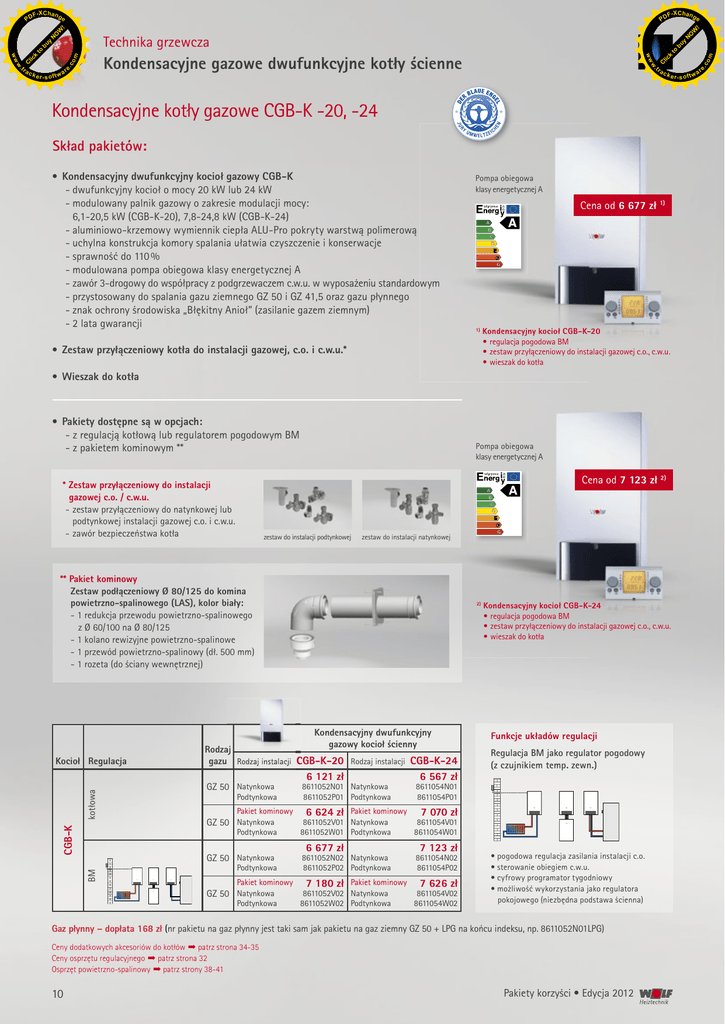 F -X C h a n ge F -X C h a n ge W y bu ac k e r- s o ft w a Kondensacyjne kotły gazowe CGB-K -20, -24 Skład pakietów: • Kondensacyjny dwufunkcyjny kocioł gazowy CGB-K - dwufunkcyjny kocioł o mocy 20 kW lub 24 kW - modulowany palnik gazowy o zakresie modulacji mocy: 6,1-20,5 kW (CGB-K-20), 7,8-24,8 kW (CGB-K-24) - aluminiowo-krzemowy wymiennik ciepła ALU-Pro pokryty warstwą polimerową - uchylna konstrukcja komory spalania ułatwia czyszczenie i konserwacje - sprawność do 110 % - modulowana pompa obiegowa klasy energetycznej A - zawór 3-drogowy do współpracy z podgrzewaczem c.w.u. w wyposażeniu standardowym - przystosowany do spalania gazu ziemnego GZ 50 i GZ 41,5 oraz gazu płynnego - znak ochrony środowiska „Błękitny Anioł” (zasilanie gazem ziemnym) - 2 lata gwarancji Pompa obiegowa klasy energetycznej A Cena od 6 677 zł 1) 1) • Zestaw przyłączeniowy kotła do instalacji gazowej, c.o. i c.w.u.* Kondensacyjny kocioł CGB-K-20 • regulacja pogodowa BM • zestaw przyłączeniowy do instalacji gazowej c.o., c.w.u. • wieszak do kotła • Wieszak do kotła • Pakiety dostępne są w opcjach: - z regulacją kotłową lub regulatorem pogodowym BM - z pakietem kominowym ** Pompa obiegowa klasy energetycznej A Cena od 7 123 zł 2) * Zestaw przyłączeniowy do instalacji gazowej c.o. / c.w.u. - zestaw przyłączeniowy do natynkowej lub podtynkowej instalacji gazowej c.o. i c.w.u. - zawór bezpieczeństwa kotła zestaw do instalacji podtynkowej zestaw do instalacji natynkowej ** Pakiet kominowy Zestaw podłączeniowy Ø 80/125 do komina powietrzno-spalinowego (LAS), kolor biały: - 1 redukcja przewodu powietrzno-spalinowego z Ø 60/100 na Ø 80/125 - 1 kolano rewizyjne powietrzno-spalinowe - 1 przewód powietrzno-spalinowy (dł. 500 mm) - 1 rozeta (do ściany wewnętrznej) CGB-K kotłowa Kocioł Regulacja Kondensacyjny dwufunkcyjny gazowy kocioł ścienny Rodzaj gazu Rodzaj instalacji CGB-K-20 Rodzaj instalacji CGB-K-24 GZ 50 Natynkowa Podtynkowa Pakiet kominowy GZ 50 Natynkowa Podtynkowa GZ 50 Natynkowa BM 2) Podtynkowa Pakiet kominowy GZ 50 Natynkowa Podtynkowa 6 121 zł 8611052N01 Natynkowa 8611052P01 Podtynkowa 6 567 zł Kondensacyjny kocioł CGB-K-24 • regulacja pogodowa BM • zestaw przyłączeniowy do instalacji gazowej c.o., c.w.u. • wieszak do kotła Funkcje układów regulacji Regulacja BM jako regulator pogodowy (z czujnikiem temp. zewn.) 8611054N01 8611054P01 6 624 zł Pakiet kominowy 7 070 zł 8611052V01 Natynkowa 8611054V01 8611052W01 Podtynkowa 8611054W01 6 677 zł 8611052N02 Natynkowa 8611052P02 Podtynkowa 7 123 zł 8611054N02 8611054P02 7 180 zł Pakiet kominowy 7 626 zł 8611052V02 Natynkowa 8611054V02 8611052W02 Podtynkowa 8611054W02 • pogodowa regulacja zasilania instalacji c.o. • sterowanie obiegiem c.w.u. • cyfrowy programator tygodniowy • możliwość wykorzystania jako regulatora pokojowego (niezbędna podstawa ścienna) Gaz płynny – dopłata 168 zł (nr pakietu na gaz płynny jest taki sam jak pakietu na gaz ziemny GZ 50 + LPG na końcu indeksu, np. 8611052N01LPG) Ceny dodatkowych akcesoriów do kotłów ➡ patrz strona 34-35 Ceny osprzętu regulacyjnego ➡ patrz strona 32 Osprzęt powietrzno-spalinowy ➡ patrz strony 38-41 10 Pakiety korzyści • Edycja 2012 om to k lic tr .c .c C lic k om Kondensacyjne gazowe dwufunkcyjne kotły ścienne re . . k e r- s o ft w a w w ac C to bu y Technika grzewcza ww ww tr N O N O W ! PD ! PD re F -X C h a n ge F -X C h a n ge W y bu k lic tr ac k e r- s o ft w a Kondensacyjny gazowy kocioł ścienny CGB-K-40/35 Skład pakietów: • Kondensacyjny dwufunkcyjny kocioł ścienny CGB-K-40/35 - dwufunkcyjny kocioł o mocy 40/35 kW (moc c.w.u./c.o.) - modulowany palnik gazowy o zakresie modulacji mocy 9-35 kW - aluminiowo-krzemowy wymiennik ciepła ALU-Pro pokryty warstwą polimerową - uchylna konstrukcja komory spalania ułatwia czyszczenie i konserwacje - sprawność do 110 % - modulowana pompa obiegowa klasy energetycznej A - zawór 3-drogowy do współpracy z podgrzewaczem c.w.u. w wyposażeniu standardowym - przystosowany do spalania gazu ziemnego GZ 50 i GZ 41,5 oraz gazu płynnego - znak ochrony środowiska „Błękitny Anioł” (zasilanie gazem ziemnym) - 2 lata gwarancji Pompa obiegowa klasy energetycznej A Cena od 9 016 zł 1) • Wieszak do kotła • Pakiety dostępne są w opcjach: - z regulacją kotłową lub regulatorem pogodowym BM - z pakietem kominowym * 1) Kondensacyjny dwufunkcyjny gazowy kocioł ścienny Regulacja CGB-K kotłowa Kocioł CGB-K-40/35 Rodzaj gazu GZ 50 BM Funkcje układów regulacji Regulacja BM jako regulator pogodowy (z czujnikiem temp. zewn.) 8612280W01 Pakiet kominowy 8 964 zł 8612280V01 9 016 zł GZ 50 GZ 50 Kondensacyjny kocioł CGB-K-40/35 • regulacja pogodowa BM • wieszak do kotła 8 460 zł GZ 50 8612280W02 Pakiet kominowy 9 520 zł 8612280V02 • pogodowa regulacja zasilania instalacji c.o. • sterowanie obiegiem c.w.u. • cyfrowy programator tygodniowy • możliwość wykorzystania jako regulatora pokojowego (niezbędna podstawa ścienna) Gaz płynny – dopłata 168 zł (nr pakietu na gaz płynny jest taki sam jak pakietu na gaz ziemny GZ 50 + LPG na końcu indeksu, np. 8612280W01LPG) Ceny dodatkowych akcesoriów do kotłów ➡ patrz strona 34-35 Ceny osprzętu regulacyjnego ➡ patrz strona 32 Osprzęt powietrzno-spalinowy ➡ patrz strony 38-41 * Pakiet kominowy Zestaw podłączeniowy Ø 80/125 do komina powietrzno-spalinowego (LAS), kolor biały: - 1 kolano rewizyjne powietrzno-spalinowe - 1 przewód powietrzno-spalinowy (dł. 500 mm) - 1 rozeta (do ściany wewnętrznej) Pakiety korzyści • Edycja 2012 om to Kondensacyjne gazowe dwufunkcyjne kotły ścienne .c re C .c k e r- s o ft w a . . ac w w C lic k om to bu y Technika grzewcza ww ww tr N O N O W ! PD ! PD 11 re