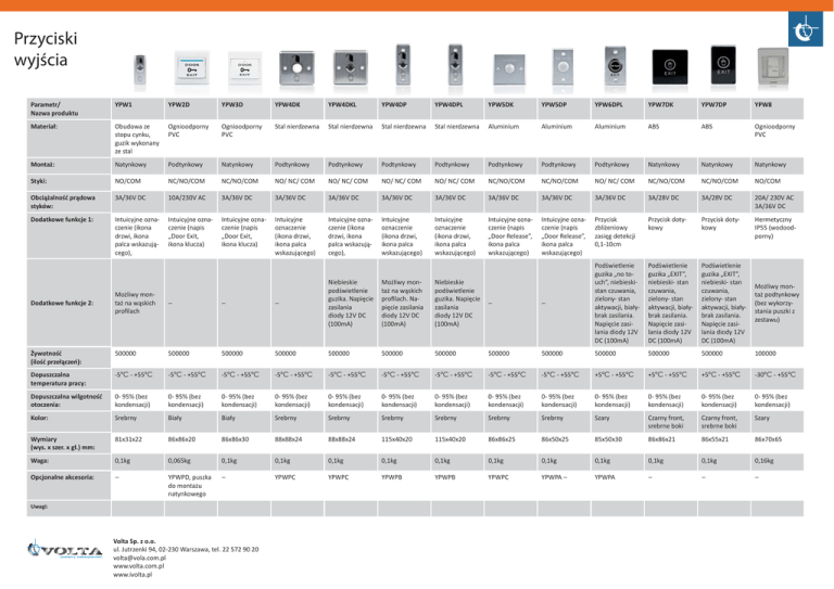 Przyciski wyjścia Parametr/ Nazwa produktu YPW1 YPW2D YPW3D YPW4DK YPW4DKL YPW4DP YPW4DPL YPW5DK YPW5DP YPW6DPL YPW7DK YPW7DP YPW8 Materiał: Obudowa ze stopu cynku, guzik wykonany ze stal Ognioodporny PVC Ognioodporny PVC Stal nierdzewna Stal nierdzewna Stal nierdzewna Stal nierdzewna Aluminium Aluminium Aluminium ABS ABS Ognioodporny PVC Montaż: Natynkowy Podtynkowy Natynkowy Podtynkowy Podtynkowy Podtynkowy Podtynkowy Podtynkowy Podtynkowy Podtynkowy Natynkowy Natynkowy Natynkowy Styki: NO/COM NC/NO/COM NC/NO/COM NO/ NC/ COM NO/ NC/ COM NO/ NC/ COM NO/ NC/ COM NC/NO/COM NC/NO/COM NO/ NC/ COM NC/NO/COM NC/NO/COM NO/COM Obciążalność prądowa styków: 3A/36V DC 10A/230V AC 3A/36V DC 3A/36V DC 3A/36V DC 3A/36V DC 3A/36V DC 3A/36V DC 3A/36V DC 3A/36V DC 3A/28V DC 3A/28V DC 20A/ 230V AC 3A/36V DC Dodatkowe funkcje 1: Intuicyjne oznaczenie (ikona drzwi, ikona palca wskazującego), Intuicyjne oznaczenie (napis „Door Exit, ikona klucza) Intuicyjne oznaczenie (napis „Door Exit, ikona klucza) Intuicyjne oznaczenie (ikona drzwi, ikona palca wskazującego) Intuicyjne oznaczenie (ikona drzwi, ikona palca wskazującego), Intuicyjne oznaczenie (ikona drzwi, ikona palca wskazującego) Intuicyjne oznaczenie (ikona drzwi, ikona palca wskazującego) Intuicyjne oznaczenie (napis „Door Release”, ikona palca wskazującego) Intuicyjne oznaczenie (napis „Door Release”, ikona palca wskazującego) Przycisk zbliżeniowy zasięg detekcji 0,1-10cm Przycisk dotykowy Przycisk dotykowy Hermetyczny IP55 (wodoodporny) Podświetlenie guzika „EXIT”, niebieski- stan czuwania, zielony- stan aktywacji, białybrak zasilania. Napięcie zasilania diody 12V DC (100mA) Podświetlenie guzika „EXIT”, niebieski- stan czuwania, zielony- stan aktywacji, białybrak zasilania. Napięcie zasilania diody 12V DC (100mA) Możliwy montaż podtynkowy (bez wykorzystania puszki z zestawu) Możliwy montaż na wąskich profilach. Napięcie zasilania diody 12V DC (100mA) Niebieskie podświetlenie guzika. Napięcie zasilania diody 12V DC (100mA) − − Podświetlenie guzika „no touch”, niebieskistan czuwania, zielony- stan aktywacji, białybrak zasilania. Napięcie zasilania diody 12V DC (100mA) Możliwy montaż na wąskich profilach − − − Niebieskie podświetlenie guzika. Napięcie zasilania diody 12V DC (100mA) Żywotność (ilość przełączeń): 500000 500000 500000 500000 500000 500000 500000 500000 500000 500000 500000 500000 100000 Dopuszczalna temperatura pracy: -5ºC - +55ºC -5ºC - +55ºC -5ºC - +55ºC -5ºC - +55ºC -5ºC - +55ºC -5ºC - +55ºC -5ºC - +55ºC -5ºC - +55ºC -5ºC - +55ºC +5ºC - +55ºC +5ºC - +55ºC +5ºC - +55ºC -30ºC - +55ºC Dopuszczalna wilgotność otoczenia: 0- 95% (bez kondensacji) 0- 95% (bez kondensacji) 0- 95% (bez kondensacji) 0- 95% (bez kondensacji) 0- 95% (bez kondensacji) 0- 95% (bez kondensacji) 0- 95% (bez kondensacji) 0- 95% (bez kondensacji) 0- 95% (bez kondensacji) 0- 95% (bez kondensacji) 0- 95% (bez kondensacji) 0- 95% (bez kondensacji) 0- 95% (bez kondensacji) Kolor: Srebrny Biały Biały Srebrny Srebrny Srebrny Srebrny Srebrny Srebrny Szary Czarny front, srebrne boki Czarny front, srebrne boki Szary Wymiary (wys. x szer. x gł.) mm: 81x31x22 86x86x20 86x86x30 88x88x24 88x88x24 115x40x20 115x40x20 86x86x25 86x50x25 85x50x30 86x86x21 86x55x21 86x70x65 Waga: 0,1kg 0,065kg 0,1kg 0,1kg 0,1kg 0,1kg 0,1kg 0,1kg 0,1kg 0,1kg 0,1kg 0,1kg 0,16kg Opcjonalne akcesoria: − YPWPD, puszka do montażu natynkowego − YPWPC YPWPC YPWPB YPWPB YPWPC YPWPA − YPWPA − − − Dodatkowe funkcje 2: Uwagi: Volta Sp. z o.o. ul. Jutrzenki 94, 02-230 Warszawa, tel. 22 572 90 20 [email protected] www.volta.com.pl www.ivolta.pl Przyciski wyjścia Puszki Parametr\ Nazwa produktu YPW9B YPW9W YPW10B YPW10W YPW11 APWK APWK-DP APPK Parametry YPWPA YPWPB YPWPC YPWPD Materiał: Panel akrylowy Panel akrylowy Panel akrylowy Panel akrylowy ABS ABS ABS ABS Materiał: Stal nierdzewna Stal nierdzewna Stal nierdzewna ABS Montaż: Natynkowy Natynkowy Natynkowy Natynkowy Natynkowy Natynkowy Natynkowy Natynkowy Dodatkowe funkcje: Łatwy montaż, estetyczne wykonanie, umożliwia montaż natynkowy przycisków Łatwy montaż, estetyczne wykonanie, umożliwia montaż natynkowy przycisków Łatwy montaż, estetyczne wykonanie, umożliwia montaż natynkowy przycisków Łatwy montaż, estetyczne wykonanie, umożliwia montaż natynkowy przycisków Styki: NC/NO/COM NC/NO/COM NC/NO/COM NC/NO/COM NO/COM NO/NC/COM 2x NO/NC/COM 2x NO/NC/COM Kolor: Srebrny Srebrny Srebrny Biały Obciążalność prądowa styków: 5A/12V DC 5A/12V DC 5A/12V DC 5A/12V DC 10A/250V AC 2A/30V DC 2A/30V DC 2A/30V DC Waga: 0,1kg 0,1kg 0,1kg 0,1kg Dodatkowe funkcje 1: Dotykowy (typ dotknij), podświetlany, niebieski- stan czuwania, zielony- stan aktywacji, białybrak zasilania Dotykowy (typ dotknij), podświetlany, niebieski- stan czuwania, zielony- stan aktywacji, białybrak zasilania Dotykowy (typ naciśnij), podświetlany, niebieski- stan czuwania, zielony- stan aktywacji, białybrak zasilania Dotykowy (typ naciśnij), podświetlany, niebieski- stan czuwania, zielony- stan aktywacji, białybrak zasilania Intuicyjne oznaczenie (ikona klucza, napis Door Exit), Pamięć alarmu, resetowany kluczykiem Dwa niezależne styki, pamięć alarmu, resetowany kluczykiem Pamięć alarmu, resetowany kluczykiem Wymiary (wys. x szer. x gł.) mm: 86x50x27 115x40x27 86x86x28 86x86x32 Zasilanie 12V DC/0,1A Zasilanie 12V DC/0,1A Zasilanie 12V DC/0,1A Zasilanie 12V DC/0,1A − Szybka- klapka ochronna w zestawie, stopień ochrony IP24 Szybka- klapka ochronna w zestawie, stopień ochrony IP24 Szybka- klapka ochronna w zestawie, stopień ochrony IP24 Kompatybilny z: YPW6DPL, YPW5DP YPW4DP, YPW4DPL YPW4DK, YPW4DKL, YPW5DK YPW2D Żywotność (ilość przełączeń) 100000 100000 100000 100000 500000 − − − Dopuszczalna temperatura pracy: +5ºC - +55ºC +5ºC - +55ºC +5ºC - +55ºC +5ºC - +55ºC -5ºC - +55ºC -30ºC - +70ºC -30ºC - +70ºC -30ºC -