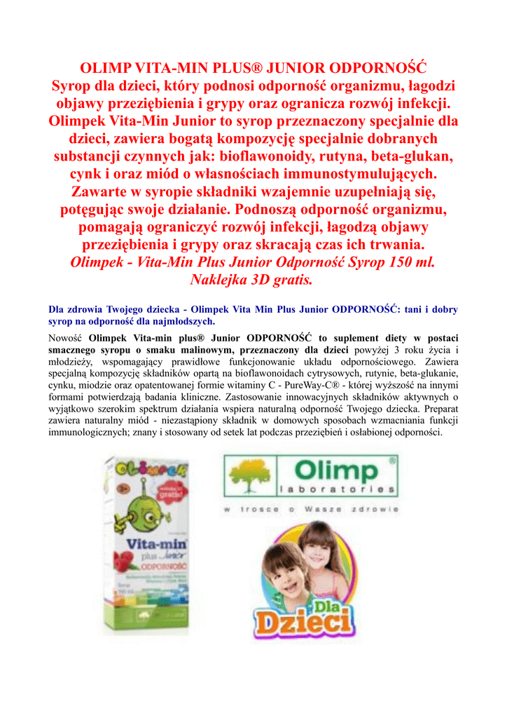 OLIMP VITA-MIN PLUS® JUNIOR ODPORNOŚĆ Syrop dla dzieci, który podnosi odporność organizmu, łagodzi objawy przeziębienia i grypy oraz ogranicza rozwój infekcji. Olimpek Vita-Min Junior to syrop przeznaczony specjalnie dla dzieci, zawiera bogatą kompozycję specjalnie dobranych substancji czynnych jak: bioflawonoidy, rutyna, beta-glukan, cynk i oraz miód o własnościach immunostymulujących. Zawarte w syropie składniki wzajemnie uzupełniają się, potęgując swoje działanie. Podnoszą odporność organizmu, pomagają ograniczyć rozwój infekcji, łagodzą objawy przeziębienia i grypy oraz skracają czas ich trwania. Olimpek - Vita-Min Plus Junior Odporność Syrop 150 ml. Naklejka 3D gratis. Dla zdrowia Twojego dziecka - Olimpek Vita Min Plus Junior ODPORNOŚĆ: tani i dobry syrop na odporność dla najmłodszych. Nowość Olimpek Vita-min plus® Junior ODPORNOŚĆ to suplement diety w postaci smacznego syropu o smaku malinowym, przeznaczony dla dzieci powyżej 3 roku życia i młodzieży, wspomagający prawidłowe funkcjonowanie układu odpornościowego. Zawiera specjalną kompozycję składników opartą na bioflawonoidach cytrysowych, rutynie, beta-glukanie, cynku, miodzie oraz opatentowanej formie witaminy C - PureWay-C® - której wyższość na innymi formami potwierdzają badania kliniczne. Zastosowanie innowacyjnych składników aktywnych o wyjątkowo szerokim spektrum działania wspiera naturalną odporność Twojego dziecka. Preparat zawiera naturalny miód - niezastąpiony składnik w domowych sposobach wzmacniania funkcji immunologicznych; znany i stosowany od setek lat podczas przeziębień i osłabionej odporności. • • • • Wskazania do stosowania syropu dla dzieci Olimpek Vita-Min Junior ODPORNOŚĆ: w stanach obniżonej odporności, w przebiegu chorób infekcyjnych, w okresach zwiększonej zachorowalności (przeziębienie, grypa), uzupełniająco w stanach niedoborów witaminy C. Syrop jest polecany szczególnie dla dzieci. Ma pyszny malinowy smak! Syrop dla dzieci na poprawę odporności Vita-Min Junior ODPORNOŚĆ jest bogatą kompozycją substancji aktywnych wpływających na prawidłowe funkcjonowanie organizmu. W trosce o dobro Twojego dziecka syrop jest bez konserwantów oraz zawiera tylko naturalne barwniki. Unikalna kompozycja aktywnych składników oraz brak konserwantów - to wyróżnia Vita-min plus® Junior ODPORNOŚĆ od innych preparatów dostępnych na rynku. Składniki witaminowe oraz mineralne syropu wzajemnie się wspierają, a miód w naturalny sposób wzmacnia odporność, taka kompozycja tworzy jedyny tak komplementarny preparat na rynku. • • • • • Jak aktywne składniki Vita-min plus ® Junior ODPORNOŚĆ wspierają organizm Twojego dziecka? Bioflawonoidy oraz rutyna - bioflawonoidy to naturalne substancje występujące m. in. w owocach cytrusowych, wraz z rutyną podnoszą odporność organizmu, a także wzmacniają skuteczność witaminy C. Beta-glukan - naturalny polisacharyd o właściwościach immunostymulujących, poprzez aktywację makrofagów i neutrofili przyczynia się do wzmocnienia systemu odpornościowego. Cynk - kolejne ważne składniki dla prawidłowego funkcjonowania systemu odpornościowego; cynk jest elementem niezbędnym do przebiegu licznych reakcji w organizmie, w tym wielu reakcji immunologicznych. Witamina C - jest powszechnie znanym środkiem wspierającym funkcjonowanie układu immunologicznego. Preparat Vita-min plus® Junior ODPORNOŚĆ zawiera opatentowaną formę witaminy C – PurWay-C®, której wyższość nad innymi formami witaminy C, potwierdzają liczne badania naukowe. Miód - cenny składnik odżywczy podczas zwiększonego wysiłku fizycznego i umysłowego oraz, ze względu na właściwości antybakteryjne, wspierający naturalną odporność. Dla kogo dedykowany jest suplement diety syrop na odporność Olimpek Vita-Min Plus Junior ODPORNOŚĆ? Dobry i tanie suplement diety w postaci syropu Olimpek Vita-Min Plus Junior ODPORNOŚĆ to doskonały środek zwiększający odporność u dzieci i młodzieży, a także wspierający prawidłowe funkcjonowanie całego organizmu naszych pociech. Olimpek Vita-Min Plus Junior ODPORNOŚĆ to idealny preparat dla dzieci i młodzieży, szczególnie tych przebywających w dużych skupiskach ludzkich (szkoła, przedszkola, urzędy) oraz w okresach tzw. niepewnej pogody i zagrożenia infekcją. Dawkowanie oraz sposób użycia syropu wspierającego układ immunologiczny Olimpek VitaMin Plus Junior ODPORNOŚĆ: Dzieci powyżej 3 roku życia oraz młodzieży: 10 ml syropu (2 łyżeczki) jeden raz dziennie po śniadaniu lub posiłku głównym. Opis i charakterystyka preparatu wzmacniającego odporność Olimp Vita-Min Plus Junior Odporność: • 1 porcja = 10 ml syropu • Ilość porcji w opakowaniu: 15 • Zawartość opakowania: 150 ml Skład produktu Olimpek Vita-Min Plus Junior Odporność: Zawartość: w jednej porcji (10 ml) * RDA Bioflawonoidy cytrusowe 60 mg - Beta-glukan 20 mg - Rutyna 15 mg - Witamina C (Pure Way-C®) 50 mg 62% Cynk 5 mg 50% Miód 600 mg *RDA - Procent realizacji zalecanego dziennego spożycia. - Składniki Olimp Vita Min Plus Junior Odporność: Cukier inwertowany, miód, bioflawonoidy cytrusowe, mikrokapsułkowany kwas L-askorbinowy (PureWay-C®) - witamina C, glukonian cynku, beta-glukan, kwas cytrynowy - regulator kwasowości, rutyna, aromat malinowy, barwnik koszenila.