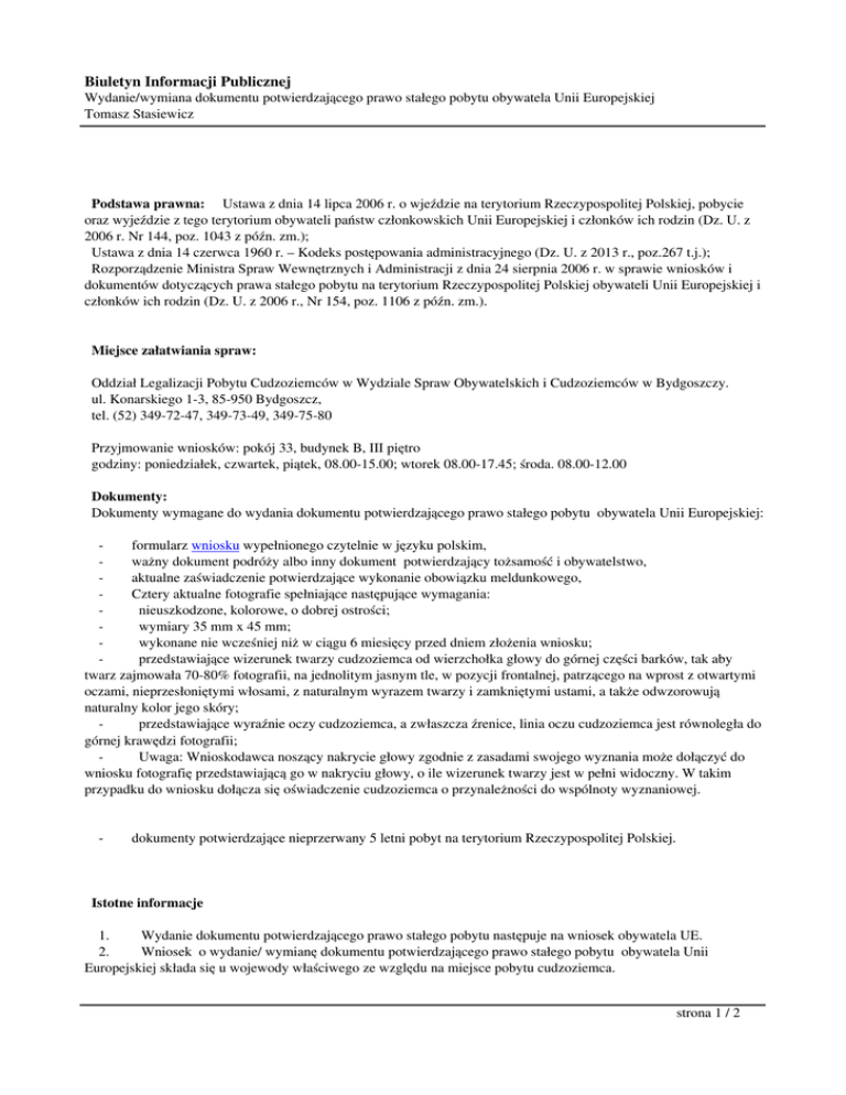 Biuletyn Informacji Publicznej Wydanie/wymiana dokumentu potwierdzającego prawo stałego pobytu obywatela Unii Europejskiej Tomasz Stasiewicz Podstawa prawna: Ustawa z dnia 14 lipca 2006 r. o wjeździe na terytorium Rzeczypospolitej Polskiej, pobycie oraz wyjeździe z tego terytorium obywateli państw członkowskich Unii Europejskiej i członków ich rodzin (Dz. U. z 2006 r. Nr 144, poz. 1043 z późn. zm.); Ustawa z dnia 14 czerwca 1960 r. – Kodeks postępowania administracyjnego (Dz. U. z 2013 r., poz.267 t.j.); Rozporządzenie Ministra Spraw Wewnętrznych i Administracji z dnia 24 sierpnia 2006 r. w sprawie wniosków i dokumentów dotyczących prawa stałego pobytu na terytorium Rzeczypospolitej Polskiej obywateli Unii Europejskiej i członków ich rodzin (Dz. U. z 2006 r., Nr 154, poz. 1106 z późn. zm.). Miejsce załatwiania spraw: Oddział Legalizacji Pobytu Cudzoziemców w Wydziale Spraw Obywatelskich i Cudzoziemców w Bydgoszczy. ul. Konarskiego 1-3, 85-950 Bydgoszcz, tel. (52) 349-72-47, 349-73-49, 349-75-80 Przyjmowanie wniosków: pokój 33, budynek B, III piętro godziny: poniedziałek, czwartek, piątek, 08.00-15.00; wtorek 08.00-17.45; środa. 08.00-12.00 Dokumenty: Dokumenty wymagane do wydania dokumentu potwierdzającego prawo stałego pobytu obywatela Unii Europejskiej: formularz wniosku wypełnionego czytelnie w języku polskim, ważny dokument podróży albo inny dokument potwierdzający tożsamość i obywatelstwo, aktualne zaświadczenie potwierdzające wykonanie obowiązku meldunkowego, Cztery aktualne fotografie spełniające następujące wymagania: nieuszkodzone, kolorowe, o dobrej ostrości; wymiary 35 mm x 45 mm; wykonane nie wcześniej niż w ciągu 6 miesięcy przed dniem złożenia wniosku; przedstawiające wizerunek twarzy cudzoziemca od wierzchołka głowy do górnej części barków, tak aby twarz zajmowała 70-80% fotografii, na jednolitym jasnym tle, w pozycji frontalnej, patrzącego na wprost z otwartymi oczami, nieprzesłoniętymi włosami, z naturalnym wyrazem twarzy i zamkniętymi ustami, a także odwzorowują naturalny kolor jego skóry; przedstawiające wyraźnie oczy cudzoziemca, a zwłaszcza źrenice, linia oczu cudzoziemca jest równoległa do górnej krawędzi fotografii; Uwaga: Wnioskodawca noszący nakrycie głowy zgodnie z zasadami swojego wyznania może dołączyć do wniosku fotografię przedstawiającą go w nakryciu głowy, o ile wizerunek twarzy jest w pełni widoczny. W takim przypadku do wniosku dołącza się oświadczenie cudzoziemca o przynależności do wspólnoty wyznaniowej. - dokumenty potwierdzające nieprzerwany 5 letni pobyt na terytorium Rzeczypospolitej Polskiej. Istotne informacje 1. Wydanie dokumentu potwierdzającego prawo stałego pobytu następuje na wniosek obywatela UE. 2. Wniosek o wydanie/ wymianę dokumentu potwierdzającego prawo stałego pobytu obywatela Unii Europejskiej składa się u wojewody właściwego ze względu na miejsce pobytu cudzoziemca. strona 1 / 2 Biuletyn Informacji Publicznej Wydanie/wymiana dokumentu potwierdzającego prawo stałego pobytu obywatela Unii Europejskiej Tomasz Stasiewicz 3. Wniosek o wydanie/ wymianę dokumentu potwierdzającego prawo stałego pobytu obywatela UE składa się osobiście. Wymóg osobistego złożenia wniosku nie dotyczy małoletniego. 4. Obywatel UE nabywa prawo stałego pobytu po upływie 5 letniego nieprzerwanego pobytu na terytorium Rzeczypospolitej Polskiej. Pobyt na terytorium Rzeczypospolitej Polskiej uważa się za nieprzerwany, w przypadku gdy przerwy w nim nie przekroczyły łącznie 6 miesięcy w roku. Pobytu na terytorium Rzeczypospolitej Polskiej nie przerywa opuszczenie tego terytorium na okres dłuższy niż 6 miesięcy z powodu: • odbycia obowiązkowej służby wojskowej, • ważnej sytuacji osobistej, w szczególności ciąży, porodu, choroby, studiów szkolenia zawodowego, oddelegowania, która wymaga pobytu poza tym terytorium, pod warunkiem że okres ten jest nie dłuższy niż 12 kolejnych miesięcy. 5. Obywatel UE nabywa prawo stałego pobytu przed upływem 5 letniego pobytu na terytorium Rzeczypospolitej Polskiej jeżeli jest: • pracownikiem lub osobą pracującą na własny rachunek, która w chwili zakończenia wykonywania pracy lub innej działalności zarobkowej we własnym imieniu i na własny rachunek osiągnęła wiek emerytalny określony przez polskie przepisy dotyczące ubezpieczenia emerytalnego lub która zakończyła wykonywanie pracy w celu przejścia na wcześniejszą emeryturę, jeżeli przedtem przez okres 12 miesięcy wykonywała pracę lub inną działalność zarobkową we własnym imieniu i na własny rachunek na terytorium RP i przebywała na tym terytorium nieprzerwanie przez okres dłuższy niż 3 lata; • pracownik lub osoba pracująca na własny rachunek, która zaprzestała wykonywania pracy lub innej działalności zarobkowej we własnym imieniu i na własny rachunek na tym terytorium z powodu trwałej niezdolności do pracy, jeżeli przebywała na tym terytorium nieprzerwanie przez okres dłuższy niż 2 lata; • pracownik lub osoba pracująca na własny rachunek, która po upływie 3 lat nieprzerwanego pobytu i wykonywania pracy lub innej działalności zarobkowej we własnym imieniu i na własny rachunek na tym terytorium wykonuje pracę lub inną działalność zarobkową we własnym imieniu i na własny rachunek w innym państwie członkowskim, przebywając nadal na terytorium RP, dokąd powraca co najmniej raz w tygodniu. 6. Przy odbiorze dokumentu potwierdzającego prawo stałego pobytu obywatel UE okazuje dokument potwierdzający tożsamość, a w przypadku, gdy odbioru dokonuje pełnomocnik wnioskodawcy- także pełnomocnictwo do odbioru dokumentu. 7. Cudzoziemcowi odmawia się wydania dokumentu potwierdzającego prawo stałego pobytu obywatela UE, w przypadku gdy: nie spełnia warunków do wydania dokumentu potwierdzającego prawo stałego pobytu obywatela UE, pobyt obywatela UE stanowi zagro
