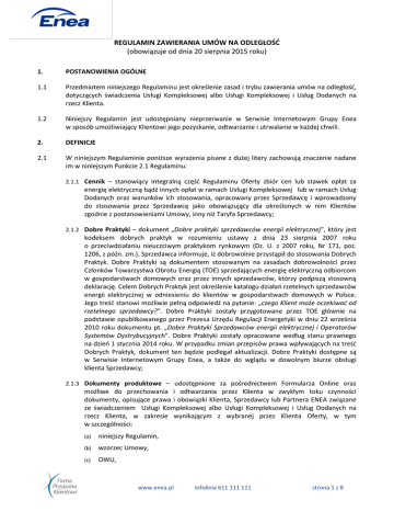 REGULAMIN ZAWIERANIA UMÓW NA ODLEGŁOŚĆ (obowiązuje od dnia 20 sierpnia 2015 roku) 1. POSTANOWIENIA OGÓLNE 1.1 Przedmiotem niniejszego Regulaminu jest określenie zasad i trybu zawierania umów na odległość, dotyczących świadczenia Usługi Kompleksowej albo Usługi Kompleksowej i Usług Dodanych na rzecz Klienta. 1.2 Niniejszy Regulamin jest udostępniany nieprzerwanie w Serwisie Internetowym Grupy Enea w sposób umożliwiający Klientowi jego pozyskanie, odtwarzanie i utrwalanie w każdej chwili. 2. DEFINICJE 2.1 W niniejszym Regulaminie poniższe wyrażenia pisane z dużej litery zachowują znaczenie nadane im w niniejszym Punkcie 2.1 Regulaminu: 2.1.1 Cennik – stanowiący integralną część Regulaminu Oferty zbiór cen lub stawek opłat za energię elektryczną bądź innych opłat w ramach Usługi Kompleksowej lub w ramach Usług Dodanych oraz warunków ich stosowania, opracowany przez Sprzedawcę i wprowadzony do stosowania przez Sprzedawcę jako obowiązujący dla określonych w nim Klientów zgodnie z postanowieniami Umowy, inny niż Taryfa Sprzedawcy; 2.1.2 Dobre Praktyki – dokument „Dobre praktyki sprzedawców energii elektrycznej”, który jest kodeksem dobrych praktyk w rozumieniu ustawy z dnia 23 sierpnia 2007 roku o przeciwdziałaniu nieuczciwym praktykom rynkowym (Dz. U. z 2007 roku, Nr 171, poz. 1206, z późn. zm.). Sprzedawca informuje, iż dobrowolnie przystąpił do stosowania Dobrych Praktyk. Dobre Praktyki są dokumentem stosowanym na zasadach dobrowolności przez Członków Towarzystwa Obrotu Energią (TOE) sprzedających energię elektryczną odbiorcom w gospodarstwach domowych oraz przez innych sprzedawców, którzy podpiszą stosowną deklarację. Celem Dobrych Praktyk jest określenie katalogu działań rzetelnych sprzedawców energii elektrycznej w odniesieniu do klientów w gospodarstwach domowych w Polsce. Jego treść stanowi możliwie pełną odpowiedź na pytanie: „czego Klient może oczekiwać od rzetelnego sprzedawcy?”. Dobre Praktyki zostały przygotowane przez TOE głównie na podstawie opublikowanego przez Prezesa Urzędu Regulacji Energetyki w dniu 22 września 2010 roku dokumentu pt. „Dobre Praktyki Sprzedawców energii elektrycznej i Operatorów Systemów Dystrybucyjnych”. Dobre Praktyki zostały opracowane według stanu prawnego na dzień 1 stycznia 2014 roku. W przypadku zmian przepisów prawa wpływających na treść Dobrych Praktyk, dokument ten będzie podlegał aktualizacji. Dobre Praktyki dostępne są w Serwisie Internetowym Grupy Enea, a także do wglądu w dowolnym biurze obsługi klienta Sprzedawcy; 2.1.3 Dokumenty produktowe – udostępnione za pośrednictwem Formularza Online oraz możliwe do przechowania i odtwarzania przez Klienta w zwykłym toku czynności dokumenty, opisujące prawa i obowiązki Klienta, Sprzedawcy lub Partnera ENEA związane ze świadczeniem Usługi Kompleksowej albo Usługi Kompleksowej i Usług Dodanych na rzecz Klienta, w zakresie wynikającym z wybranej przez Klienta Oferty, w tym w szczególności: (a) niniejszy Regulamin, (b) wzorzec Umowy, (c) OWU, www.enea.pl Infolinia 611 111 111 strona 1 z 8 (d) Regulamin Oferty wraz z Cennikiem, (e) Dobre Praktyki, (f) Zbiór Praw Konsumenta; (g) dokumenty dotyczące Usług Dodanych - w przypadku wyboru Oferty obejmującej Usługi Dodane. 2.1.4 Formularz Online – formularz elektroniczny udostępniony do wypełnienia w Serwisie Internetowym Grupy Enea, służący do zawarcia przez Klienta Umowy; 2.1.5 Grupa Taryfowa – grupa Klientów korzystających z Usługi Kompleksowej, dla których stosuje się jeden zestaw cen lub stawek opłat i warunków ich stosowania; 2.1.6 Informacja o zawarciu Umowy – przekazana Klientowi na wskazany w Formularzu Online adres poczty elektronicznej informacja dotycząca zawarcia Umowy za pośrednictwem Formularza Online, z podsumowaniem wybranej Oferty, informacją dotyczącą rozpoczęcia przez Sprzedawcę procesu weryfikacji danych wprowadzonych przez Klienta do Formularza Online oraz informacją dotyczącą prawa Klienta i Sprzedawcy do odstąpienia od Umowy; 2.1.7 IRiESD – instrukcja ruchu i eksploatacji sieci dystrybucyjnej opracowana przez OSD i wprowadzona przez niego do stosowania, zamieszczona na stronie internetowej OSD; 2.1.8 Klient – odbiorca końcowy, będący Konsumentem, dokonujący zakupu energii elektrycznej wyłącznie w celu jej zużycia w gospodarstwie domowym lub w związanym z nim pomieszczeniu gospodarczym na podstawie Umowy oraz Umowy Kompleksowej; 2.1.9 Kodeks Cywilny – ustawa z dnia 23 kwietnia 1964 roku – Kodeks cywilny (j.t. Dz. U. z 2014 roku, poz. 121, z późn. zm.); 2.1.10 Konsument – osoba fizyczna dokonująca z przedsiębiorcą czynności prawnej niezwiązanej bezpośrednio z jej działalnością gospodarczą lub zawodową; 2.1.11 Oferta – stanowiąca ofertę w rozumieniu Kodeksu Cywilnego, oferta Sprzedawcy dotycząca Usługi Kompleksowej albo Usługi Kompleksowej i Usług Dodanych opublikowana w Serwisie Internetowym Grupy Enea, która może być przedmiotem Umowy; 2.1.12 OSD – przedsiębiorstwo energetyczne, zajmujące się dystrybucją energii elektrycznej, do którego sieci jest przyłączony jest Klient, odpowiedzialne za ruch sieciowy w systemie dystrybucyjnym elektroenergetycznym, bieżące i długookresowe bezpieczeństwo funkcjonowania tego systemu, eksploatację, konserwację i remonty sieci dystrybucyjnej oraz jej niezbędną rozbudowę, w tym połączeń z innymi systemami elektroenergetycznymi, którego obowiązki określa Prawo Energetyczne; 2.1.13 OWU – ogólne warunki świadczenia dla Klientów Usługi Kompleksowej; 2.1.14 Partner ENEA – podmiot trzeci realizujący samodzielnie lub wspólnie ze Sprzedawcą Usługi Dodane; 2.1.15 Polityka Prywatności – opublikowana w Serwisie Internetowym Grupy Enea polityka Sprzedawcy dotycząca danych osobowych Klienta; 2.1.16 Potwierdzenie zawarcia Umowy – przekazane Klientowi na wskazany w Formularzu 