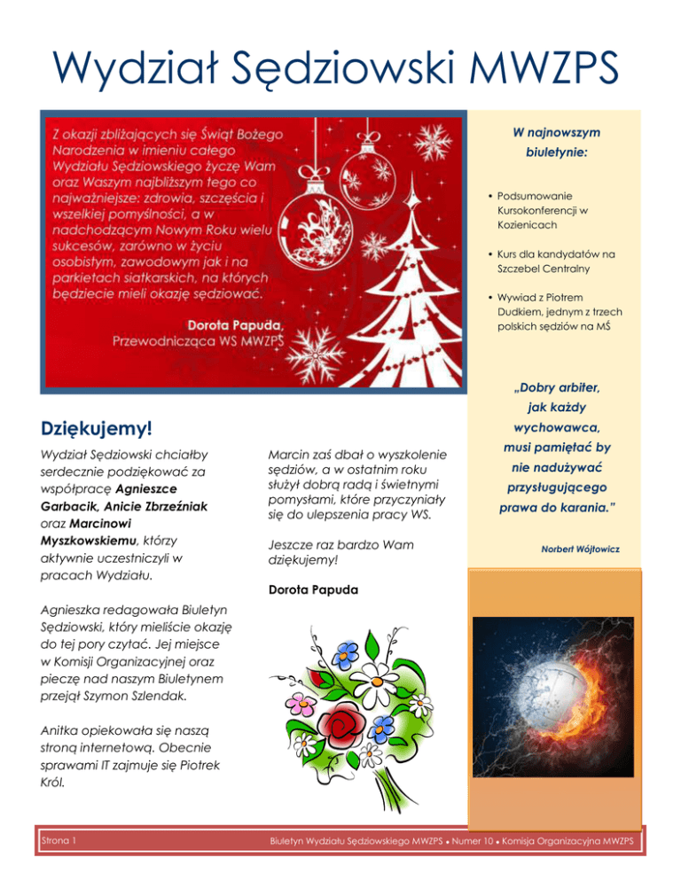 Wydział Sędziowski MWZPS W najnowszym biuletynie: • Podsumowanie Kursokonferencji w Kozienicach • Kurs dla kandydatów na Szczebel Centralny • Wywiad z Piotrem Dudkiem, jednym z trzech polskich sędziów na MŚ „Dobry arbiter, jak każdy Dziękujemy! Wydział Sędziowski chciałby serdecznie podziękować za współpracę Agnieszce Garbacik, Anicie Zbrzeźniak oraz Marcinowi Myszkowskiemu, którzy aktywnie uczestniczyli w pracach Wydziału. wychowawca, Marcin zaś dbał o wyszkolenie sędziów, a w ostatnim roku służył dobrą radą i świetnymi pomysłami, które przyczyniały się do ulepszenia pracy WS. Jeszcze raz bardzo Wam dziękujemy! musi pamiętać by nie nadużywać przysługującego prawa do karania.” Norbert Wójtowicz Dorota Papuda Agnieszka redagowała Biuletyn Sędziowski, który mieliście okazję do tej pory czytać. Jej miejsce w Komisji Organizacyjnej oraz pieczę nad naszym Biuletynem przejął Szymon Szlendak. Anitka opiekowała się naszą stroną internetową. Obecnie sprawami IT zajmuje się Piotrek Król. Strona 1 Biuletyn Wydziału Sędziowskiego MWZPS ● Numer 10 ● Komisja Organizacyjna MWZPS WIGILIA SĘDZIOWSKA Tradycją stały się nasze spotkania sędziowskie przy wigilijnym stole. Tym razem spotkaliśmy się 12 grudnia w Radisson Blu Sobieski Hotel w Warszawie przy wspólnym opłatku. Świetną obsługę cateringową, zagwarantowała nam firma LaQuzin, prowadzona przez Pana Pawła Kalbarczyka, niegdyś Zastępcę Szefa Kuchni w restauracji Platter by Karol Okrasa. Taka uroczystość była dla nas świetną okazją do spotkania i integracji naszego grona sędziowskiego. W Wigilii uczestniczyło ponad 50 osób. Oby w kolejnym roku było nas jeszcze więcej i każdy z sędziów znalazł czas, aby w ten jeden wieczór w roku spotkać się z całą sędziowską rodziną. Trzeba również wspomnieć, że organizacja naszej sędziowskiej wigilii to w dużej mierze zasługa Jacka Kociałkowskiego, Leszka Papieża i Szymona Szlendaka, którzy przyczynili się do tego, aby to spotkanie miało taki wspaniały i odświętny wymiar. Kartka świąteczna podpisana przez sędziów mazowieckich podczas Wigilii w roku 2012. Dorota Papuda WITAMY NOWYCH SĘDZIÓW! Po ukończonym Kursie na Kandydatów na Sędziów MWZPS możemy z dumą powitać w naszym gronie nowe twarze! A są to: AGATA BITOWT, IZABELA BRUTKOWSKA, MICHAŁ GAŁYGA, TOMASZ GORYCA, KRZYSZTOF JANKOWSKI, DOMINIK JĘDRAK, MAGDALENA KOBZA, MARTYNA KWIATKOWSKA, MONIKA LIPIŃSKA, MARIUSZ MICHAŁOWSKI, EWA PODKALICKA, ALEKSANDRA RÓŻANKA, MATEUSZ STĘPIEŃ. Życzymy Wam wytrwałości oraz samych trafnych decyzji! Z przyjemnością witamy również sędziów, którzy przenieśli się do nas z innych województw! I tak wzmocniliśmy się o czterech reprezentantów Świętokrzyskiego Związku Piłki Siatkowej: GAŁECKA EWA, MARUSZAK ALEKSANDRA, SOKOŁOWICZ TOMASZ, OSIAKOWSKI ALEKSANDER oraz po jednym arbitrze z Łódzkiego ZPS: MAKARUK AGNIESZKA i Lubelskiego ZPS: CIEŚLAK MATEUSZ. Miło nam będzie z Wami współpracować! Strona 2 Biuletyn Wydziału Sędziowskiego MWZPS ● Numer 10 ● Komisja Organizacyjna MWZPS Polscy Sędziowie na Mistrzostwach Świata w Piłce Siatkowej Mężczyzn Jak wszyscy dobrze wiemy, we wrześniu w Polsce odbyły się Mistrzostwa Świata w Piłce Siatkowej Mężczyzn. Zakończyły się one wielkim sukcesem sportowym, jakim nie wątpliwie są złote medale dla Reprezentacji Polski. Wydarzeniem wartym uwagi jest również udział trzech polskich arbitrów w tym turnieju. Sędzią rezerwowym był Paweł Burkiewicz. Pierwszą fazę turnieju w Katowicach sędziował Wojciech Maroszek, a najdłużej, bo aż trzy fazy Piotr Dudek. Tego ostatniego poprosiliśmy o kilka słów komentarza na temat swojego udziału w turnieju Mistrzostw Świata w Piłce Siatkowej Mężczyzn Polska 2014. Proszę zdradzić jak wyglądały przygotowania do tak ważnego turnieju? Przygotowania do MŚ wyglądały w moim wypadku tradycyjnie, nie była to moja pierwsza tak duża impreza, więc doświadczenie podpowiadało co trzeba było zrobić. Przygotowania to: sędziowanie meczów towarzyskich plus mocniejsze niż zwykle pochylenie się nad przepisami gry i aktualnymi wytycznymi dla sędziów. Przed MŚ przesędziowałem kilka spotkań, w tym 3 mecze na Memoriale im. Huberta Wagnera, więc od strony czysto sędziowskiej nie bałem się tej imprezy. Nowinki, związane z pracą SII przetestowałem wcześniej na meczach Ligi Światowej. W którym momencie zawodów pojawił się największy stres? A może nie było go wcale? Stres towarzyszy mi zawsze na meczach, jest to niejako wpisane w to moje hobby… ważne jest aby nie dać tego po sobie poznać. Osobiście nie wierzę aby sędzia nie był pod stresem , a szczególnie podczas meczów na MŚ. Dla mnie dodatkowym stresem było to, Strona 3 Na zdjęciach polscy sędziowie piłki siatkowej sędziujący Mistrzostwa Świata: Piotr Dudek i Wojciech Maroszek. Biuletyn Wydziału Sędziowskiego MWZPS ● Numer 10 ● Komisja Organizacyjna MWZPS że sędziowałem w Polsce, u siebie. Paradoksalnie największy stres był na meczu finałowym, którego nie sędziowałem. Który mecz, prowadzony przez Ciebie okazał się najtrudniejszy? Każdy mecz na MŚ jest trudny, każdy miał podczas tego Mundialu swoją specyfikę. Dla mnie mecze w Gdańsku były chyba najtrudniejsze, tam zespoły walczyły o wejście do II fazy turnieju, więc i czasami dramaturgia tych meczy była duża, np. mecz Kanada – Bułgaria 3:2, gdzie Bułgarzy mieli w 4 secie 2 piłki meczowe i go przegrali. Przesędziowałem na tych MŚ 10 meczy , 5 jako SI i 5 jako SII. Miałeś okazję współpracy z sędziami z innych państw, jak oni czuli się na turnieju w Polsce? Sędziowie z innych państw byli bardzo zadowoleniu z pobytu i sędziowania w Polsce. Podkreślali to na każdym kroku. Podkreślali doskonałą organizację, nie tylko samego turnieju, ale całej jego otoczki, byli pod wrażeniem og
