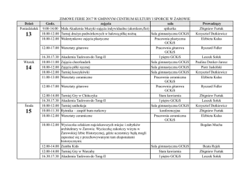 Dzień Poniedziałek 13 Wtorek 14 Środa 15 ZIMOWE FERIE 2017 W GMINNYM CENTRUM KULTURY I SPORCIE W ŻAROWIE Godz. zajęcia sala 9.00-14.00 Mała Akademia Muzyki-zajęcia indywidualne (akordeon,flet) spikerka 10.00-12.00 Turnej drużyn podwórkowych w halową piłkę nożną Sala gimnastyczna GCKiS 10.00-12.00 Walentynkowe zajęcia plastyczne Pracownia plastyczna GCKiS 12.00-17.00 Warsztaty gitarowe Pracownia gitarowa GCKiS 16.30.17.30 Akademia Taekwon-do Tong-Il I piętro GCKiS 10.00-11.00 Zajęcia cheerleaderk Sala gimnastyczna GCKiS 10.00-12.00 Zajęcia piłki ręcznej Sala gimnastyczna GCKiS 10.00-12.00 Turniej koszykówki Sala gimnastyczna GCKiS 11.00-13.00 Warsztaty ceramiczne Pracownia ceramiczna GCKiS 12.00-17.00 Warsztaty gitarowe Pracownia gitarowa GCKiS 12.00-14.00 Turniej Gry w Chińczyka Stara kawiarnia 16.30.17.30 Akademia Taekwon-do Tong-Il I piętro GCKiS 10.00-12.00 Turniej unihokeja Sala gimnastyczna GCKiS 10.00-11.30 Rytmika – zaspół bum-rurkowy konferencyjna 10.00-12.00 Warsztaty ceramiczne Pracownia ceramiczna GCKiS 10.00-12.00 Wycieczka szlakiem najciekawszych miejsc i zabytków architektury w Żarowie. Wycieczkę zakończy wizyta w Żarowskiej Izbie Historycznej, gdzie uczestnicy będą mogli zapoznać się z przechowywanymi tam eksponatami historycznymi. 12.00-14.00 Zumba Kids Sala gimnastyczna GCKiS 12.00-14.00 Turniej Gry w Warcaby Stara kawiarnia 16.30.17.30 Akademia Taekwon-do Tong-Il I piętro GCKiS Prowadzący Zbigniew Furtak Krzysztof Dutkiewicz Elżbieta Kulas Ryszard Fidler Leszek Sołek Paulina Denker-Jarosz Piotr Jaskólski Krzysztof Dutkiewicz Elżbieta Kulas Ryszard Fidler Zbigniew Furtak Leszek Sołek Krzysztof Dutkiewicz Zbigniew Furtak Elżbieta Kulas Bogdan Mucha Beata Rejek Zbigniew Furtak Leszek Sołek Czwartek 16 Piątek 17 Poniedziałek 20 9.00-11.00 10.00-15.00 10.00-11.00 10.00-12.00 11.00-13.00 Turniej dzikich drużyn w piłkę ręczną Mała Akademia Muzyki-zajęcia indywidualne(kyboard) Zajęcia cheerleaderk Turniej piłkarzyków stołowych Warsztaty plastyczne – papiero-plastyka 16.30.17.30 10.00-11.30 10.00-14.00 10.00-12.00 Akademia Taekwon-do Tong-Il Rytmika – zaspół bum-rurkowy Dziecięcy turniej piłkarski – turniej zamknięty Warsztaty ceramiczne 13.00-14.00 Warsztaty muzyczne dla dzieci 16.30.17.30 Akademia Taekwon-do Tong-Il 9.00-14.00 Mała Akademia Muzyki-zajęcia indywidualne (akordeon, flet) 10.00-12.00 Warsztaty plastyczne – "Zima na wiele sposobów" 12.00-17.00 Warsztaty gitarowe Wtorek 21 Środa 16.30.17.30 10.00-11.00 10.00-12.00 11.00-13.00 12.00-17.00 Akademia Taekwon-do Tong-Il Zajęcia cheerleaderk Zajęcia piłki ręcznej Warsztaty ceramiczne Warsztaty gitarowe 12.00-14.00 16.30.17.30 10.00-12.00 10.00-12.00 Turniej Gry w Chińczyka Akademia Taekwon-do Tong-Il Mała Akademia Muzyki-zespół kyboardowy Warsztaty plastyczne – nauka szkicu Sala gimnastyczna GCKiS Pracownia muzyczna Sala gimnastyczna GCKiS Sala gimnastyczna GCKiS Pracownia plastyczna GCKiS I piętro GCKiS konferencyjna Sala gimnastyczna GCKiS Pracownia ceramiczna GCKiS Stara kawiarnia I piętro GCKiS spikerka Piotr Jaskólski Zbigniew Furtak Paulina Denker-Jarosz Krzysztof Dutkiewicz Elżbieta Kulas Pracownia plastyczna GCKiS Pracownia gitarowa GCKiS I piętro GCKiS Sala gimnastyczna GCKiS Sala gimnastyczna GCKiS Pracownia ceramiczna Pracownia gitarowa GCKiS Stara kawiarnia I piętro GCKiS Pracownia muzyczna Pracownia plastyczna Elżbieta Kulas Leszek Sołek Zbigniew Furtak Krzysztof Dutkiewicz Elżbieta Kulas Zbigniew Furtak Leszek Sołek Zbigniew Furtak Ryszard Fidler Leszek Sołek Paulina Denker-Jarosz Piotr Jaskólski Elżbieta Kulas Ryszard Fidler Zbigniew Furtak Leszek Sołek Zbigniew Furtak Elżbieta Kulas 22 Czwartek 23 Piątek 24 10.00.12.00 Prelekcja w GCKiS zatytułowana "Zabytki zarchitektury w miejscowościach gminy Żarów". Dodatkowo możliwość obejrzenia drobnych znalezisk-zabytków z obszaru gminy Żarów. 12.00-14.00 Zumba Kids 16.30.17.30 Akademia Taekwon-do Tong-Il 10.00-11.30 Mała Akademia Muzyki-zespół kyboardowy 10.00-11.00 Zajęcia cheerleaderk 10.00-12.00 Warsztaty ceramiczne 10.00-12.00 Zajęcia piłki ręcznej 12.00-14.00 Turniej Gry w Warcaby 16.30.17.30 Akademia Taekwon-do Tong-Il 10.00-11.30 Rytmika – zaspół bum-rurkowy 13.00-14.00 Warsztaty muzyczne dla dzieci 16.30.17.30 Akademia Taekwon-do Tong-Il Bogdan Mucha Sala gimnastyczna GCKiS I piętro GCKiS Pracownia muzyczna Sala gimnastyczna GCKiS Pracownia ceramiczna Sala gimnastyczna GCKiS Stara kawiarnia I piętro GCKiS konferencyjna Stara kawiarnia I piętro GCKiS Beata Rejek Leszek Sołek Zbigniew Furtak Paulina Denker-Jarosz Elżbieta Kulas Piotr Jaskólski Zbigniew Furtak Leszek Sołek Zbigniew Furtak Zbigniew Furtak Leszek Sołek