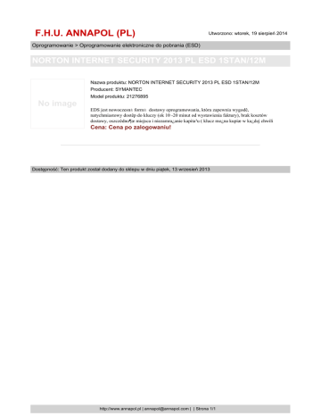 F.H.U. ANNAPOL (PL) Utworzono: wtorek, 19 sierpień 2014 Oprogramowanie > Oprogramowanie elektroniczne do pobrania (ESD) NORTON INTERNET SECURITY 2013 PL ESD 1STAN/12M Nazwa produktu: NORTON INTERNET SECURITY 2013 PL ESD 1STAN/12M Producent: SYMANTEC Model produktu: 21276895 No image EDS jest nowoczesn± form± dostawy oprogramowania, która zapewnia wygodê, natychmiastowy dostêp do kluczy (ok 10 -20 minut od wystawienia faktury), brak kosztów dostawy, oszczêdno¶æ miejsca i niezamra¿anie kapita³u ( klucz mo¿na kupiæ w ka¿dej chwili Cena: Cena po zalogowaniu! Dostępność: Ten produkt został dodany do sklepu w dniu piątek, 13 wrzesień 2013 http://www.annapol.pl | [email protected] | | Strona 1/1