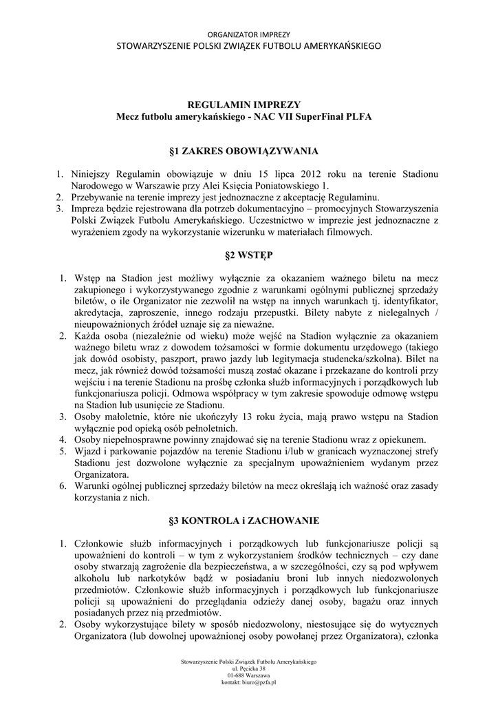 ORGANIZATOR IMPREZY STOWARZYSZENIE POLSKI ZWIĄZEK FUTBOLU AMERYKAŃSKIEGO REGULAMIN IMPREZY Mecz futbolu amerykańskiego - NAC VII SuperFinał PLFA §1 ZAKRES OBOWIĄZYWANIA 1. Niniejszy Regulamin obowiązuje w dniu 15 lipca 2012 roku na terenie Stadionu Narodowego w Warszawie przy Alei Księcia Poniatowskiego 1. 2. Przebywanie na terenie imprezy jest jednoznaczne z akceptację Regulaminu. 3. Impreza będzie rejestrowana dla potrzeb dokumentacyjno – promocyjnych Stowarzyszenia Polski Związek Futbolu Amerykańskiego. Uczestnictwo w imprezie jest jednoznaczne z wyrażeniem zgody na wykorzystanie wizerunku w materiałach filmowych. §2 WSTĘP 1. Wstęp na Stadion jest możliwy wyłącznie za okazaniem ważnego biletu na mecz zakupionego i wykorzystywanego zgodnie z warunkami ogólnymi publicznej sprzedaży biletów, o ile Organizator nie zezwolił na wstęp na innych warunkach tj. identyfikator, akredytacja, zaproszenie, innego rodzaju przepustki. Bilety nabyte z nielegalnych / nieupoważnionych źródeł uznaje się za nieważne. 2. Każda osoba (niezależnie od wieku) może wejść na Stadion wyłącznie za okazaniem ważnego biletu wraz z dowodem tożsamości w formie dokumentu urzędowego (takiego jak dowód osobisty, paszport, prawo jazdy lub legitymacja studencka/szkolna). Bilet na mecz, jak również dowód tożsamości muszą zostać okazane i przekazane do kontroli przy wejściu i na terenie Stadionu na prośbę członka służb informacyjnych i porządkowych lub funkcjonariusza policji. Odmowa współpracy w tym zakresie spowoduje odmowę wstępu na Stadion lub usunięcie ze Stadionu. 3. Osoby małoletnie, które nie ukończyły 13 roku życia, mają prawo wstępu na Stadion wyłącznie pod opieką osób pełnoletnich. 4. Osoby niepełnosprawne powinny znajdować się na terenie Stadionu wraz z opiekunem. 5. Wjazd i parkowanie pojazdów na terenie Stadionu i/lub w granicach wyznaczonej strefy Stadionu jest dozwolone wyłącznie za specjalnym upoważnieniem wydanym przez Organizatora. 6. Warunki ogólnej publicznej sprzedaży biletów na mecz określają ich ważność oraz zasady korzystania z nich. §3 KONTROLA i ZACHOWANIE 1. Członkowie służb informacyjnych i porządkowych lub funkcjonariusze policji są upoważnieni do kontroli – w tym z wykorzystaniem środków technicznych – czy dane osoby stwarzają zagrożenie dla bezpieczeństwa, a w szczególności, czy są pod wpływem alkoholu lub narkotyków bądź w posiadaniu broni lub innych niedozwolonych przedmiotów. Członkowie służb informacyjnych i porządkowych lub funkcjonariusze policji są upoważnieni do przeglądania odzieży danej osoby, bagażu oraz innych posiadanych przez nią przedmiotów. 2. Osoby wykorzystujące bilety w sposób niedozwolony, niestosujące się do wytycznych Organizatora (lub dowolnej upoważnionej osoby powołanej przez Organizatora), członka Stowarzyszenie Polski Związek Futbolu Amerykańskiego ul. Pęcicka 38 01-688 Warszawa kontakt: [email protected] ORGANIZATOR IMPREZY STOWARZYSZENIE POLSKI ZWIĄZEK FUTBOLU AMERYKAŃSKIEGO 3. 4. 5. 6. 7. służb informacyjnych i porządkowych lub funkcjonariusza policji na Stadionie, stwarzające zagrożenie dla bezpieczeństwa bądź objęte lokalnym, krajowym lub zagranicznym zakazem wstępu na imprezę masową nie zostaną wpuszczone na Stadion i są zobowiązane niezwłocznie zwrócić bilet do Organizatora, bez prawa do jakiegokolwiek zwrotu pieniężnego z tego tytułu. Osoby przebywające na terenie Stadionu podczas trwania imprezy masowej są bezwzględnie zobowiązane do zachowania zgodnego z zasadami bezpieczeństwa, w sposób nie zagrażający zdrowiu i życiu innych uczestników imprezy masowej oraz do wykonywania poleceń służby informacyjnej, służby porządkowej, spikera oraz Policji. Od momentu wejścia na trybuny Stadionu, wszystkie osoby zobowiązane są zajmować wyłącznie miejsca im przypisane w posiadanym bilecie na mecz i korzystać z wyznaczonych ścieżek poruszania się. Każdy posiadacz biletu zobowiązuje się do zmiany miejsca wskazanego na bilecie, jeżeli zostanie o to poproszony przez przedstawicieli służb informacyjnych i porządkowych lub funkcjonariuszy policji. Jeżeli ktokolwiek otrzyma informację / wiadomość o szkodach wyrządzonych w mieniu lub w wyniku wypadku, powinien niezwłocznie podjąć kroki w celu powiadomienia o tym Organizatora (lub dowolnej upoważnionej osoby powołanej przez Organizatora), członka służb informacyjnych i porządkowych lub funkcjonariusza policji na Stadionie. Możliwe jest wprowadzenie dalszych wyjątkowych środków kontroli w celu zapobieżenia zagrożeniu życia, zdrowia lub mienia bądź zmniejszenia lub wyeliminowania takiego zagrożenia. Wytyczne wydane przez członków służb informacyjnych i porządkowych lub funkcjonariuszy policji muszą być przestrzegane, a odmowa współpracy może skutkować usunięciem ze Stadionu. Kto nie wykonuje polecenia porządkowego, wydanego na podstawie ustawy, regulaminu obiektu (terenu) lub regulaminu imprezy masowej przez służby porządkowe lub służby informacyjne, podlega karze grzywny nie niższej niż 2000 zł (Art. 54. Ustawy o bezpieczeństwie imprez masowych z dnia 20 marca 2009 roku) §4 ZAKAZY 1. Osoby obecne na meczu nie mogą rejestrować, wykorzystywać ani przesyłać dźwięku, obrazu lub opisu Stadionu lub meczu (w tym wyniku, statystyki, informacji lub innych danych dotyczących meczu) do użytku innego niż prywatny. Surowo zabronione jest rozpowszechnianie przez internet, radio, telewizję lub za pośrednictwem innych współczesnych lub przyszłych mediów, dźwięku, obrazu, opisu, nagrań, wyniku lub statystyki ze Stadionu lub z meczu w całości lub w części bądź pomaganie innej osobie/innym osobom w takich działaniach. Za wyjątkiem otrzymania zgody organizatora. 2. Surowo zabrania się podejmowania na terenie Stadionu między innymi następujących działań: a) rzucania przedmiotami lub wy