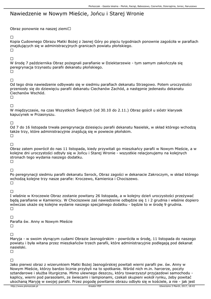 Płońszczak - Gazeta lokalna - Płońsk, Raciąż, Baboszewo, Czerwińsk, Dzierzążnia, Joniec, Naruszewo Nawiedzenie w Nowym Mieście, Jońcu i Starej Wronie Obraz ponownie na naszej ziemi Kopia Cudownego Obrazu Matki Bożej z Jasnej Góry po pięciu tygodniach ponownie zagościła w parafiach znajdujących się w administracyjnych granicach powiatu płońskiego. W środę 7 października Obraz pożegnali parafianie w Dziektarzewie - tym samym zakończyła się peregrynacja trzynastu parafii dekanatu płońskiego. Od tego dnia nawiedzenie odbywało się w siedmiu parafiach dekanatu Strzegowo. Potem uroczystości przeniosły się do dziewięciu parafii dekanatu Ciechanów Zachód, a następnie jedenastu dekanatu Ciechanów Wschód. W międzyczasie, na czas Wszystkich Świętych (od 30.10 do 2.11.) Obraz gościł u sióstr klarysek kapucynek w Przasnyszu. Od 7 do 16 listopada trwała peregrynacja dziesięciu parafii dekanatu Nasielsk, w skład którego wchodzą także trzy, które administracyjnie znajdują się w powiecie płońskim. Obraz zatem powrócił do nas 11 listopada, kiedy przywitali go mieszkańcy parafii w Nowym Mieście, a w kolejne dni uroczystości odbyły się w Jońcu i Starej Wronie - wszystkie relacjonujemy na kolejnych stronach tego wydania naszego dodatku. Po peregrynacji siedmiu parafii dekanatu Serock, Obraz zagości w dekanacie Zakroczym, w skład którego wchodzą kolejne trzy nasze parafie: Kroczewo, Kamienica i Chociszewo. I właśnie w Kroczewie Obraz zostanie powitany 26 listopada, a w kolejny dzień uroczystości przeżywać będą parafianie w Kamienicy. W Chociszewie zaś nawiedzenie odbędzie się 1 i 2 grudnia i właśnie dopiero wówczas ukaże się kolejne wydanie naszego specjalnego dodatku - będzie to w środę 9 grudnia. Parafia św. Anny w Nowym Mieście Maryja - w swoim słynącym cudami Obrazie Jasnogórskim - powróciła w środę, 11 listopada do naszego powiatu i była witana przez mieszkańców trzech parafii, które administracyjnie podlegają pod dekanat nasielski. Jako pierwsi obraz z wizerunkiem Matki Bożej Jasnogórskiej powitali wierni parafii pw. św. Anny w Nowym Mieście, którzy bardzo licznie przybyli na to spotkanie. Wśród nich m.in. harcerze, poczty sztandarowe i służba liturgiczna. Mimo ulewnego deszczu, który towarzyszył przyjazdowi samochodu kaplicy, wierni pod parasolami, ze świecami i lampionami, czekali skupieni wokół rynku, żeby powitać ukochaną Maryję w swojej parafii. Przez pogodę powitanie obrazu odbyło się w kościele, a nie - jak jest http://www.plonszczak.pl Kreator PDF Utworzono 3 March, 2017, 18:43 Płońszczak - Gazeta lokalna - Płońsk, Raciąż, Baboszewo, Czerwińsk, Dzierzążnia, Joniec, Naruszewo to przyjęte - w miejscu oczekiwania, które tak jak cały nowomiejski rynek było przystrojone biało-żółtymi kwiatami oraz palącymi się lampionami. Nie było też tradycyjnej procesji, w której wybrane grupy niosły wizerunek Maryi do świątyni. Proboszcz parafii ks. Wojciech Brzozowski z biskupem pomocniczym płockim Romanem Marcinkowskim wizerunek Matki Bożej Jasnogórskiej powitali w progu świątyni, a następnie druhowie Ochotniczej Straży Pożarnej wnieśli i ustawili obraz na specjalnie przygotowanym tronie, a proboszcz parafii w Klukowie przekazał Ewangeliarz towarzyszący wizerunkowi. Gdy tylko ikona została ustawiona na tronie, przedstawiciele parafii powitali Matkę w swojej parafii. Jako pierwszy w imieniu całej parafii i wszystkich wiernych Maryję powitał proboszcz Brzozowski, który zawierzył Jej opiece całą parafię. - Matko, 16 marca 1966 r. byłaś obecna w tym wizerunku w naszym kościele, w naszej parafii. Kilkanaście osób jest dzisiaj przed Tobą z tamtego nawiedzenia. Proboszczem wówczas był śp. ks. Józef Kardynał. Dziś ja witam Cię, Przenajświętsza Matko. Twoja matka - św. Anna - jest od siedmiu wieków patronką i opiekunką naszej parafii, a zatem jesteś Maryjo jakże mocno związana z nami - mówił proboszcz. Dodawał, że wierni parafii czczą Maryję poprzez siedem kół żywego różańca, nabożeństwa, które są odprawiane w każdą sobotę oraz grupę ponad stu wiernych, którzy przyjęli szkaplerz. - Pani Jasnogórska, przybyłaś do nas w postaci pięknego obrazu słynącego przez wieki cudami - mówili przedstawiciele rodzin. - Z całego serca witamy Cię w naszej świątyni. Cieszymy się i czujemy zaszczyceni, że możemy uklęknąć u Twych stóp - mówili pełni nadziei wierni. Młodzież prosiła Matkę Jasnogórską, żeby nauczyła ich wierności Jezusowi Chrystusowi oraz jego naukom i poleceniom. - Niech nasze młode życie rozwija się i kształtuje w Twojej szkole, Maryjo. Niech nasze serca będą czyste i niewinne, niech sumienia będą zdrowe, abyśmy mogli ze spokojem myśleć o przyszłości i brać za nią odpowiedzialność - prosili w imieniu młodych ich przedstawiciele. Jako ostatnie Maryję powitały dzieci, które wyraziły swoją radość z bycia z ukochaną Matką. Wszystkie grupy złożyły przed tronem Maryi kwiaty. Biskup Marcinkowski, który przewodniczył mszy otwierającej dobę nawiedzenia w nowomiejskiej parafii w swoim kazaniu nawiązał do wiszącego w głównym ołtarzu krzyża. - Jak wejdziesz do tego kościoła, to nie możesz nie zauważyć wielkiej postaci Jezusa zawieszonego na krzyżu - mówił biskup. - Ludzie ukrzyżowali miłość, która przyszła na świat, by nas wszystkich zbawić. A Jezus przyjmuje wszystko, co mu człowiek wymyślił. Przyjmuje cierpienie, jakie człowiek mu zadaje, przyjmuje bunt przeciw Bogu i złość przeciw człowiekowi. Jezus przyjmuje zdradę ucznia, wyszydzenie przez człowieka. Przyjmuje policzek wymierzony dla zabawy i ze złości. Przyjmuje niesprawiedliwy sąd. Co można wymyśleć przeciw człowiekowi, gdy się założy, że On musi zginąć? - pytał wiernych biskup. Dodawał, że zawsze znajdą się fałszywi świadkowie, którzy ulegną pokusie pie