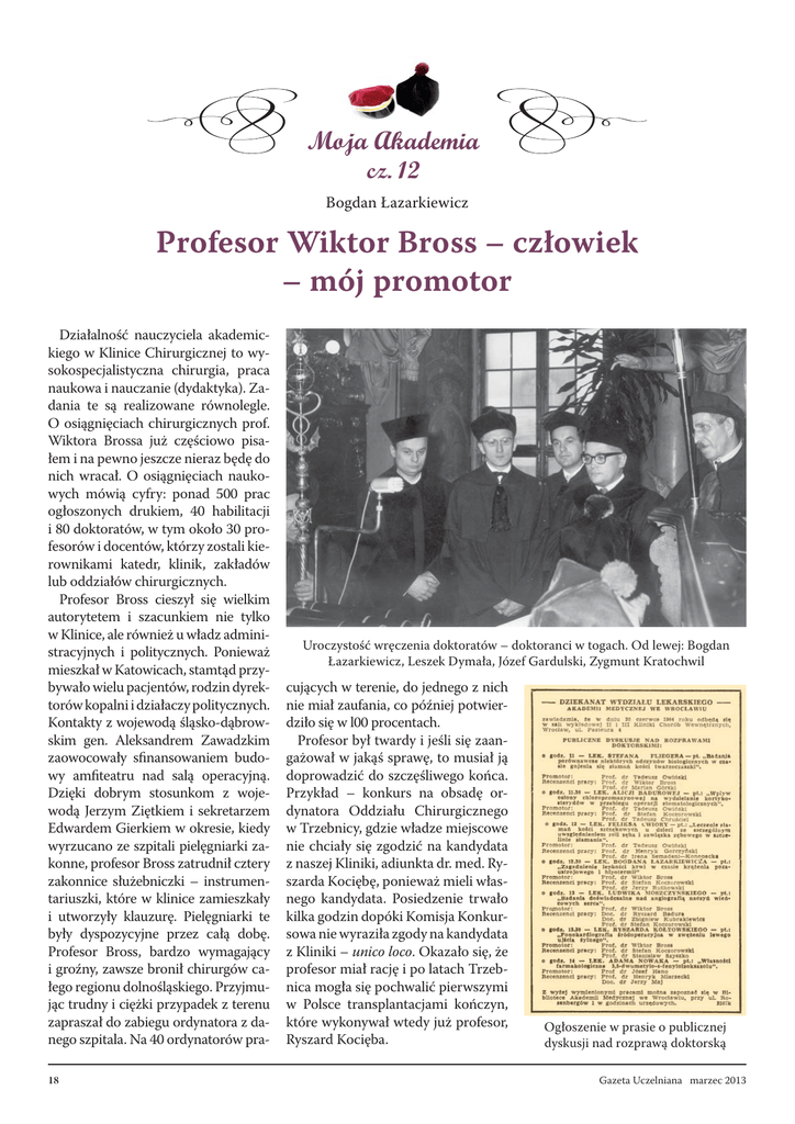 Moja Akademia cz. 12 Bogdan Łazarkiewicz Profesor Wiktor Bross – człowiek – mój promotor Działalność nauczyciela akademickiego w Klinice Chirurgicznej to wysokospecjalistyczna chirurgia, praca naukowa i nauczanie (dydaktyka). Zadania te są realizowane równolegle. O osiągnięciach chirurgicznych prof. Wiktora Brossa już częściowo pisałem i na pewno jeszcze nieraz będę do nich wracał. O osiągnięciach naukowych mówią cyfry: ponad 500 prac ogłoszonych drukiem, 40 habilitacji i 80 doktoratów, w tym około 30 profesorów i docentów, którzy zostali kierownikami katedr, klinik, zakładów lub oddziałów chirurgicznych. Profesor Bross cieszył się wielkim autorytetem i szacunkiem nie tylko w Klinice, ale również u władz administracyjnych i politycznych. Ponieważ mieszkał w Katowicach, stamtąd przybywało wielu pacjentów, rodzin dyrektorów kopalni i działaczy politycznych. Kontakty z wojewodą śląsko-dąbrowskim gen. Aleksandrem Zawadzkim zaowocowały sfinansowaniem budowy amfiteatru nad salą operacyjną. Dzięki dobrym stosunkom z wojewodą Jerzym Ziętkiem i sekretarzem Edwardem Gierkiem w okresie, kiedy wyrzucano ze szpitali pielęgniarki zakonne, profesor Bross zatrudnił cztery zakonnice służebniczki – instrumentariuszki, które w klinice zamieszkały i utworzyły klauzurę. Pielęgniarki te były dyspozycyjne przez całą dobę. Profesor Bross, bardzo wymagający i groźny, zawsze bronił chirurgów całego regionu dolnośląskiego. Przyjmując trudny i ciężki przypadek z terenu zapraszał do zabiegu ordynatora z danego szpitala. Na 40 ordynatorów pra18 Uroczystość wręczenia doktoratów – doktoranci w togach. Od lewej: Bogdan Łazarkiewicz, Leszek Dymała, Józef Gardulski, Zygmunt Kratochwil cujących w terenie, do jednego z nich nie miał zaufania, co później potwierdziło się w l00 procentach. Profesor był twardy i jeśli się zaangażował w jakąś sprawę, to musiał ją doprowadzić do szczęśliwego końca. Przykład – konkurs na obsadę ordynatora Oddziału Chirurgicznego w Trzebnicy, gdzie władze miejscowe nie chciały się zgodzić na kandydata z naszej Kliniki, adiunkta dr. med. Ryszarda Kociębę, ponieważ mieli własnego kandydata. Posiedzenie trwało kilka godzin dopóki Komisja Konkursowa nie wyraziła zgody na kandydata z Kliniki – unico loco. Okazało się, że profesor miał rację i po latach Trzebnica mogła się pochwalić pierwszymi w Polsce transplantacjami kończyn, które wykonywał wtedy już profesor, Ryszard Kocięba. Ogłoszenie w prasie o publicznej dyskusji nad rozprawą doktorską Gazeta Uczelniana marzec 2013 Jeśli miało się szczęście wyjechać z profesorem za granicę, co nie należało do rzadkości, ten groźny profesor stawał się prawie kolegą, pomagał i załatwiał wiele spraw. Bywało, że profesor wracając z Zachodu przywoził nie tylko najnowsze piśmiennictwo, ważne instrumenty chirurgiczne, ale np. sekretarkom rajstopy nylonowe, a asystentom białe koszule non-iron – u nas nieosiągalne. W Klinice po uzyskaniu specjalizacji drugiego stopnia przychodziła pora na doktorat. Pierwszy poruszył ten temat mój szef, profesor W. Bross. „Łazar, musisz brać się za doktorat...” Tu chciałbym przypomnieć, że w Klinice prawie każdy z chirurgów miał „ksywę” (Aron, Kochaś, Koczor, Kołtek, Kustrzyk, Łazar, Ormiaszka, Otuś, Rogol, Ryży, Słowik, Wrężel itp.) Ciekawie również określał kogoś, by nie nazwać go idiotą: „panie, pan ma wzmożone samopoczucie”. Hasło rzucone przez profesora było dla mnie nie tylko przyzwoleniem, ale przede wszystkim czynnikiem mobilizującym. Biorąc udział w prowadzeniu krążenia pozaustrojowego połączonego z oziębianiem (hipotermią), obserwując zaburzenia biochemiczne we krwi przepływającej przez aparat, a wśród nich bardzo dużą hemolizę, za którą odpowiedzialny był ówczesny oksygenator, szukając sposobów poprawiających hemodynamikę krążenia pozaustrojowego, postanowiłem przebadać zachowanie się lepkości krwi w czasie krążenia. Profesor po uzgodnieniu tematu w zasadzie dawał Profesor Jerzy Rutkowski – recenzent Gazeta Uczelniana marzec 2013 Profesorowie, wykładowcy przedmiotów klinicznych. Od lewej: Rudolf Arendt, Janina Czyżewska, Kazimierz Czyżewski, Wiktor Bross, Kazimierz Jabłoński, Zdzisław Wiktor, Tadeusz Owiński, Kazimierz Nowosad wolną rękę doktorantowi, nie wchodził w szczegóły, ale co jakiś czas zadawał pytanie „jak tam z twoim doktoratem?” I tu trzeba było zdać relację z postępu pracy lub pokazać wyniki, wysłuchać cennych i zawsze trafnych uwag. Po trzech latach rozprawa pt. Zagadnienie lepkości krwi w czasie krążenia pozaustrojowego i hipotermii była gotowa. Rada Wydziału Lekarskiego na wniosek promotora profesora W. Brossa wyznaczyła recenzentów, profesora Stefana Koczorowskiego z II Kliniki Chirurgicznej AM we Wrocławiu i prof. Jerzego Rutkowskiego z Kliniki Chirurgicznej AM w Warszawie. Wcześniej prof. W. Bross polecił mi przedstawić tę pracę na 4 Konferencji Naukowej Sekcji Torakochirurgicznej Towarzystwa Chirurgów Polskich w Poznaniu (24–25.01.1964 r.). Było to moje pierwsze publiczne wystąpienie z pracą naukową w ekskluzywnym gronie chirurgów polskich. 10 dni przed datą obrony pracy doktorskiej musiało ukazać się ogłoszenie w miejscowej prasie „o publicznej dyskusji nad rozprawą doktorską”, a tuż przed obroną trzeba było zdać egzamin z przedmiotu. Do dzisiaj pamiętam jedno z pytań, jakie zadał mi prof. J. Rutkowski: „Podciśnienie kontrolowane...” Profesora poznałem już wcześniej, ponieważ zgodnie z ówczesnym zwyczajem pojechałem do Warszawy, by przedstawić się recenzentowi. Wizyta była przyjemna i poza rozmową o doktoracie profesor uczył mnie, jak powinno się parzyć kawę (częstując). Następnie zaproponował zwiedzanie Warszawy jego samochodem marki ,,Moskwicz”, a przede wszystkim koś