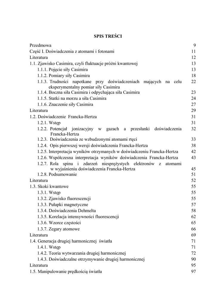 SPIS TREŚCI Przedmowa Część I. Doświadczenia z atomami i fotonami Literatura 1.1. Zjawisko Casimira, czyli fluktuacje próżni kwantowej 1.1.1. Pojęcie siły Casimira 1.1.2. Pomiary siły Casimira 1.1.3. Trudności napotkane przy doświadczeniach mających na celu .eksperymentalny pomiar siły Casimira 1.1.4. Boczna siła Casimira i odpychająca siła Casimira 1.1.5. Statki na morzu a siła Casimira 1.1.6. Znaczenie siły Casimira Literatura 1.2. Doświadczenie Francka-Hertza 1.2.1. Wstęp 1.2.2. Potencjał jonizacyjny w gazach a przesłanki doświadczenia Francka-Hertza 1.2.3. Doświadczenia ze wzbudzonymi atomami rtęci 1.2.4. Opis pierwszej wersji doświadczenia Francka-Hertza 1.2.5. Interpretacja wyników otrzymanych w doświadczeniu Francka-Hertza 1.2.6. Współczesna interpretacja wyników doświadczenia Francka-Hertza 1.2.7. Rola spinu i zdarzeń niesprężystych elektronów z atomami w wyjaśnieniu doświadczenia Francka-Hertza 1.2.8. Podsumowanie Literatura 1.3. Skoki kwantowe 1.3.1. Wstęp 1.3.2. Zjawisko fluorescencji 1.3.3. Pułapki magnetyczne 1.3.4. Doświadczenia Dehmelta 1.3.5. Korelacja intensywności fluorescencji 1.3.6. Wzorce częstości 1.3.7. Zegary atomowe Literatura 1.4. Generacja drugiej harmonicznej światła 1.4.1. Wstęp 1.4.2. Teoria wytwarzania drugiej harmonicznej 1.4.3. Doświadczalne otrzymywanie drugiej harmonicznej Literatura 1.5. Manipulowanie prędkością światła 9 11 12 13 13 18 22 23 24 27 29 31 31 32 33 38 42 43 45 51 52 55 55 55 57 58 62 65 66 69 71 71 72 90 95 97 1.5.1. Wstęp 1.5.2. Szybciej niż światło 1.5.3. Spowolnienie prędkości światła 1.5.4. Podsumowanie Literatura 1.6. Przesłanie informacji optycznej przez fale materii 1.6.1. Wstęp 1.6.2. Doświadczenie zespołu Lene Vestergaard Hau 1.6.3. Wyniki doświadczenia zespołu Lene Vestergaard Hau 1.6.4. Podsumowanie Literatura Część II. Doświadczenia ukazujące istotę spinu Literatura 2.1. Doświadczenie Sterna-Gerlacha – eksperymentalny dowód istnienia spinu 2.1.1. Wstęp 2.1.2. Kwantowy model atomu 2.1.3. Orbitalny moment pędu i moment magnetyczny elektronu 2.1.4. Spin elektronu 2.1.5. Otrzymywanie wiązek molekularnych 2.1.6. Doświadczenie Sterna-Gerlacha 2.1.7. Wyniki doświadczenia Sterna-Gerlacha 2.1.8. Szczegóły techniczne doświadczenia Sterna-Gerlacha 2.1.9. Analiza wyników doświadczenia Sterna-Gerlacha 2.1.10. Doświadczenie Phippsa i Taylora 2.1.11. Podsumowanie Literatura 2.2. Zjawisko Einsteina-de Haasa i zjawisko Barnetta 2.2.1. Wstęp 2.2.2. Doświadczenie A. Einsteina i W. J. Haasa 2.2.3. Doświadczenie S. J. Barnetta 2.2.4. Podsumowanie Literatura 2.3. Zjawisko spinowego efektu Halla 2.3.1. Wstęp 2.3.2. Teoretyczne przewidywania spinowego zjawiska Halla 2.3.3. Doświadczalna weryfikacja spinowego zjawiska Halla 2.3.4. Spintronika 2.3.5. Gigantyczny magnetoopór (GMR) 2.3.6. Podsumowanie Literatura 2.4. Skręcone światło 97 98 103 109 109 111 111 112 114 117 117 119 120 121 121 122 124 130 133 135 136 138 139 141 142 143 145 145 145 154 158 159 161 161 163 164 171 175 181 181 183 2.4.1. Wstęp 2.4.2. Spinowy i orbitalny moment pędu fotonu 2.4.3. Równanie falowe Maxwella i wektor Poyntinga 2.4.4. Mody Hermite’a-Gaussa i Laguerre’a-Gaussa 2.4.5. Tworzenie wiązek mających orbitalny moment pędu 2.4.6. Przenoszenie orbitalnego momentu pędu ze światła do materii 2.4.7. Reprezentacja wiązek ze spinowym i orbitalnym momentem .pędu 2.4.8. Podsumowanie Dodatek 2.4. Opis wiązek w terminach modów Hermite'a-Gaussa i Laguerre'a-Gaussa. Literatura 2.5. Paradoks Einsteina-Podolsky’ego-Rosena (EPR), nierówność Bella i teleportacja kwantowa 2.5.1. Wstęp 2.5.2. Paradoks Einsteina-Podolsky’ego-Rosena (EPR) 2.5.3. Zasada separowalności (lokalnego realizmu) i nierówność Bella 2.5.4. Doświadczalna weryfikacja naruszenia nierówności Bella 2.5.5. Wyprowadzenie nierówności Bella 2.5.6. Teleportacja kwantowa 2.5.7. Informacja kwantowa i stany splątane 2.5.8. Model teoretyczny doświadczenia z teleportacją fotonów 2.5.9. Realizacja doświadczalna teleportacji fotonów 2.5.10. Podsumowanie Literatura Spis tabel Spis ilustracji Spis fotografii Skorowidz nazwisk Skorowidz rzeczowy 183 183 184 185 189 191 194 196 197 201 203 203 203 205 206 211 215 216 218 221 227 227 229 231 237 239 243