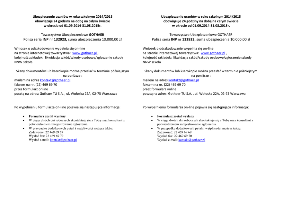 Ubezpieczenie uczniów w roku szkolnym 2014/2015 obowiązuje 24 godziny na dobę na całym świecie w okresie od 01.09.2014-31.08.2015r. Ubezpieczenie uczniów w roku szkolnym 2014/2015 obowiązuje 24 godziny na dobę na całym świecie w okresie od 01.09.2014-31.08.2015r. Towarzystwo Ubezpieczeniowe GOTHAER Towarzystwo Ubezpieczeniowe GOTHAER Polisa seria INP nr 132923, suma ubezpieczenia 10.000,00 zł Polisa seria INP nr 132923, suma ubezpieczenia 10.000,00 zł Wniosek o odszkodowanie wypełnia się on-line na stronie internetowej towarzystwa: www.gothaer.pl , kolejność zakładek: likwidacja szkód/szkody osobowe/zgłoszenie szkody NNW szkoła Wniosek o odszkodowanie wypełnia się on-line na stronie internetowej towarzystwa: www.gothaer.pl , kolejność zakładek: likwidacja szkód/szkody osobowe/zgłoszenie szkody NNW szkoła Skany dokumentów lub kserokopie można przesłać w terminie późniejszym na poniższe : mailem na adres [email protected] faksem na nr. (22) 469 69 70 przez formularz online pocztą na adres: Gothaer TU S.A. , ul. Wołoska 22A, 02-75 Warszawa Skany dokumentów lub kserokopie można przesłać w terminie późniejszym na poniższe : mailem na adres [email protected] faksem na nr. (22) 469 69 70 przez formularz online pocztą na adres: Gothaer TU S.A. , ul. Wołoska 22A, 02-75 Warszawa Po wypełnieniu formularza on-line pojawia się następująca informacja: Po wypełnieniu formularza on-line pojawia się następująca informacja: Formularz został wysłany W ciągu dwóch dni roboczych skontaktuje się z Tobą nasz konsultant z potwierdzeniem zarejestrowanie zgłoszenia. W przypadku dodatkowych pytań i wątpliwości możesz także: Zadzwonić: 22 469 69 69 Wysłać fax: 22 469 69 70 Wysłać e-mail: [email protected] Formularz został wysłany W ciągu dwóch dni roboczych skontaktuje się z Tobą nasz konsultant z potwierdzeniem zarejestrowanie zgłoszenia. W przypadku dodatkowych pytań i wątpliwości możesz także: Zadzwonić: 22 469 69 69 Wysłać fax: 22 469 69 70 Wysłać e-mail: [email protected]