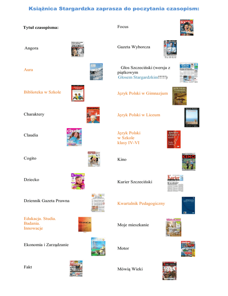 Książnica Stargardzka zaprasza do poczytania czasopism: Tytuł czasopisma: Focus Angora Gazeta Wyborcza Aura Głos Szczeciński (wersja z piątkowym Głosem Stargardzkim!!!!!) Biblioteka w Szkole Język Polski w Gimnazjum Charaktery Język Polski w Liceum Claudia Język Polski w Szkole klasy IV-VI Cogito Kino Dziecko Dziennik Gazeta Prawna Edukacja. Studia. Badania. Innowacje Ekonomia i Zarządzanie Fakt Kurier Szczeciński Kwartalnik Pedagogiczny Moje mieszkanie Motor Mówią Wieki Nasz Dziennik Poradnik Bibliotekarza Nauczanie Początkowe Poradnik Domowy Newsweek Problemy Opiekuńczo – Wychowawcze Niepełnosprawność – Zagadnienia, Problemy, Rozwiązania Przegląd Nowa Szkoła Przegląd Sportowy. Dziennik Nowe Horyzonty Edukacji Przegląd Zachodni Nowe Książki Remedium Pamiętnik Literacki Rzeczpospolita Pani Studia Socjologiczne PC Format DVD Super Express Pedagogika Społeczna Szkoła Specjalna Polityka Świat Kobiety Wiadomości Wędkarskie Świerszczyk Wiedza i Życie Teraz Rock Wprost Tygodnik Powszechny Współczesne Pielęgniarstwo i Ochrona Zdrowia Uroda Życia Wychowanie Fizyczne i Zdrowotne Uważam Rze Wychowanie w Przedszkolu Victor Gimnazjalista Wysokie Obcasy Extra Victor Junior Zdrowie Viva Życie Szkoły Wena Działy Książnicy w których znajdują się czasopisma: Czytelnia (parter) Dział Pedagogiczny (1 piętro) Dział Dziecięco-Młodzieżowy (1 piętro) Dział Multimedialny (2 piętro)(bieżące czasopismo znajduje się w Czytelni Głównej i Informatorium, archiwalne w Dziale Multimedialnym)