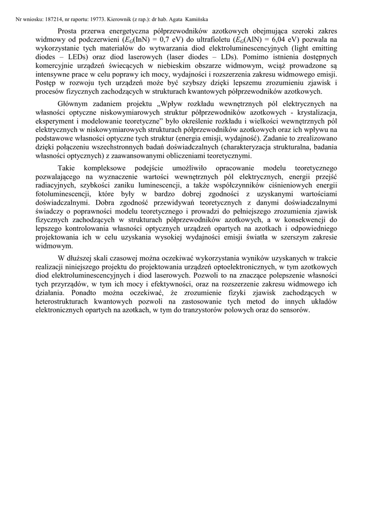 Nr wniosku: 187214, nr raportu: 19773. Kierownik (z rap.): dr hab. Agata Kamińska Prosta przerwa energetyczna półprzewodników azotkowych obejmująca szeroki zakres widmowy od podczerwieni (EG(InN) = 0,7 eV) do ultrafioletu (EG(AlN) = 6,04 eV) pozwala na wykorzystanie tych materiałów do wytwarzania diod elektroluminescencyjnych (light emitting diodes – LEDs) oraz diod laserowych (laser diodes – LDs). Pomimo istnienia dostępnych komercyjnie urządzeń świecących w niebieskim obszarze widmowym, wciąż prowadzone są intensywne prace w celu poprawy ich mocy, wydajności i rozszerzenia zakresu widmowego emisji. Postęp w rozwoju tych urządzeń może być szybszy dzięki lepszemu zrozumieniu zjawisk i procesów fizycznych zachodzących w strukturach kwantowych półprzewodników azotkowych. Głównym zadaniem projektu „Wpływ rozkładu wewnętrznych pól elektrycznych na własności optyczne niskowymiarowych struktur półprzewodników azotkowych - krystalizacja, eksperyment i modelowanie teoretyczne” było określenie rozkładu i wielkości wewnętrznych pól elektrycznych w niskowymiarowych strukturach półprzewodników azotkowych oraz ich wpływu na podstawowe własności optyczne tych struktur (energia emisji, wydajność). Zadanie to zrealizowano dzięki połączeniu wszechstronnych badań doświadczalnych (charakteryzacja strukturalna, badania własności optycznych) z zaawansowanymi obliczeniami teoretycznymi. Takie kompleksowe podejście umożliwiło opracowanie modelu teoretycznego pozwalającego na wyznaczenie wartości wewnętrznych pól elektrycznych, energii przejść radiacyjnych, szybkości zaniku luminescencji, a także współczynników ciśnieniowych energii fotoluminescencji, które były w bardzo dobrej zgodności z uzyskanymi wartościami doświadczalnymi. Dobra zgodność przewidywań teoretycznych z danymi doświadczalnymi świadczy o poprawności modelu teoretycznego i prowadzi do pełniejszego zrozumienia zjawisk fizycznych zachodzących w strukturach półprzewodników azotkowych, a w konsekwencji do lepszego kontrolowania własności optycznych urządzeń opartych na azotkach i odpowiedniego projektowania ich w celu uzyskania wysokiej wydajności emisji światła w szerszym zakresie widmowym. W dłuższej skali czasowej można oczekiwać wykorzystania wyników uzyskanych w trakcie realizacji niniejszego projektu do projektowania urządzeń optoelektronicznych, w tym azotkowych diod elektroluminescencyjnych i diod laserowych. Pozwoli to na znaczące polepszenie własności tych przyrządów, w tym ich mocy i efektywności, oraz na rozszerzenie zakresu widmowego ich działania. Ponadto można oczekiwać, że zrozumienie fizyki zjawisk zachodzących w heterostrukturach kwantowych pozwoli na zastosowanie tych metod do innych układów elektronicznych opartych na azotkach, w tym do tranzystorów polowych oraz do sensorów.