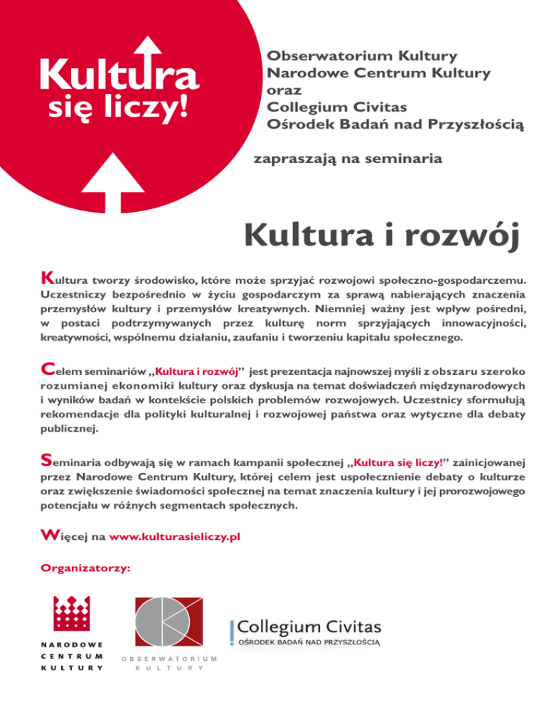 Obserwatorium Kultury Narodowe Centrum Kultury oraz Collegium Civitas Ośrodek Badań nad Przyszłością zapraszają na seminaria Kultura i rozwój Kultura tworzy środowisko, które może sprzyjać rozwojowi społeczno-gospodarczemu. Uczestniczy bezpośrednio w życiu gospodarczym za sprawą nabierających znaczenia przemysłów kultury i przemysłów kreatywnych. Niemniej ważny jest wpływ pośredni, w postaci podtrzymywanych przez kulturę norm sprzyjających innowacyjności, kreatywności, wspólnemu działaniu, zaufaniu i tworzeniu kapitału społecznego. C elem seminariów „Kultura i rozwój” jest prezentacja najnowszej myśli z obszaru szeroko rozumianej ekonomiki kultury oraz dyskusja na temat doświadczeń międzynarodowych i wyników badań w kontekście polskich problemów rozwojowych. Uczestnicy sformułują rekomendacje dla polityki kulturalnej i rozwojowej państwa oraz wytyczne dla debaty publicznej. Seminaria odbywają się w ramach kampanii społecznej „Kultura się liczy!” zainicjowanej przez Narodowe Centrum Kultury, której celem jest uspołecznienie debaty o kulturze oraz zwiększenie świadomości społecznej na temat znaczenia kultury i jej prorozwojowego potencjału w różnych segmentach społecznych. Więcej na www.kulturasieliczy.pl Organizatorzy: Miejsce: Collegium Civitas, Aula A Pałac Kultury i Nauki (XII piętro) Prowadzenie: Red. Edwin Bendyk (Polityka) 30 marca 2010 Muzea i (czy) stadiony. O potrzebie inwestycji w sztukę współczesną Jaka jest kondycja sztuki współczesnej w Polsce? Jakie wyzwania stoją przed polityką kulturalną? Jakie są najnowsze tendencje w dziedzinie ekonomiki kultury? 28 kwietnia 2010 Ewolucja czy rewolucja? Instytucje kultury w epoce YouTube i naszej-klasy.pl Czy możliwe jest podjęcie skutecznych działań w momencie, gdy faktycznymi instytucjami biorącymi udział w cyrkulacji treści kultury są coraz częściej serwisy internetowe (Pirate Bay, YouTube)? 12 maja 2010 Czy Polsce potrzebna jest przemysłowa polityka kulturalna? Jaka jest kondycja przemysłów kultury w Polsce? Czy i jak wspierać ich rozwój? Na ile doświadczenia Polskiego Instytutu Sztuki Filmowej można wykorzystać do promocji innych niż kinematografia sektorów przemysłów kultury, jak np. gry komputerowe? 26 maja 2010 Potencjał kreatywny Polski Czy Polacy są kreatywni? Jak analizować kreatywność w ujęciu społecznym i gospodarczym? Czy kreatywność Polaków jest zasobem rozwojowym, a jeśli tak, to jak wspierać jej rozwój? 9 czerwca 2010 Polityka kulturalna oparta na faktach Szybko zmieniająca się kultura wymaga precyzyjnego opisu w kategoriach statystycznych, ekonomicznych, socjologicznych, antropologicznych. Jakimi instrumentami analitycznymi dysponujemy w Polsce? Jakie byłyby potrzebne? Jakie są najnowsze tendencje? 23 czerwca 2010 Kultura: towar, produkt czy dobro publiczne? Jak zorganizować zarządzanie kulturą jako dobrem publicznym, by powstałe w efekcie mechanizmy działania zbiorowego były zgodne z wartościami i filozofią rozwoju? Czy kultura stymuluje poprawę jakości kapitału społecznego? Kontakt: e-mail: [email protected] tel.: +48 22 21 00 182