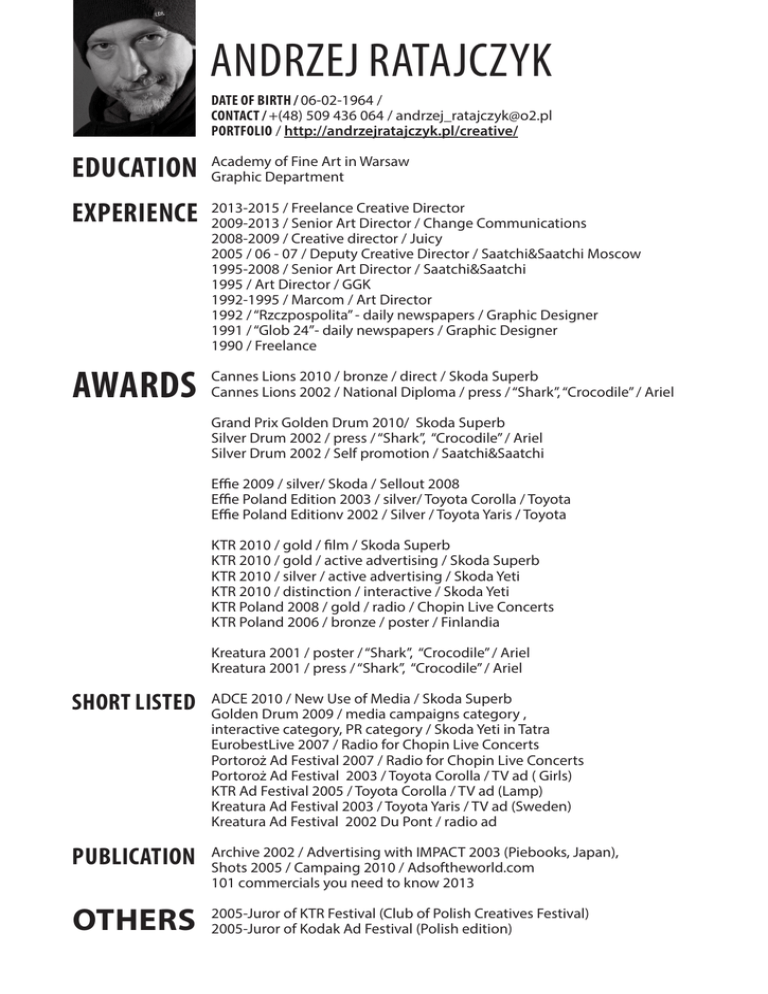 Andrzej Ratajczyk Date of birth / 06-02-1964 / Contact / +(48) 509 436 064 / [email protected] PORTFOLIO / http://andrzejratajczyk.pl/creative/ Education Academy of Fine Art in Warsaw Graphic Department Experience AWARDS 2013-2015 / Freelance Creative Director 2009-2013 / Senior Art Director / Change Communications 2008-2009 / Creative director / Juicy 2005 / 06 - 07 / Deputy Creative Director / Saatchi&Saatchi Moscow 1995-2008 / Senior Art Director / Saatchi&Saatchi 1995 / Art Director / GGK 1992-1995 / Marcom / Art Director 1992 / “Rzczpospolita” - daily newspapers / Graphic Designer 1991 / “Glob 24”- daily newspapers / Graphic Designer 1990 / Freelance Cannes Lions 2010 / bronze / direct / Skoda Superb Cannes Lions 2002 / National Diploma / press / “Shark”, “Crocodile” / Ariel Grand Prix Golden Drum 2010/ Skoda Superb Silver Drum 2002 / press / “Shark”, “Crocodile” / Ariel Silver Drum 2002 / Self promotion / Saatchi&Saatchi Effie 2009 / silver/ Skoda / Sellout 2008 Effie Poland Edition 2003 / silver/ Toyota Corolla / Toyota Effie Poland Editionv 2002 / Silver / Toyota Yaris / Toyota KTR 2010 / gold / film / Skoda Superb KTR 2010 / gold / active advertising / Skoda Superb KTR 2010 / silver / active advertising / Skoda Yeti KTR 2010 / distinction / interactive / Skoda Yeti KTR Poland 2008 / gold / radio / Chopin Live Concerts KTR Poland 2006 / bronze / poster / Finlandia Kreatura 2001 / poster / “Shark”, “Crocodile” / Ariel Kreatura 2001 / press / “Shark”, “Crocodile” / Ariel Short listed ADCE 2010 / New Use of Media / Skoda Superb Golden Drum 2009 / media campaigns category , interactive category, PR category / Skoda Yeti in Tatra EurobestLive 2007 / Radio for Chopin Live Concerts Portoroż Ad Festival 2007 / Radio for Chopin Live Concerts Portoroż Ad Festival 2003 / Toyota Corolla / TV ad ( Girls) KTR Ad Festival 2005 / Toyota Corolla / TV ad (Lamp) Kreatura Ad Festival 2003 / Toyota Yaris / TV ad (Sweden) Kreatura Ad Festival 2002 Du Pont / radio ad Publication Archive 2002 / Advertising with IMPACT 2003 (Piebooks, Japan), Shots 2005 / Campaing 2010 / Adsoftheworld.com 101 commercials you need to know 2013 Others 2005-Juror of KTR Festival (Club of Polish Creatives Festival) 2005-Juror of Kodak Ad Festival (Polish edition)