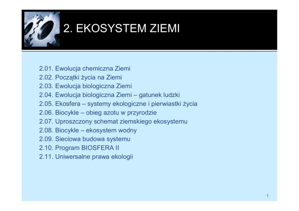 2. EKOSYSTEM ZIEMI 2.01. Ewolucja chemiczna Ziemi 2.02. Początki Ŝycia na Ziemi 2.03. Ewolucja biologiczna Ziemi 2.04. Ewolucja biologiczna Ziemi – gatunek ludzki 2.05. Ekosfera – systemy ekologiczne i pierwiastki Ŝycia 2.06. Biocykle – obieg azotu w przyrodzie 2.07. Uproszczony schemat ziemskiego ekosystemu 2.08. Biocykle – ekosystem wodny 2.09. Sieciowa budowa systemu 2.10. Program BIOSFERA II 2.11. Uniwersalne prawa ekologii 1 2.01. Ewolucja chemiczna Ziemi 15 mld lat jakie upłynęły od prawybuchu („big bang”) odniesione do skali 1 roku kalendarzowego 1 styczeń prawybuch – big bang – około 15 mld lat temu 1 maj powstanie Galaktyki (Drogi Mlecznej) 9 wrzesień początki systemu słonecznego 14 wrzesień formowanie się Ziemi 25 wrzesień początki Ŝycia na Ziemi 2 październik powstanie najstarszych znanych na Ziemi skał 9 październik najstarsze skamieliny bakterii i sinic 1 listopad wynalezienie płci „ u mikroorganizmów 12 listopad najstarsze skamieliny roślin wykorzystujących proces fotosyntezy 15 listopad rozwój organizmów z wyraźnie wyodrębnionym jądrem komórkowym 2 2.02. Początki Ŝycia na Ziemi W doświadczeniach prowadzonych obecnie, w których taką prymitywną atmosferę poddano działaniu źródeł energii podobnych do działających wówczas, uzyskano szereg niskocząsteczkowych związków, w większości wchodzących w skład Ŝywych organizmów. wodór metan woda amoniak energia niestabilne proste związki chemiczne Co spowodowało sprzęŜenie dwóch samoodtwarzających się systemów, których ewolucja rozpoczęła się prawdopodobnie niezaleŜnie: ● systemu białkowego ● systemu kwasów nukleinowych, w kompleks kwasy nukleinowe - białka czyli jak powstał biopolimer ? Albo co spowodowało oddzielenie się systemu biopolimerów od otoczenia, czyli w jaki sposób powstał prototyp błony komórkowej umoŜliwiającej powstanie pierwszej prakomórki ? 3 2.03. Ewolucja biologiczna Ziemi 1 grudnia powstawanie tlenu w atmosferze ziemskiej 17 grudnia rozkwit bezkręgowców 18 grudnia pierwszy plankton w oceanach 19 grudnia pierwsze ryby i kręgowce 20 grudnia początek kolonizacji lądu przez rośliny 21 grudnia pierwsze owady i zwierzęta lądowe 22 grudnia pierwsze płazy i uskrzydlone owady 23 grudnia pierwsze drzewa i gady 24 grudnia dinozaury 26 grudnia pierwsze ssaki 27 grudnia pierwsze ptaki 28 grudnia pierwsze kwiaty, wyginięcie dinozaurów 29 grudnia pierwsze naczelne 30 grudnia początki ewolucji płatów czołowych mózgu naczelnych 31 grudnia pierwsze istoty człekokształtne 4 2.04. Ewolucja biologiczna Ziemi – gatunek ludzki ~1330 pojawienie się prawdopodobnych przodków ludzi i małp ~2230 pierwsi ludzie 2300 rozpowszechnienie się narzędzi z kamienia 2346 opanowanie ognia przez człowieka pekińskiego 2358 kolonizacja Australii przez ludzi 2359 malowidła jaskiniowe w Europie -40 s wynalezienie rolnictwa - 25 s pierwsze miasta - 10 s panowanie pierwszych dynastii sumeryjskich i egipskich, początki astronomii -9s wynalezienie alfabetu -8s kodeks Hammurabiego -7s okres brązu, wojny trojańskie, wynalezienie kompasu -6s okres Ŝelaza, załoŜenie Kartaginy przez Fenicjan -4s geometria Euklidesa, fizyka Archimedesa i astronomia Ptolemeusza -3s wynalazek zera i liczb dziesiętnych w Indiach, upadek Rzymu -1s Renesans w Europie, początki metod doświadczalnych w nauce 0s uzyskanie przez ludzkość energii pozwalającej na samozagładę, pierwsze podróŜe w kosmos 5 2.05. Ekosfera – systemy ekologiczne i pierwiastki Ŝycia CZŁOWIEK ATMOSFERA POWIETRZE HYDROSFERA WODA LITOSFERA GLEBA EKOSFERA ANTROPOSFERA SYSTEMY EKOLOGICZNE CYWILIZACJA NAUKOWO-TECHNICZNA EKOSFERA BIOLOGICZNA PRZESTRZEŃ śYCIOWA CZŁOWIEKA zrozumieć czym jest i jak funkcjonuje ekosfera ? PIERWIASTKI śYCIA WĘGIEL WODÓR TLEN AZOT CYWILIZACJA EKOROZWOJU 6 2.06. Biocykle – obieg azotu w przyrodzie Azot występuje • w stanie wolnym w powietrzu • w stanie związanym w związkach organicznych występujących w humusie czyli organicznej części gleby, • w związkach organicznych tworzących białko, kwasy nukleinowe, enzymy i witaminy POWIETRZE A Z O T BAKTERIE AZOT I GLONY BIAŁKO ROŚLINY ZWIERZĘTA A Z O ODPAD ORGANICZNY T A N Y MIKROORGANIZMY BIOLOGICZNE ENERGIA AZOT BAKTERIE GNILNE HUMUS GLEBA SYSTEM KORZENIOWY ROŚLIN PROCESY UTLENIANIA TLEN WODA AZOTANY WODNY ROZTWÓR AZOTANÓW HUMUS 7 2.07. Uproszczony schemat ziemskiego ekosystemu PROMIENIOWANIE SŁONIECZNE ULTRAFIOLET O2 CO2 ROŚLINY OZONOSFERA DODATNI EFEKT TERMICZNY (CIEPŁO) ZWIERZĘTA POKARM ZIELONE H2O ROŚLINOśERNE ODPAD ORGANICZNY HUMUS 8 2.08. Biocykle – ekosystem wodny TLEN e n e r g i a e n e r g i a ŚWIATŁO Tempo przemian metabolicznych tempo w jakim organizm zuŜywa pokarm, tlen czy produkuje odpady jest odwrotnie proporcjonalne do wielkości tego organizmu fotosynteza łańcuch GLONY p o k a r m AZOTANY troficzny PLANKTON RYBY Np. jeśli dla ryb przyjmiemy jako równe 1, to dla glonów wynosi ono 100, a dla bakterii gnilnych jest 10 000 ODPADY ORGANICZNE Podobnie porównać moŜna cykl reprodukcji: dla ryb – kilka miesięcy dla glonów- kilka dni dla bakterii –kilka godzin BAKTERIE GNILNE W ekosystemie jeśli nie Wszechświata, to Układu Słonecznego, największe tempo przemiany metabolicznej i najkrótszy cykl reprodukcji charakteryzuje gatunek ludzki 9 2.09. Sieciowa budowa systemu Ekosfera ma postać sieci ekologicznej, którą stanowią skomplikowane, wzajemnie przenikające się ekosystemy (układy ekologiczne). Im większy stopień skomplikowania danego układu, tym większe i bardziej długotrwałe napięcia jest on w stanie wytrzymać nie ulegając zniszczeniu. Charakterystyczną cechą ekosystemu jest cykliczność zachodzących w nim przemian. Tempo przemian musi być wyznaczone przez najpowolniejszy etap cyklu. Tylko wówczas działa bowiem dynamiczna samokompensacja systemu i nie dochodzi do jego zniszczenia. Sieć ekologiczna ma cechy wzmacniacza.