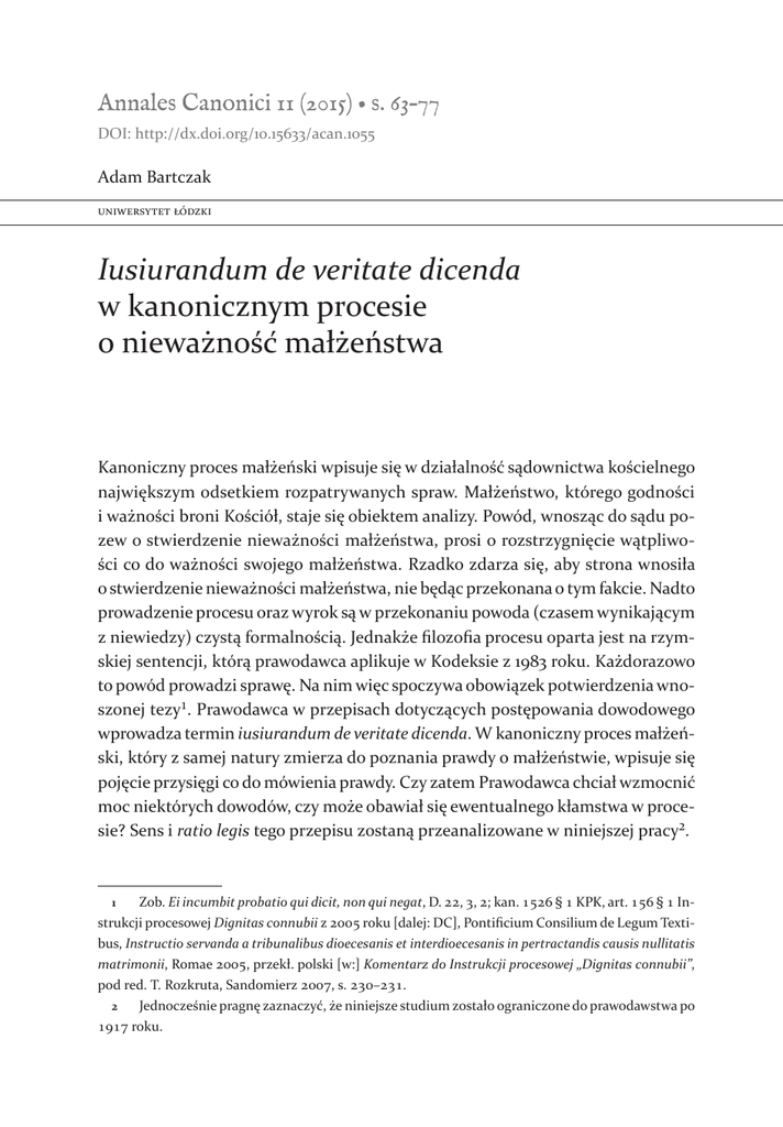 Annales Canonici 11 (2015) • s. 63–77 DOI: http://dx.doi.org/10.15633/acan.1055 Adam Bartczak Uniwersytet Łódzki Iusiurandum de veritate dicenda w kanonicznym procesie o nieważność małżeństwa Kanoniczny proces małżeński wpisuje się w działalność sądownictwa kościelnego największym odsetkiem rozpatrywanych spraw. Małżeństwo, którego godności i ważności broni Kościół, staje się obiektem analizy. Powód, wnosząc do sądu pozew o stwierdzenie nieważności małżeństwa, prosi o rozstrzygnięcie wątpliwości co do ważności swojego małżeństwa. Rzadko zdarza się, aby strona wnosiła o stwierdzenie nieważności małżeństwa, nie będąc przekonana o tym fakcie. Nadto prowadzenie procesu oraz wyrok są w przekonaniu powoda (czasem wynikającym z niewiedzy) czystą formalnością. Jednakże filozofia procesu oparta jest na rzymskiej sentencji, którą prawodawca aplikuje w Kodeksie z 1983 roku. Każdorazowo to powód prowadzi sprawę. Na nim więc spoczywa obowiązek potwierdzenia wnoszonej tezy1. Prawodawca w przepisach dotyczących postępowania dowodowego wprowadza termin iusiurandum de veritate dicenda. W kanoniczny proces małżeński, który z samej natury zmierza do poznania prawdy o małżeństwie, wpisuje się pojęcie przysięgi co do mówienia prawdy. Czy zatem Prawodawca chciał wzmocnić moc niektórych dowodów, czy może obawiał się ewentualnego kłamstwa w procesie? Sens i ratio legis tego przepisu zostaną przeanalizowane w niniejszej pracy2. 1 Zob. Ei incumbit probatio qui dicit, non qui negat, D. 22, 3, 2; kan. 1526 § 1 KPK, art. 156 § 1 Instrukcji procesowej Dignitas connubii z 2005 roku [dalej: DC], Pontificium Consilium de Legum Textibus, Instructio servanda a tribunalibus dioecesanis et interdioecesanis in pertractandis causis nullitatis matrimonii, Romae 2005, przekł. polski [w:] Komentarz do Instrukcji procesowej „Dignitas connubii”, pod red. T. Rozkruta, Sandomierz 2007, s. 230–231. 2 Jednocześnie pragnę zaznaczyć, że niniejsze studium zostało ograniczone do prawodawstwa po 1917 roku. 64 Adam Bartczak 1. Prawda podstawą i celem kanonicznego procesu małżeńskiego Bez wątpienia pojęcie prawdy stanowi fundament nauki Kościoła. Jak zaświadcza już Stary Testament, to Bóg jest źródłem wszelkiej prawdy3, a w Chrystusie Boża prawda objawiła się w pełni4. Uczniowie Chrystusa winni żyć w prawdzie. Cały Kościół zbudowany jest na prawdzie. I także ta prawda musi się znaleźć w postępowaniu sądowym. Jan Paweł II w przemówieniu do Roty Rzymskiej w 1980 roku wskazywał, że we wszystkich procesach kościelnych prawda musi być zawsze fundamentem, „matką i prawem sprawiedliwości”5. Oparcie procesu kanonicznego na prawdzie oznacza podporządkowanie się jej wszelkich instytucji, procedury i osób pozostających w związku z procesem. Prawda wyznacza i kreuje pracę trybunału kościelnego. Skoro prawda leży u podstaw, to znaczy, iż działanie sądownictwa ma być oparte na sprawiedliwości. Celem zaś w tym działaniu jest właśnie służba prawdzie6. Sprawiedliwość bowiem gwarantuje poznanie prawdy. Ta prawda, jak podkreślał Benedykt XVI, której się poszukuje w procesach o orzeczenie nieważności małżeństwa, jest to prawda, która należy do ludzkiej i chrześcijańskiej drogi każdego wiernego. Nie jest ona prawdą abstrakcyjną, oderwaną od dobra człowieka7. Proces kanoniczny zmierza do ukazania prawdy obiektywnej o danym małżeństwie8. Prawda obiektywna jest jedna. Jak zauważa Remigiusz Sobański, analizując przemówienie Piusa XII do Roty Rzymskiej z 1 października 1942 roku, prawda obiektywna ma być prawdą o stanie subiektywnym osoby w momencie wyrażania zgody na małżeństwo9. Ten stan rzeczy jest z natury jeden. Albo ktoś wyrażał wolę 3 Prz 8, 7; 2 Sm 7, 28. 4 J 1, 14. 5 Ioannes Paulus II, Ad Tribunalis Sacrae Romanae Rotae Decanum, Prelatos Auditores, Officiales et Advocatos, novo Litibus iudicandis ineunte anno: de veritate iustitiae matre (die 4.02.1980), „Acta Apostolicae Sedis” [dalej: AAS] 72 (1980), s. 173, 2. 6 Por. R. Sobański, Nauki podstawowe prawa kanonicznego. Teoria prawa kanonicznego, t. 1, Warszawa 2001, s. 140. 7 Benedykt XVI, Przemówienie do audytorów Trybunału Roty Rzymskiej z 29.01.2006 r., „L’Osservatore Romano”, wyd. polskie, 4 (282) 2006, s. 30. 8 Więcej rozważań na temat pojęcia prawdy, jej rodzajów pisał R. Sobański, Iudex veritatem de matrimonio dicit, „Ius Matrimoniale” 4 (1999), s. 181–196. 9 R. Sobański, Prawda jako entelechia procesu o nieważność małżeństwa w świetle przemówień Piusa XII do Roty Rzymskiej, „Ius Matrimoniale” 13 (2008), s. 37. Iusiurandum de veritate dicenda… 65 w sposób wadliwy, albo nie; albo była przeszkoda, albo nie; w końcu forma została dotrzymana albo nie. Problemem w procesie nie jest jednak sama prawda, ale droga jej odkrycia. Sędzia w drodze analizy materiału dowodowego wyrabia sobie pogląd. Celem jego działania staje się pewność moralna nieważności małżeństwa. Jeśli ten stan nie zostanie osiągnięty, to znaczy, że nieważność małżeństwa nie została udowodniona. Trudność w poznaniu prawdy można więc odnaleźć w dowodach gromadzonych w postępowaniu dowodowym. Im lepsze dowody za nieważnością lub przeciw niej, tym bardziej dogłębne poznanie, a więc odkrycie prawdy. Sędzia swoją pewność może sobie wyrobić jedynie na podstawie faktów i dowodów, które znalazły się w przedłożonych aktach. Prawodawca w kodeksie z 1983 roku wymienia kilka dowodów, jakie należy brać pod uwagę w procesie de nullitatae. Są nimi między innymi oświadczenia stron oraz zeznania świadków. Te dwa środki dowodowe charakteryzuje czynnik ludzki. To znaczy podmiotem staje się człowiek, który składa zeznanie. Zeznania są ustną odpowiedzią na zapytania sędziego. Stają się źródłem wiedzy o danym małżeństwie. Prawodawca z całą