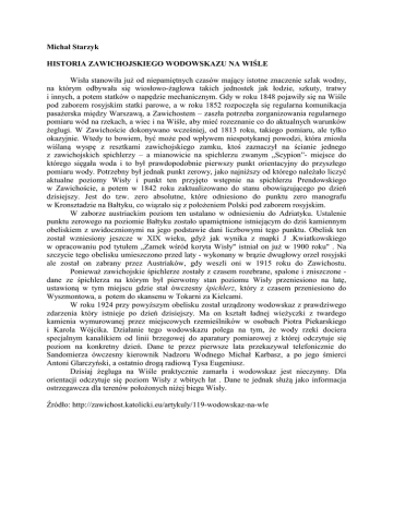 Michał Starzyk HISTORIA ZAWICHOJSKIEGO WODOWSKAZU NA WIŚLE Wisła stanowiła już od niepamiętnych czasów mający istotne znaczenie szlak wodny, na którym odbywała się wiosłowo-żaglowa takich jednostek jak łodzie, szkuty, tratwy i innych, a potem statków o napędzie mechanicznym. Gdy w roku 1848 pojawiły się na Wiśle pod zaborem rosyjskim statki parowe, a w roku 1852 rozpoczęła się regularna komunikacja pasażerska między Warszawą, a Zawichostem – zaszła potrzeba zorganizowania regularnego pomiaru wód na rzekach, a wiec i na Wiśle, aby mieć rozeznanie co do aktualnych warunków żeglugi. W Zawichoście dokonywano wcześniej, od 1813 roku, takiego pomiaru, ale tylko okazyjnie. Wtedy to bowiem, być może pod wpływem niespotykanej powodzi, która zniosła wiślaną wyspę z resztkami zawichojskiego zamku, ktoś zaznaczył na ścianie jednego z zawichojskich spichlerzy – a mianowicie na spichlerzu zwanym „Scypion”- miejsce do którego sięgała woda i to był prawdopodobnie pierwszy punkt orientacyjny do przyszłego pomiaru wody. Potrzebny był jednak punkt zerowy, jako najniższy od którego należało liczyć aktualne poziomy Wisły i punkt ten przyjęto wstępnie na spichlerzu Prendowskiego w Zawichoście, a potem w 1842 roku zaktualizowano do stanu obowiązującego po dzień dzisiejszy. Jest do tzw. zero absolutne, które odniesiono do punktu zero manografu w Kronsztadzie na Bałtyku, co wiązało się z położeniem Polski pod zaborem rosyjskim. W zaborze austriackim poziom ten ustalano w odniesieniu do Adriatyku. Ustalenie punktu zerowego na poziomie Bałtyku zostało upamiętnione istniejącym do dziś kamiennym obeliskiem z uwidocznionymi na jego podstawie dani liczbowymi tego punktu. Obelisk ten został wzniesiony jeszcze w XIX wieku, gdyż jak wynika z mapki J .Kwiatkowskiego w opracowaniu pod tytułem „Zamek wśród koryta Wisły" istniał on już w 1900 roku" . Na szczycie tego obelisku umieszczono przed laty - wykonany w brązie dwugłowy orzeł rosyjski ale został on zabrany przez Austriaków, gdy weszli oni w 1915 roku do Zawichostu. Ponieważ zawichojskie śpichlerze zostały z czasem rozebrane, spalone i zniszczone dane ze śpichlerza na którym był pierwotny stan poziomu Wisły przeniesiono na łatę, ustawioną w tym miejscu gdzie stał ówczesny śpichlerz, który z czasem przeniesiono do Wyszmontowa, a potem do skansenu w Tokarni za Kielcami. W roku 1924 przy powyższym obelisku został urządzony wodowskaz z prawdziwego zdarzenia który istnieje po dzień dzisiejszy. Ma on kształt ładnej wieżyczki z twardego kamienia wymurowanej przez miejscowych rzemieślników w osobach Piotra Piekarskiego i Karola Wójcika. Działanie tego wodowskazu polega na tym, że wody rzeki dociera specjalnym kanalikiem od linii brzegowej do aparatury pomiarowej z której odczytuje się poziom na konkretny dzień. Dane te przez pierwsze lata przekazywał telefonicznie do Sandomierza ówczesny kierownik Nadzoru Wodnego Michał Karbasz, a po jego śmierci Antoni Glarczyński, a ostatnio drogą radiową Tysa Eugeniusz. Dzisiaj żegluga na Wiśle praktycznie zamarła i wodowskaz jest nieczynny. Dla orientacji odczytuje się poziom Wisły z wbitych łat . Dane te jednak służą jako informacja ostrzegawcza dla terenów położonych niżej biegu Wisły. Źródło: http://zawichost.katolicki.eu/artykuly/119-wodowskaz-na-wle