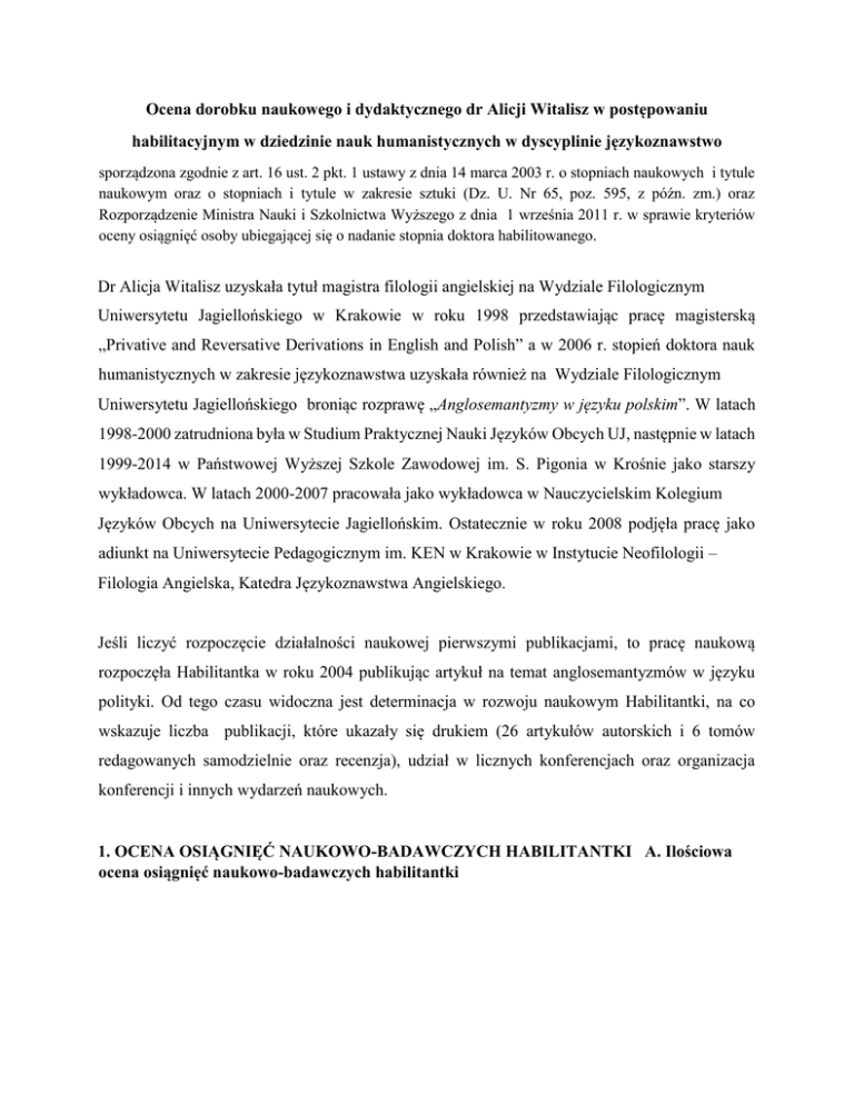 Ocena dorobku naukowego i dydaktycznego dr Alicji Witalisz w postępowaniu habilitacyjnym w dziedzinie nauk humanistycznych w dyscyplinie językoznawstwo sporządzona zgodnie z art. 16 ust. 2 pkt. 1 ustawy z dnia 14 marca 2003 r. o stopniach naukowych i tytule naukowym oraz o stopniach i tytule w zakresie sztuki (Dz. U. Nr 65, poz. 595, z późn. zm.) oraz Rozporządzenie Ministra Nauki i Szkolnictwa Wyższego z dnia 1 września 2011 r. w sprawie kryteriów oceny osiągnięć osoby ubiegającej się o nadanie stopnia doktora habilitowanego. Dr Alicja Witalisz uzyskała tytuł magistra filologii angielskiej na Wydziale Filologicznym Uniwersytetu Jagiellońskiego w Krakowie w roku 1998 przedstawiając pracę magisterską „Privative and Reversative Derivations in English and Polish” a w 2006 r. stopień doktora nauk humanistycznych w zakresie językoznawstwa uzyskała również na Wydziale Filologicznym Uniwersytetu Jagiellońskiego broniąc rozprawę „Anglosemantyzmy w języku polskim”. W latach 1998-2000 zatrudniona była w Studium Praktycznej Nauki Języków Obcych UJ, następnie w latach 1999-2014 w Państwowej Wyższej Szkole Zawodowej im. S. Pigonia w Krośnie jako starszy wykładowca. W latach 2000-2007 pracowała jako wykładowca w Nauczycielskim Kolegium Języków Obcych na Uniwersytecie Jagiellońskim. Ostatecznie w roku 2008 podjęła pracę jako adiunkt na Uniwersytecie Pedagogicznym im. KEN w Krakowie w Instytucie Neofilologii – Filologia Angielska, Katedra Językoznawstwa Angielskiego. Jeśli liczyć rozpoczęcie działalności naukowej pierwszymi publikacjami, to pracę naukową rozpoczęła Habilitantka w roku 2004 publikując artykuł na temat anglosemantyzmów w języku polityki. Od tego czasu widoczna jest determinacja w rozwoju naukowym Habilitantki, na co wskazuje liczba publikacji, które ukazały się drukiem (26 artykułów autorskich i 6 tomów redagowanych samodzielnie oraz recenzja), udział w licznych konferencjach oraz organizacja konferencji i innych wydarzeń naukowych. 1. OCENA OSIĄGNIĘĆ NAUKOWO-BADAWCZYCH HABILITANTKI A. Ilościowa ocena osiągnięć naukowo-badawczych habilitantki 1) autorstwo lub współautorstwo monografii, publikacji naukowych w czasopismach międzynarodowych lub krajowych Jak wspomniano we wstępie dorobek publikacyjny dr Alicji Witalisz pod względem ilościowym jest zadowalający. W podlegającym ocenie okresie, tj. od chwili uzyskania stopnia doktora dr Alicja Witalisz opublikowała: - 1 monografię w języku angielskim English Loan Translations in Polish: Word-formation Patterns, Lexicalization, Idiomacity and Institutionalization, 2015, Peter Lang (Frankfurt am Main), wskazaną jako osiągnięcie wynikające z art. 16 ust. 2 ustawy z dnia 14 marca 2003 r. o stopniach naukowych i tytule naukowym oraz o stopniach i tytule w zakresie sztuki (DZ. U. nr 65, poz. 595 ze zm.) - 18 artykułów w zbiorach i czasopismach recenzowanych - 1 recenzja - 4 książki pod redakcją Można więc mówić w tym przypadku o znaczącym powiększeniu dorobku naukowego po doktoracie: przed uzyskaniem stopnia dr Habilitantka opublikowała osiem artykułów oraz redagowała dwie książki. 2) sumaryczny impact factor publikacji naukowych oraz liczba cytowań publikacji według bazy Publish or Perish Publikacje Habilitantki cytowane były Web of Science, Scopus i Publish or Perish. Ogólna liczba cytowań prac Habilitantki w Publish or Perish wynosi 19, indeks hI.norm: 3 a hI annual = 0.25 3) kierowanie projektami badawczymi lub udział w takich projektach udział w projekcie NCN Dr Alicja Witalisz nie kierowała projektami badawczymi. Natomiast w roku 2015 brała udział w przygotowaniu wniosku o grant badawczy Slavic Languages Development Prospects within the European Multilingual Frame until the End of the 21st Century w ramach programu "Horyzont 2020" 4) międzynarodowe lub krajowe nagrody za działalność naukową W latach 2001, 2007 i 2013 uzyskała nagrody Rektora PWSZ w Krośnie za osiągnięcia naukowe, działalność dydaktyczną i edytorską. 5) wygłoszenie referatów na międzynarodowych lub krajowych konferencjach tematycznych: Od chwili uzyskania stopnia doktora dr Alicja Witalisz uczestniczyła jako autorka referatów na ponad 20 konferencjach krajowych i zagranicznych. Jak na okres 9 lat, które upłynęły od chwili uzyskania stopnia doktora, liczbę tę należy uznać za wysoką. B. Opisowa ocena osiągnięcia naukowego habilitanta Na przedstawione do oceny osiągnięcie naukowe Habilitanta (w rozumieniu art. 16 ust. 2 Ustawy o stopniach i tytule naukowym oraz o stopniach i tytule w zakresie sztuki z dnia 14 marca 2003r. (Dz. U. nr 65, poz. 595, Dz. U. z 2005r. nr 164, poz. 1365 oraz Dz. U. z 2011r. nr 84, poz. 455) składa się monografia w języku angielskim angielskim English Loan Translations in Polish: Wordformation Patterns, Lexicalization, Idiomacity and Institutionalization, 2015, Peter Lang (Frankfurt am Main). Praca ta uzyskała bardzo dobre recenzje wydawnicze prof. prof. Dillera (Bochum) i Sauera (Monachium). Habilitantka przesłała również do oceny artykuły opublikowane w języku angielskim i polskim w czasopismach oraz pracach zbiorowych polskich i zagranicznych. W niemal całości są one tematycznie zbieżne z tematyką ocenianej monografii, co świadczy o skrystalizowanych zainteresowaniach badawczych. Ponadto wśród nadesłanych publikacji znajdują się cykle tematyczne, które Habilitantka określa w swoim Autoreferacie jako (1) Zapożyczenia semantyczne i zmiany semantyczne, (2) Kalki strukturalno-semantyczne z języka angielskiego, (3) Teoria zapożyczeń, (4) Język a kultura, (5) Globalizacja językowa oraz (6) Inne prace dotyczące zapożyczeń. Taka autoklasyfikacja znajduje uzasadnienie, choć przyznać można, że zważywszy na liczbę publikacji, jest ona nazbyt szczegółowa. Zainteresowania badawcze Habilitantki są niezwykle spójne – od początku swej działalności naukowej dr Alicji W