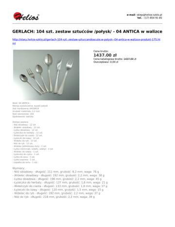 e-mail: [email protected] tel. : (17) 854 91 85 GERLACH: 104 szt. zestaw sztućców /połysk/ - 04 ANTICA w walizce http://stary.helios-szklo.pl/gerlach-104-szt.-zestaw-sztuccandoacute;w-polysk--04-antica-w-walizce-produkt-175.ht ml Cena brutto: 1437.00 zł Cena katalogowa brutto: 1437.00 zł Oszczędzasz: 0,00 zł Wzór: 04 ANTICA Wersja wykończenia: wysoki połysk Stal nierdzewna: 0H18N10 Grubość materiału: 2,2 mm Ilość elementów: 104 Opakowanie: walizka Zestaw zawiera: - Nóż obiadowy - 12 szt. - Widelec obiadowy - 12 szt. - Łyżka obiadowa - 12 szt. - Łyżeczka do herbaty - 12 szt. - Widelczyki do ciasta - 12 szt. - Łyżeczki do kawy - 12 szt. - Widelec do ryb - 12 szt. - Nóż do ryb - 12 szt. - Widelec półmiskowy duży - 1 szt. - Łyżka (ziemniaki, sałatki, sałaty) - 2 szt. - Widelec do sałaty - 1 szt. - Łyżeczka do cukru - 1 szt. - Łyżka do sosu - 1 szt. - Łyżka wazowa - 1 szt. - Łopatka do tortu - 1 szt. Wymiary: - Nóż obiadowy - długość: 211 mm, grubość: 8,2 mm, waga: 76 g - Widelec obiadowy - długość: 192 mm, grubość: 2,2 mm, waga: 38 g - Łyżka obiadowa - długość: 196 mm, grubość: 2,2 mm, waga: 45 g - Łyżeczka do herbaty - długość: 137 mm, grubość: 1,8 mm, waga: 21 g - Widelczyki do ciasta - długość: 133 mm, grubość: 1,8 mm, waga: 17 g - Łyżeczki do kawy - długość: 120 mm, grubość: 1,5 mm, waga: 15 g - Widelec do ryb - długość: 192 mm, grubość: 2,2 mm, waga: 37 g - Nóż do ryb - długość: 218 mm, grubość: 2,2 mm, waga: 39 g - Widelec półmiskowy duży - długość: mm, grubość: mm, waga: g - Łyżka (ziemniaki, sałatki, sałaty) - długość: 205 mm, grubość: 2,2 mm, waga: 62 g - Widelec do sałaty - długość: 204 mm, grubość: 2,2 mm, waga: 60 g - Łyżeczka do cukru - długość: 144 mm, grubość: 1,8 mm, waga: 21 g - Łyżka do sosu - długość: 180 mm, grubość: 2,2 mm, waga: 63 g - Łyżka wazowa - długość: 295 mm, grubość: 2,5 mm, waga: 122 g - Łopatka do tortu - długość: 242 mm, grubość: 8,5 mm, waga: 97 g