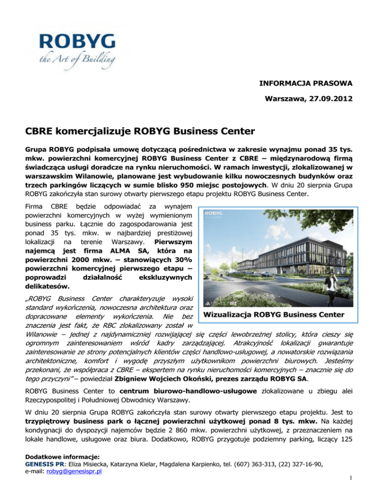 INFORMACJA PRASOWA Warszawa, 27.09.2012 CBRE komercjalizuje ROBYG Business Center Grupa ROBYG podpisała umowę dotyczącą pośrednictwa w zakresie wynajmu ponad 35 tys. mkw. powierzchni komercyjnej ROBYG Business Center z CBRE – międzynarodową firmą świadcząca usługi doradcze na rynku nieruchomości. W ramach inwestycji, zlokalizowanej w warszawskim Wilanowie, planowane jest wybudowanie kilku nowoczesnych budynków oraz trzech parkingów liczących w sumie blisko 950 miejsc postojowych. W dniu 20 sierpnia Grupa ROBYG zakończyła stan surowy otwarty pierwszego etapu projektu ROBYG Business Center. Firma CBRE będzie odpowiadać za wynajem powierzchni komercyjnych w wyżej wymienionym business parku. Łącznie do zagospodarowania jest ponad 35 tys. mkw. w najbardziej prestiżowej lokalizacji na terenie Warszawy. Pierwszym najemcą jest firma ALMA SA, która na powierzchni 2000 mkw. – stanowiących 30% powierzchni komercyjnej pierwszego etapu – poprowadzi działalność ekskluzywnych delikatesów. „ROBYG Business Center charakteryzuje wysoki standard wykończenia, nowoczesna architektura oraz dopracowane elementy wykończenia. Nie bez Wizualizacja ROBYG Business Center znaczenia jest fakt, że RBC zlokalizowany został w Wilanowie – jednej z najdynamiczniej rozwijającej się części lewobrzeżnej stolicy, która cieszy się ogromnym zainteresowaniem wśród kadry zarządzającej. Atrakcyjność lokalizacji gwarantuje zainteresowanie ze strony potencjalnych klientów części handlowo-usługowej, a nowatorskie rozwiązania architektoniczne, komfort i wygodę przyszłym użytkownikom powierzchni biurowych. Jesteśmy przekonani, że współpraca z CBRE – ekspertem na rynku nieruchomości komercyjnych – znacznie się do tego przyczyni” – powiedział Zbigniew Wojciech Okoński, prezes zarządu ROBYG SA. ROBYG Business Center to centrum biurowo-handlowo-usługowe zlokalizowane u zbiegu alei Rzeczypospolitej i Południowej Obwodnicy Warszawy. W dniu 20 sierpnia Grupa ROBYG zakończyła stan surowy otwarty pierwszego etapu projektu. Jest to trzypiętrowy business park o łącznej powierzchni użytkowej ponad 8 tys. mkw. Na każdej kondygnacji do dyspozycji najemców będzie 2 860 mkw. powierzchni użytkowej, z przeznaczeniem na lokale handlowe, usługowe oraz biura. Dodatkowo, ROBYG przygotuje podziemny parking, liczący 125 Dodatkowe informacje: GENESIS PR: Eliza Misiecka, Katarzyna Kielar, Magdalena Karpienko, tel. (607) 363-313, (22) 327-16-90, e-mail: [email protected] 1 miejsc postojowych. Zakończenie pierwszego etapu budowy planowane jest na połowę 2013 roku. W ramach drugiego etapu ROBYG Business Center powstanie obiekt o powierzchni użytkowej 27 tys. mkw. W sąsiedztwie znajdzie się również 5-piętrowy parking naziemny, liczący około 600 miejsc postojowych. „Nasze działania doceniane są przez wielu klientów i instytucji na całym świecie. W tym roku zostaliśmy nagrodzeni już w trzech prestiżowych, globalnych rankingach: magazynu Fortune, a także firmy Lipsey oraz Managing Partners’ Forum. Jesteśmy bardzo zadowoleni, że Grupa ROBYG, jeden z czołowych polskich deweloperów, zdecydowała się na współpracę z CBRE. Uważamy, że ROBYG Business Center to inwestycja bardzo perspektywiczna i dająca szerokie możliwości aranżacyjne. Sądzimy, że RBC spotka się z dużym zainteresowaniem potencjalnych kontrahentów” – powiedział Łukasz Kałędkiewicz, dyrektor działu powierzchni biurowych CBRE. Grupa ROBYG należy do czołówki polskich deweloperów pod względem liczby sprzedanych mieszkań. W ciągu 12 lat działalności firma zrealizowała 7 wieloetapowych inwestycji, obejmujących łącznie około 2670 lokali (do czerwca 2012 roku). W połowie 2012 roku ROBYG miał 9 aktywnych inwestycji w toku i około 1133 lokale w swojej ofercie. W Warszawie Grupa prowadzi 5 inwestycji mieszkaniowych: Nowa Rezydencja Królowej Marysieńki, Osiedle Zdrowa, City Apartments, Osiedle Kameralne i Young City oraz jeden projekt komercyjny, ROBYG Business Center w Wilanowie. Natomiast w Gdańsku spółka realizuje 3 inwestycje: Lawendowe Wzgórza, Słoneczna Morena i Albatross Towers. ROBYG SA jest notowana na głównym parkiecie Giełdy Papierów Wartościowych w Warszawie od listopada 2010 roku. Więcej informacji www.ri.robyg.com, www.robyg.com CBRE to największa na świecie firma doradcza działająca w sektorze nieruchomości komercyjnych (pod względem przychodów za rok 2011), a także jedna z 500 wiodących firm świata według rankingów magazynu Fortune oraz agencji ratingowej Standard & Poor’s. CBRE, z siedzibą główną w Los Angeles, zatrudnia około 34 000 pracowników i obsługuje inwestorów, właścicieli oraz najemców nieruchomości w ponad 300 biurach na całym świecie (nie wliczając firm stowarzyszonych i partnerskich). Zakres usług świadczonych przez CBRE obejmuje: doradztwo strategiczne w zakresie inwestycji i wynajmu, usługi korporacyjne, usługi zarządzania nieruchomościami oraz projektami, administrację firm, bankowość hipoteczną, wyceny, usługi deweloperskie, usługi zarządzania inwestycjami oraz usługi konsultingowe i analityczne. Więcej na www.cbre.com. Dodatkowe informacje: GENESIS PR: Eliza Misiecka, Katarzyna Kielar, Magdalena Karpienko, tel. (607) 363-313, (22) 327-16-90, e-mail: [email protected] 2