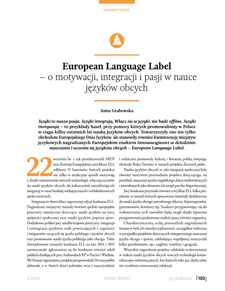 INNOWACYJNOŚĆ European Language Label – o motywacji, integracji i pasji w nauce języków obcych Anna Grabowska Języki to nasza pasja, Języki integrują, Włącz się w języki, nie bądź offline, Języki motywują – to przykłady haseł, przy pomocy których promowaliśmy w Polsce w ciągu kilku ostatnich lat naukę języków obcych. Towarzyszyły one nie tylko obchodom Europejskiego Dnia Języków, ale stanowiły również kwintesencję inicjatyw językowych nagradzanych Europejskim znakiem innowacyjności w dziedzinie nauczania i uczenia się języków obcych – European Language Label. 22 września br. z rąk przedstawicieli MEN oraz Komisji Europejskiej certyfikaty ELL odbierze 15 laureatów, których projekty nie tylko w atrakcyjny sposób motywują i, dzięki zastosowaniu nowych technologii, włączają uczniów do nauki języków obcych, ale jednocześnie umożliwiają ich integrację w coraz bardziej wielojęzycznych i wielokulturowych społecznościach. Integracja to słowo klucz tegorocznej edycji konkursu ELL. Nagrodzone inicjatywy musiały bowiem spełnić europejskie priorytety tematyczne dotyczące: nauki języków na rzecz spójności społecznej oraz nauki języków poprzez sport. Dodatkowo polskie jury ustaliło krajowe priorytety: integracja i reintegracja językowa osób powracających z zagranicy i imigrantów uczących się języka polskiego i języków obcych oraz promowanie nauki języka polskiego jako obcego. Takie sformułowanie tematyki konkursu ELL na lata 2014 i 2015 zaowocowało zgłoszeniem się do konkursu również szkół polskich działających przy Ambasadach RP w Paryżu i Wiedniu. We Francji organizatorzy projektu przeprowadzili Pierwsze polskie dyktando, a w Austrii dzieci polonijne wraz z nauczycielami 3/2014 i rodzicami promowały kulturę i literaturę polską świętując obchody Roku Tuwima w ramach projektu Kwietnik polski. Nauka języków obcych w celu integracji społecznej była również motywem przewodnim projektu dotyczącego, na przykład, nauczania języka angielskiego dzieci niedowidzących i niewidomych jako elementu ich terapii psycho-lingwistycznej. Jury konkursu przyznało również certyfikat ELL kilku projektom, w ramach których opracowano materiały dydaktyczne do nauki języka obcego zawodowego lekarzy, fizjoterapeutów, gastronomów, hotelarzy itp. Studenci przygotowujący się do wykonywania tych zawodów będą mogli dzięki lepszemu przygotowaniu językowemu znaleźć pracę również zagranicą. Charakterystyczną cechą pozostałych nagrodzonych inicjatyw była ich interdyscyplinarność, szczególnie widoczna w przypadku projektów dotyczących zintegrowanego nauczania języka obcego i sportu, zakładająca współpracę nauczycieli kilku przedmiotów, np.: anglisty, wuefisty i geografa. Wszystkie nagrodzone projekty zakładały wykorzystanie w trakcie nauki języków obcych nowych technologii komunikacyjno-informacyjnych, bez których nikt już chyba sobie nie wyobraża nowoczesnej edukacji. wieża Babel [ 103 ] INNOWACYJNOŚĆ Poniżej prezentujemy krótkie opisy wszystkich projektów nagrodzonych w XIII edycji konkursu European Language Label. Więcej informacji o tegorocznych laureatach ELL, samym konkursie oraz inicjatywach dotyczących promowania nauki języków obcych w Europie znajdą Państwo na stronie www.ell.org.pl. Projekty instytucjonalne Tytuł: Piłka i języki obce łączą ludzi już od najmłodszych lat Instytucja: Akademia „Kick in English” w Krośnie Koordynator: Karol Stefański Poziom edukacji: przedszkole i szkoła podstawowa Język: angielski K ick in English to nauka języka angielskiego w czasie zajęć piłkarskich. Projekt był realizowany we współpracy ze środowiskiem lokalnym (firmami oraz lokalnymi żłobkami, przedszkolami i szkołami podstawowymi). Uczestnikami projektu były dzieci w wieku od 2 do 9 lat, które z entuzjazmem powtarzały słowa i polecenia w języku obcym, pracując w ten sposób nad dobrymi nawykami językowymi i sportowymi. Podstawową zasadą projektu była nauka poprzez zabawę i ruch. Zajęcia rozpoczynała krótka lekcja wprowadzająca nowe słownictwo, które następnie ćwiczono przez 30 min w formie treningu piłkarskiego. Zajęcia prowadzone były cyklicznie, z każdym rokiem na coraz wyższym poziomie zaawansowania językowego i sportowego. Bardzo ważnym elementem projektu było kształtowanie kompetencji społecznych: pracy w grupie, komunikacji, rozwijania poczucia własnej tożsamości i przynależności do grupy. Optymistyczne i pełne pasji podejście nauczycieli [ 104 ] i trenerów jest dla dzieci prawdziwą szkołą życia. Dzięki pozytywnemu nastawieniu dzieci uczą się, że błędy i upadki są naturalnym procesem, a aktywnie spędzony czas jest zachętą do realizacji marzeń. Program Kick in English to zabawa a nie prawdziwy futbol, dlatego też, gdy dziecko osiąga wiek 6-7 lat, przechodzi do profesjonalnej szkółki piłkarskiej, aby tam kształtować umiejętności gry w piłkę. Oprócz regularnych zajęć w ramach projektu, organizowanych jest wiele imprez plenerowych, tj. pikniki, rozgrywki, spotkania rodzinne, a nawet bicie rekordu Guinessa w zbiorowym dryblingu piłkarskim. Tytuł: I really speak English Instytucja: Szkoła Podstawowa w Chomęcicach Koordynator: Julietta Jones Poziom edukacji: szkoła podstawowa Język: angielski U czniowie szkoły w Chomęcicach chcieliby biegle mówić po angielsku, ale też ciekawie i aktywnie spędzać czas poza lekcjami. Dzięki projektowi mogli doskonalić umiejętności komunikacji w języku angielskim, wykorzystując swój wolny czas do aktywnej nauki języka. wieża Babel 3/2014 INNOWACYJNOŚĆ W ramach działań projektowych, przez ponad rok, grupa uczniów z klas IV-VI, o zróżnicowanej znajomości języka angielskiego (jednym z celów projektu było wsparcie słabszych uczniów w przełamaniu barier w mówieniu), spotykała się na bezpłatnych zajęciach, w czasie których