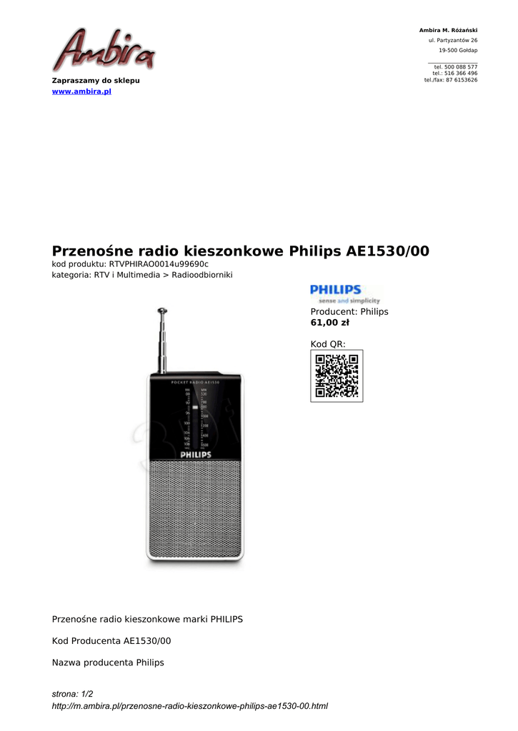 Ambira M. Różański ul. Partyzantów 26 19-500 Gołdap ___________________ tel. 500 088 577 tel.: 516 366 496 tel./fax: 87 6153626 Zapraszamy do sklepu www.ambira.pl Przenośne radio kieszonkowe Philips AE1530/00 kod produktu: RTVPHIRAO0014u99690c kategoria: RTV i Multimedia > Radioodbiorniki Producent: Philips 61,00 zł Kod QR: Przenośne radio kieszonkowe marki PHILIPS Kod Producenta AE1530/00 Nazwa producenta Philips strona: 1/2 http://m.ambira.pl/przenosne-radio-kieszonkowe-philips-ae1530-00.html Tuner FM Tak Stereo Nie Wbudowany zegar Nie Funkcja budzika Nie Wyświetlacz Brak Sposób strojenia Pokrętło - mechaniczny, analogowy Kolor srebrno- czarny Zasilanie bateryjne Tak Zasilanie sieciowe Nie Wymiary 19x 117x 56mm Ciężar 0,08kg Informacje dodatkowe Wyjście audio/wideo: Gniazdo słuchawek (3,5 mm) Certyfikaty CE www www.philips.pl strona: 2/2 http://m.ambira.pl/przenosne-radio-kieszonkowe-philips-ae1530-00.html