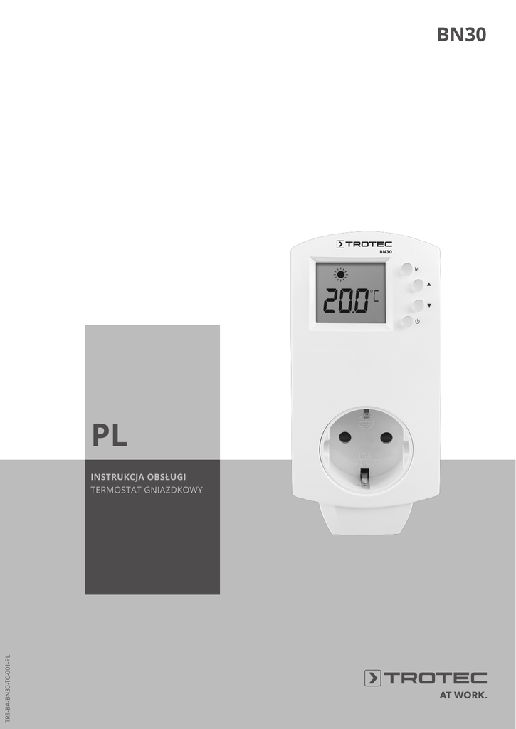 BN30 PL TRT-BA-BN30-TC-001-PL INSTRUKCJA OBSŁUGI TERMOSTAT GNIAZDKOWY Wskazówka dotycząca odpowiedzialności prawnej Spis treści Wskazówki dotyczące instrukcji obsługi ............................. 1 Bezpieczeństwo..................................................................... 2 Informacje dotyczące urządzenia......................................... 3 Dane techniczne .................................................................... 3 Transport i składowanie........................................................ 4 Obsługa .................................................................................. 4 Konserwacja i naprawa......................................................... 5 Utylizacja ............................................................................... 5 Deklaracja zgodności ............................................................ 5 Wskazówki dotyczące instrukcji obsługi Symbole Zagrożenie porażeniem przez prąd elektryczny! Wskazuje na zagrożenie porażeniem przez prąd elektryczny, mogące prowadzić do obrażeń ciała lub śmierci. Niebezpieczeństwo! Wskazuje na zagrożenie wystąpienia wypadków z uczestnictwem osób. Ostrożnie! Wskazuje na zagrożenie wystąpienia szkód materialnych. Aktualna wersja tej instrukcji obsługi znajduje się na stronie internetowej: BN30 http://download.trotec.com/?sku=6100007009&id=1 1 Ta publikacja zastępuje wszystkie wcześniejsze wydania. Żadna część niniejszej publikacji nie może być w jakiejkolwiek formie obrabiana, powielana lub rozpowszechniana albo obrabiana elektronicznie, bez uprzedniego uzyskania pisemnej zgody firmy TROTEC. Zmiany techniczne zastrzeżone. Wszelkie prawa zastrzeżone. Nazwy handlowe zostały wykorzystane w treści bez gwarancji prawa do dowolnego wykorzystania oraz zgodnie z pisownią stosowaną przez producenta. Wszystkie znaki towarowe są zastrzeżone. Zastrzega się prawo do wprowadzania zmian konstrukcyjnych oraz zmian kształtu/kolorów w ramach procesu ulepszeń produktu. Zakres dostawy może różnić się od zawartości ilustracji. Poniższy dokument został opracowany z zachowaniem należytej staranności. Firma TROTEC nie ponosi odpowiedzialności za błędy w treści instrukcji obsługi lub jej niekompletność. Uzyskanie danych pomiarowych, wnioski i wynikające z nich czynności należą do zakresu odpowiedzialności tylko i wyłącznie użytkownika urządzenia. Firma Trotec nie udziela żadnej gwarancji dotyczącej prawidłowości uzyskanych danych lub wyników pomiarowych. Firma Trotec nie ponosi także żadnej odpowiedzialności za błędy lub szkody wynikające z wykorzystania uzyskanych danych pomiarowych. © Trotec Gwarancja i odpowiedzialność Urządzenie odpowiada wysmaganiom dotyczącym bezpieczeństwa i higieny pracy obowiązującym na terenie Unii Europejskiej. Prawidłowość działania urządzenia została wielokrotnie sprawdzona. W przypadku wystąpienia usterek, których usunięcie nie jest możliwe mimo zastosowania się do wskazówek zawartych w rozdziale "Usterki", skontaktuj się z przedstawicielem handlowym. W przypadku niezastosowania się do zaleceń producenta, wymogów prawnych lub w przypadku przeprowadzenia modyfikacji urządzenia, jego producent nie ponosi odpowiedzialności za wynikłe szkody. Ingerencje w urządzenie lub nieautoryzowana wymiana części zamiennych może znacznie wpłynąć na bezpieczeństwo elektryczne urządzenia i prowadzi do utraty gwarancji. Producent nie ponosi żadnej odpowiedzialności za szkody rzeczowe lub obrażenia osób, wynikające z zastosowania urządzenia w sposób niezgodny z treścią tej instrukcji obsługi. Producent zastrzega prawo wprowadzenia w dowolnym momencie wynikających z procesu rozwojowego zmian konstrukcyjnych i wykonawczych. Nie ponosimy odpowiedzialności za szkody powstałe w wyniku zastosowania urządzenia niezgodnie z jego przeznaczeniem. Oznacza to także odrzucenie wszelkich roszczeń gwarancyjnych. Instrukcja obsługi – Termostat gniazdkowy BN30 PL Inne zagrożenia Bezpieczeństwo Przed uruchomieniem urządzenia zapoznaj się z treścią instrukcji obsługi i przechowuj ją w pobliżu miejsca pracy urządzenia! • Nie eksploatuj urządzenia w pomieszczeniach, w których panuje zagrożenie wybuchem. • Nie eksploatuj urządzenia w pomieszczeniach, w których panuje agresywna atmosfera. • Chroń urządzenie przed bezpośrednim, długotrwałym nasłonecznieniem. • Nie zdejmuj znaków bezpieczeństwa, naklejek lub etykiet. Utrzymuj wszystkie znaki bezpieczeństwa, naklejki oraz etykiety w dobrym stanie. • Nie otwieraj urządzenia za pomocą narzędzi. • Zastosuj się do zaleceń dotyczących warunków składowania i zastosowania (patrz rozdział "Dane techniczne"). Zastosowanie zgodne z przeznaczeniem Urządzenie może być wykorzystywane wyłącznie jako sterowana temperaturowo przejściówka do gniazda zasilania, włączana przed odbiornikiem energii elektrycznej. Konieczne jest uwzględnienie danych technicznych przejściówki. Niebezpieczeństwo! Nie pozostawiaj materiału opakowaniowego leżącego w bezładzie. Może stać on się niebezpieczną zabawką dla dzieci. Niebezpieczeństwo! W przypadku nieprawidłowego zastosowania tego urządzenia może dojść do powstania dodatkowego zagrożenia! Zapewnij odpowiednie przeszkolenie personelu! Niebezpieczeństwo! Urządzenia nie są zabawkami i nie mogą być przekazywane dzieciom. Ostrożnie! Do czyszczenia urządzenia nie używaj agresywnych środków czyszczących, środków do szorowania ani rozpuszczalników. Ostrożnie! W celu uniknięcia uszkodzenia urządzenia, nie poddawaj go działaniu temperatur zewnętrznych, bardzo wysokiej wilgotności powietrza lub bezpośredniemu działaniu wody. Zastosowanie niezgodne z przeznaczeniem Urządzenie nie może być zastosowane w połączeniu z żadnymi przedłużaczami, w obszarach zagrożenia wybuchem, w wilgoci lub o podwyższonej wilgotności powietrza.