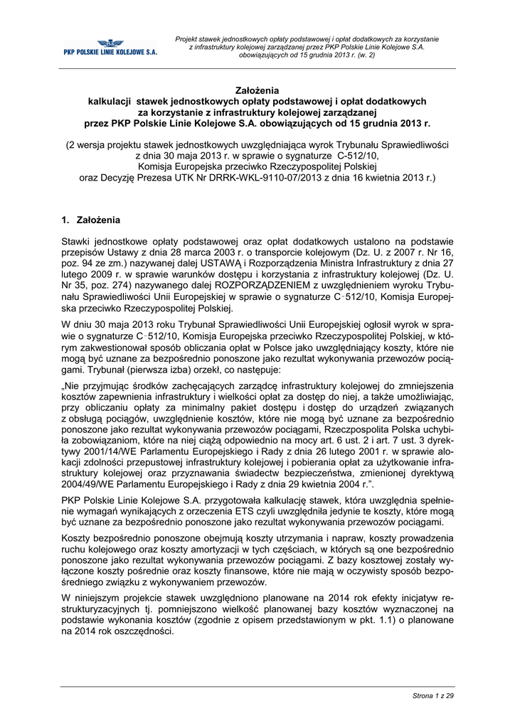 Projekt stawek jednostkowych opłaty podstawowej i opłat dodatkowych za korzystanie z infrastruktury kolejowej zarządzanej przez PKP Polskie Linie Kolejowe S.A. obowiązujących od 15 grudnia 2013 r. (w. 2) Założenia kalkulacji stawek jednostkowych opłaty podstawowej i opłat dodatkowych za korzystanie z infrastruktury kolejowej zarządzanej przez PKP Polskie Linie Kolejowe S.A. obowiązujących od 15 grudnia 2013 r. (2 wersja projektu stawek jednostkowych uwzględniająca wyrok Trybunału Sprawiedliwości z dnia 30 maja 2013 r. w sprawie o sygnaturze C-512/10, Komisja Europejska przeciwko Rzeczypospolitej Polskiej oraz Decyzję Prezesa UTK Nr DRRK-WKL-9110-07/2013 z dnia 16 kwietnia 2013 r.) 1. Założenia Stawki jednostkowe opłaty podstawowej oraz opłat dodatkowych ustalono na podstawie przepisów Ustawy z dnia 28 marca 2003 r. o transporcie kolejowym (Dz. U. z 2007 r. Nr 16, poz. 94 ze zm.) nazywanej dalej USTAWĄ i Rozporządzenia Ministra Infrastruktury z dnia 27 lutego 2009 r. w sprawie warunków dostępu i korzystania z infrastruktury kolejowej (Dz. U. Nr 35, poz. 274) nazywanego dalej ROZPORZĄDZENIEM z uwzględnieniem wyroku Trybunału Sprawiedliwości Unii Europejskiej w sprawie o sygnaturze C‑512/10, Komisja Europejska przeciwko Rzeczypospolitej Polskiej. W dniu 30 maja 2013 roku Trybunał Sprawiedliwości Unii Europejskiej ogłosił wyrok w sprawie o sygnaturze C‑512/10, Komisja Europejska przeciwko Rzeczypospolitej Polskiej, w którym zakwestionował sposób obliczania opłat w Polsce jako uwzględniający koszty, które nie mogą być uznane za bezpośrednio ponoszone jako rezultat wykonywania przewozów pociągami. Trybunał (pierwsza izba) orzekł, co następuje: „Nie przyjmując środków zachęcających zarządcę infrastruktury kolejowej do zmniejszenia kosztów zapewnienia infrastruktury i wielkości opłat za dostęp do niej, a także umożliwiając, przy obliczaniu opłaty za minimalny pakiet dostępu i dostęp do urządzeń związanych z obsługą pociągów, uwzględnienie kosztów, które nie mogą być uznane za bezpośrednio ponoszone jako rezultat wykonywania przewozów pociągami, Rzeczpospolita Polska uchybiła zobowiązaniom, które na niej ciążą odpowiednio na mocy art. 6 ust. 2 i art. 7 ust. 3 dyrektywy 2001/14/WE Parlamentu Europejskiego i Rady z dnia 26 lutego 2001 r. w sprawie alokacji zdolności przepustowej infrastruktury kolejowej i pobierania opłat za użytkowanie infrastruktury kolejowej oraz przyznawania świadectw bezpieczeństwa, zmienionej dyrektywą 2004/49/WE Parlamentu Europejskiego i Rady z dnia 29 kwietnia 2004 r.”. PKP Polskie Linie Kolejowe S.A. przygotowała kalkulację stawek, która uwzględnia spełnienie wymagań wynikających z orzeczenia ETS czyli uwzględniła jedynie te koszty, które mogą być uznane za bezpośrednio ponoszone jako rezultat wykonywania przewozów pociągami. Koszty bezpośrednio ponoszone obejmują koszty utrzymania i napraw, koszty prowadzenia ruchu kolejowego oraz koszty amortyzacji w tych częściach, w których są one bezpośrednio ponoszone jako rezultat wykonywania przewozów pociągami. Z bazy kosztowej zostały wyłączone koszty pośrednie oraz koszty finansowe, które nie mają w oczywisty sposób bezpośredniego związku z wykonywaniem przewozów. W niniejszym projekcie stawek uwzględniono planowane na 2014 rok efekty inicjatyw restrukturyzacyjnych tj. pomniejszono wielkość planowanej bazy kosztów wyznaczonej na podstawie wykonania kosztów (zgodnie z opisem przedstawionym w pkt. 1.1) o planowane na 2014 rok oszczędności. Strona 1 z 29 Projekt stawek jednostkowych opłaty podstawowej i opłat dodatkowych za korzystanie z infrastruktury kolejowej zarządzanej przez PKP Polskie Linie Kolejowe S.A. obowiązujących od 15 grudnia 2013 r. (w. 2) Na podstawie pisma Ministerstwa Transportu, Budownictwa i Gospodarki Morskiej z dnia 23 sierpnia 2013 r. nie przewidziano dofinansowania z budżetu państwa i Funduszu Kolejowego wpływającego na obniżenie stawek jednostkowych opłaty podstawowej. Dodatkowo, w stosunku do 1. wersji cennika wprowadzono następujące zmiany: 1) zwiększone, po przeprowadzeniu konsultacji z przewoźnikami kolejowymi, wielkości przedziałów mas brutto pociągów w części cennika dot. stawek za minimalny dostęp do infrastruktury kolejowej z 10 ton do 60 ton dla wszystkich pociągów pasażerskich i towarowych o masie brutto mniejszej od 900 ton oraz do 100 ton dla pociągów towarowych o masie ponad 900 ton; 2) wprowadzenie w Regulaminie przydzielania tras pociągów i korzystania z przydzielonych tras pociągów przez licencjonowanych przewoźników kolejowych w ramach rozkładu jazdy 2013/2014 zasady, że przy wyznaczaniu całkowitej masy brutto pociągu przyjmuje się masę lokomotyw według przydzielonej trasy pociągu; 3) inne zasady kategoryzacji stacji i przystanków, na których będą udostępniane perony. Zaktualizowano obliczenia średniej dopuszczalnej prędkości technicznej dla odcinków linii kolejowej oraz Wykaz linii kolejowych zarządzanych przez PKP Polskie Linie Kolejowe S.A. z przyporządkowaniem im stawek jednostkowych opłaty podstawowej za minimalny dostęp do infrastruktury kolejowej dla pociągów pasażerskich i towarowych obowiązujących od 15 grudnia 2013 r. W Wykazie stacji i przystanków z przyporządkowaniem im stawek jednostkowych opłaty podstawowej za dostęp i korzystanie z peronów obowiązujących od 15 grudnia 2013 r. zaktualizowano dane dotyczące kategorii stacji, przystanków i peronów oraz wygłaszania komunikatów megafonowych i obsługi urządzeń informacji wizualnej. 1.1. Planowana baza kosztów Planowana baza kosztów na 2014 r. będąca podstawą kalkulacji stawek jednostkowych dla rozkładu jazdy pociągów 2013/2014 została wyznaczona z wykorzystaniem: 1) wykonania kosztów 2012 r., 2) korekt kosztowych na wykonaniu kosztów 2012 r., 3) wskaźników wzrostu cen materiałów, energii, usług obcych 