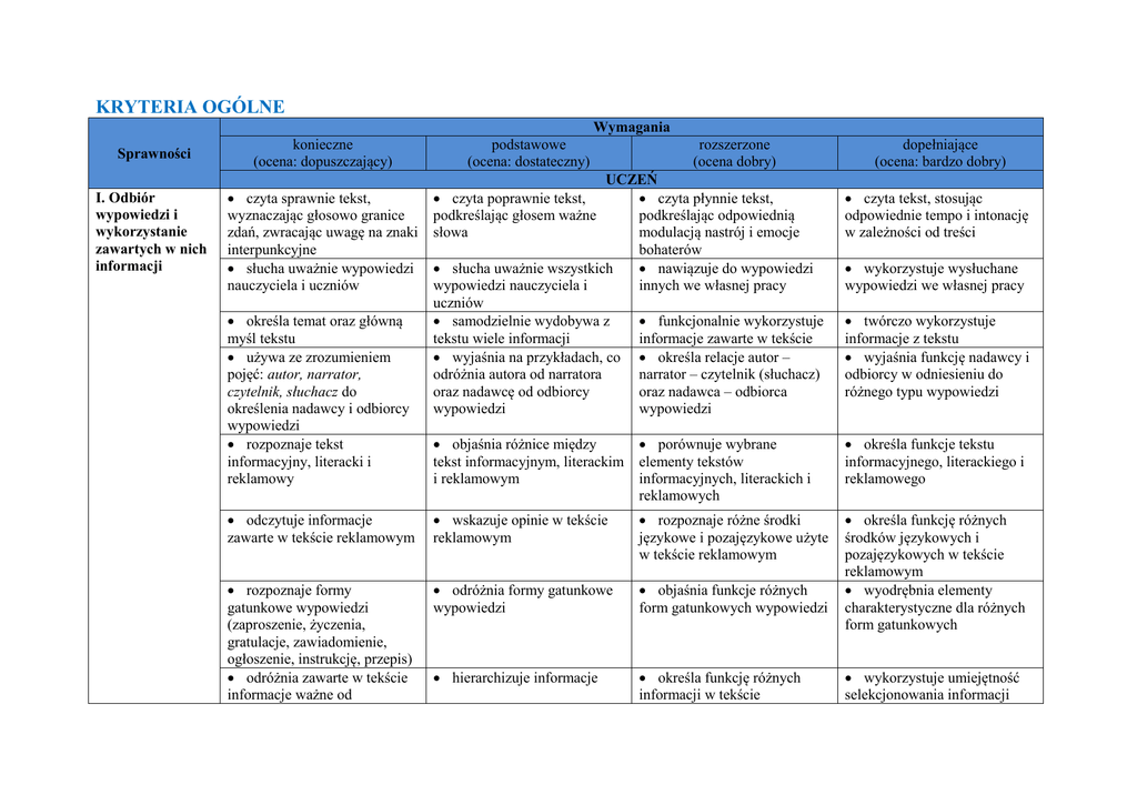KRYTERIA OGÓLNE Wymagania Sprawności konieczne (ocena: dopuszczający) I. Odbiór wypowiedzi i wykorzystanie zawartych w nich informacji czyta sprawnie tekst, wyznaczając głosowo granice zdań, zwracając uwagę na znaki interpunkcyjne słucha uważnie wypowiedzi nauczyciela i uczniów określa temat oraz główną myśl tekstu używa ze zrozumieniem pojęć: autor, narrator, czytelnik, słuchacz do określenia nadawcy i odbiorcy wypowiedzi rozpoznaje tekst informacyjny, literacki i reklamowy podstawowe (ocena: dostateczny) rozszerzone (ocena dobry) UCZEŃ czyta płynnie tekst, podkreślając odpowiednią modulacją nastrój i emocje bohaterów słucha uważnie wszystkich nawiązuje do wypowiedzi wypowiedzi nauczyciela i innych we własnej pracy uczniów samodzielnie wydobywa z funkcjonalnie wykorzystuje tekstu wiele informacji informacje zawarte w tekście wyjaśnia na przykładach, co określa relacje autor – odróżnia autora od narratora narrator – czytelnik (słuchacz) oraz nadawcę od odbiorcy oraz nadawca – odbiorca wypowiedzi wypowiedzi czyta poprawnie tekst, podkreślając głosem ważne słowa dopełniające (ocena: bardzo dobry) czyta tekst, stosując odpowiednie tempo i intonację w zależności od treści wykorzystuje wysłuchane wypowiedzi we własnej pracy twórczo wykorzystuje informacje z tekstu wyjaśnia funkcję nadawcy i odbiorcy w odniesieniu do różnego typu wypowiedzi objaśnia różnice między tekst informacyjnym, literackim i reklamowym porównuje wybrane elementy tekstów informacyjnych, literackich i reklamowych określa funkcje tekstu informacyjnego, literackiego i reklamowego odczytuje informacje zawarte w tekście reklamowym wskazuje opinie w tekście reklamowym rozpoznaje różne środki językowe i pozajęzykowe użyte w tekście reklamowym rozpoznaje formy gatunkowe wypowiedzi (zaproszenie, życzenia, gratulacje, zawiadomienie, ogłoszenie, instrukcję, przepis) odróżnia zawarte w tekście informacje ważne od odróżnia formy gatunkowe wypowiedzi objaśnia funkcje różnych form gatunkowych wypowiedzi określa funkcję różnych środków językowych i pozajęzykowych w tekście reklamowym wyodrębnia elementy charakterystyczne dla różnych form gatunkowych hierarchizuje informacje określa funkcję różnych informacji w tekście wykorzystuje umiejętność selekcjonowania informacji drugorzędnych wyszukuje w tekście informacje wyrażone wprost i pośrednio odczytuje treści wyrażone wprost i pośrednio rozumie dosłowne i przenośne znaczenia wyrazów w wypowiedzi odróżnia znaczenia dosłowne wyrazów od znaczeń przenośnych w wypowiedzi funkcjonalnie wykorzystuje informacje wyrażone pośrednio do opisu różnych elementów świata przedstawionego w utworze określa wpływ przenośnych i dosłownych znaczeń wyrazów na odbiór wypowiedzi wyciąga wnioski wynikające z przesłanek zawartych w tekście wyodrębnia w tekście części składowe i dostrzega relacje między nimi samodzielnie korzysta z informacji zawartych w słowniku ortograficznym, słowniku języka polskiego oraz wyrazów bliskoznacznych samodzielnie wyszukuje hasła w encyklopedii tradycyjnej oraz internetowej rozpoznaje podmiot orzeczenie, przydawkę, dopełnienie i okolicznik w zdaniu odróżnia kłamstwo od fikcji literackiej rozpoznaje elementy manipulacji językowej określa relacje między częściami składowymi wypowiedzi zna budowę i funkcję słowników wyrazów obcych, frazeologicznego oraz poprawnej polszczyzny określa funkcje części składowych wypowiedzi korzysta z informacji zawartych w encyklopedii korzysta z informacji zawartych na tematycznych portalach internetowych objaśnia funkcję różnych części zdania rozpoznaje w tekście zdania pojedyncze rozwinięte i nierozwinięte, zdania pojedyncze i złożone oraz określa funkcję w tekście zdań pojedynczych rozwiniętych i nierozwiniętych, zdań pojedynczych i złożonych odróżnia orzeczenie czasownikowe od imiennego i zna ich funkcję korzysta ze słowników frazeologicznego oraz poprawnej polszczyzny rozpoznaje różne typy zdań złożonych współrzędnie i określa ich funkcję podczas korzystania z różnych źródeł (m.in. internetu) wyszukuje informacje wyrażone wprost i pośrednio w tekstach o wyższym stopniu organizacji określa funkcję przenośnych znaczeń wyrazów w różnych tekstach (informacyjnych, literackich, reklamowych) odróżnia perswazję od manipulacji funkcjonalnie wykorzystuje wiedzę o budowie tekstu do odczytywania jego sensu korzysta z różnych typów słowników – odpowiednio do potrzeb korzysta z różnych źródeł informacji odpowiednio do potrzeb funkcjonalnie wykorzystuje różne typy podmiotów i orzeczeń oraz inne części zdania w swoich wypowiedziach celowo wykorzystuje różne typy wypowiedzeń dla osiągnięcia zamierzonych efektów II. Analiza i interpretacja tekstów kultury równoważniki zdań rozpoznaje w wypowiedziach rzeczowniki, czasowniki, przymiotniki, przysłówki, liczebniki, zaimki, przyimki i spójniki rozpoznaje w tekście formy przypadków, liczb, osób, rodzajów gramatycznych, czasów odmiennych części mowy rozpoznaje znaczenie niewerbalnych środków komunikowania się (gest, wyraz twarzy, mimika, postawa ciała) nazywa reakcje czytelnicze wypowiada się na temat sytuacji bohatera literackiego i filmowego wyraża swój stosunek do postaci ukazanych w różnych tekstach kultury rozpoznaje różne teksty kultury (tekst literacki, film, przedstawienie teatralne, balet, dzieło muzyczne, obraz, rzeźbę, fotografię, przedmioty sztuki użytkowej) odróżnia fikcję literacką od rzeczywistości wskazuje prawdopodobne oraz równoważników zdań objaśnia różnice między podstawowymi częściami mowy określa funkcje różnych części mowy w wypowiedzeniu wykorzystuje wiedzę o funkcjach zaimków w swoich wypowiedziach ustnych i pisemnych określa funkcje form przypadków, liczb, osób, rodzajów gramatycznych, czasów