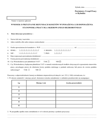 Rybnik, dnia ……………..… Powiatowy Urząd Pracy w Rybniku Numer w rejestrze zgłoszeń WNIOSEK O PRZYZNANIE REFUNDACJI KOSZTÓW WYPOSAŻENIA LUB DOPOSAŻENIA STANOWISKA PRACY DLA SKIEROWANEGO BEZROBOTNEGO I. Dane dotyczące pracodawcy : 1. Nazwa lub imię i nazwisko: ....................................................................................................................................................... 2. Adres siedziby albo adres miejsca zamieszkania: ………………………………………………………………………….. ………………………………………………………………………………………………………………………………… 3. Osoba upoważniona do kontaktów z PUP : .......................................................................... tel. ........................................... 4. PESEL : 5. REGON : 6. NIP : 7. PKD : 8. Data rozpoczęcia prowadzenia działalności : ............................................................................................................................ 9. Forma prawna prowadzonej działalności: ................................................................................................................................. 10. Czy Wnioskodawca jest płatnikiem VAT? TAK NIE 11. Czy Wnioskodawcy będącemu płatnikiem VAT w ramach wnioskowanych środków dotyczących wyposażenia stanowiska pracy, przysługuje prawo do obniżenia kwoty podatku należnego o podatek naliczony lub prawo do zwrotu podatku naliczonego? TAK NIE Pouczony o odpowiedzialności karnej za składanie nieprawdziwych danych ( art. 233 § 1 KK) oświadczam, że : 1. W okresie ostatnich 6 miesięcy przed złożeniem wniosku zatrudnienie w zakładzie przedstawiało się następująco: Lp Miesiąc i rok Liczba pracowników 1 2 3 4 5 6 2. W przypadku spadku stanu zatrudnienia w w/w okresie prosimy o podanie przyczyny: ……………………………………………………………………………………………………………………………………… ……………………………………………………………………………………………………………………………………… OŚWIADCZENIA Pouczony o odpowiedzialności karnej wynikającej z art. 233 § 1 Kodeksu Karnego: „kto składając zeznanie mające służyć na dowód w postępowaniu sądowym lub innym postępowaniu prowadzonym na podstawie ustawy, zeznaje nieprawdę lub zataja prawdę, podlega karze pozbawienia wolności od 6 miesięcy do lat 8”, oświadczam, że: 1. zapoznałem się z treścią regulaminu w sprawie szczegółowych warunków udzielania jednorazowych środków na podjęcie działalności gospodarczej oraz refundacji kosztów wyposażenia lub doposażenia stanowiska pracy (www.pup-rybnik.pl); 2. nie zmniejszałem wymiaru czasu pracy pracownika i nie rozwiązałem stosunku pracy z pracownikiem w drodze wypowiedzenia dokonanego przeze mnie, bądź na mocy porozumienia stron z przyczyn niedotyczących pracowników w okresie 6 miesięcy bezpośrednio poprzedzających dzień złożenia wniosku; 3. nie będę zmniejszał wymiaru czasu pracy pracownika i nie będę rozwiązywał stosunku pracy z pracownikiem w drodze wypowiedzenia dokonanego przeze mnie, bądź na mocy porozumienia stron z przyczyn niedotyczących pracowników w okresie od dnia złożenia wniosku do dnia otrzymania refundacji; 4. prowadzę działalność gospodarczą, w rozumieniu przepisów o swobodzie działalności gospodarczej, przez okres 6 miesięcy bezpośrednio poprzedzających dzień złożenia wniosku (do okresu prowadzenia działalności gospodarczej nie wlicza się okresu zawieszenia działalności gospodarczej); * 5. prowadzę działalność na podstawie ustawy z dnia 7 września 1991 r. o systemie oświaty przez okres 6 miesięcy bezpośrednio poprzedzających dzień złożenia wniosku; ** 6. posiadam gospodarstwo rolne w rozumieniu przepisów o podatku rolnym lub prowadzeniu działu specjalnego produkcji rolnej w rozumieniu przepisów o podatku dochodowym od osób fizycznych lub przepisów o podatku dochodowym od osób prawnych przez okres co najmniej 6 miesięcy bezpośrednio poprzedzających dzień złożenia wniosku; *** 7. nie zalegam w dniu złożenia wniosku z wypłacaniem wynagrodzeń pracownikom oraz z opłacaniem należnych składek na ubezpieczenia społeczne, ubezpieczenie zdrowotne, Fundusz Pracy, Fundusz Gwarantowanych Świadczeń Pracowniczych oraz Fundusz Emerytur Pomostowych; 8. nie zalegam w dniu złożenia wniosku z opłacaniem innych danin publicznych; 9. nie posiadam w dniu złożenia wniosku nieuregulowanych w terminie zobowiązań cywilnoprawnych; 10. nie byłem karany w okresie 2 lat przed dniem złożenia wniosku za przestępstwo przeciwko obrotowi gospodarczemu, w rozumieniu ustawy z dnia 6 czerwca 1997 r. – Kodeks karny (Dz. U. Nr 88, poz. 553, z późn. zm.) lub ustawy z dnia 28 października 2002 r. o odpowiedzialności podmiotów zbiorowych za czyny zabronione pod groźbą kary (Dz. U. Nr 197, poz. 1661, z późn. zm.). 11. w roku bieżącym oraz w ciągu 2 w wielkości:…………………………….; poprzedzających go lat uzyskałem / nie uzyskałem pomoc de minimis 12. otrzymałem / nie otrzymałem pomoc publiczną w odniesieniu do tych samych kosztów kwalifikujących się do objęcia pomocą, na pokrycie których ma być przeznaczona pomoc de minimis, o którą wnioskuję w wielkości………………………...…… z przeznaczeniem na ……………………….……………….. …..……………………..… (data) *dotyczy tylko podmiotu prowadzącego działalność gospodarczą ** dotyczy tylko niepublicznych szkół i przedszkoli *** dotyczy tylko producentów rolnych .………………………………... (podpis wnioskodawcy) II. Oferta pracy dla skierowanych bezrobotnych 1. Zgłaszam ofertę przyjęcia do pracy .............. osób / osoby.