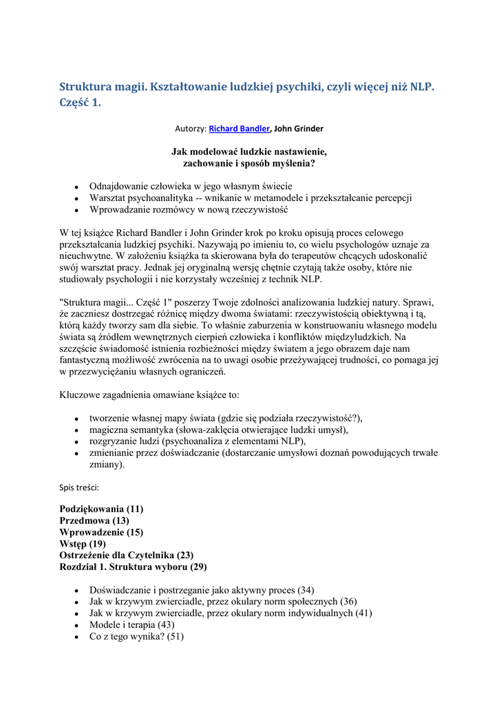 Struktura magii. Kształtowanie ludzkiej psychiki, czyli więcej niż NLP. Część 1. Autorzy: Richard Bandler, John Grinder Jak modelować ludzkie nastawienie, zachowanie i sposób myślenia? Odnajdowanie człowieka w jego własnym świecie Warsztat psychoanalityka -- wnikanie w metamodele i przekształcanie percepcji Wprowadzanie rozmówcy w nową rzeczywistość W tej książce Richard Bandler i John Grinder krok po kroku opisują proces celowego przekształcania ludzkiej psychiki. Nazywają po imieniu to, co wielu psychologów uznaje za nieuchwytne. W założeniu książka ta skierowana była do terapeutów chcących udoskonalić swój warsztat pracy. Jednak jej oryginalną wersję chętnie czytają także osoby, które nie studiowały psychologii i nie korzystały wcześniej z technik NLP. "Struktura magii... Część 1" poszerzy Twoje zdolności analizowania ludzkiej natury. Sprawi, że zaczniesz dostrzegać różnicę między dwoma światami: rzeczywistością obiektywną i tą, którą każdy tworzy sam dla siebie. To właśnie zaburzenia w konstruowaniu własnego modelu świata są źródłem wewnętrznych cierpień człowieka i konfliktów międzyludzkich. Na szczęście świadomość istnienia rozbieżności między światem a jego obrazem daje nam fantastyczną możliwość zwrócenia na to uwagi osobie przeżywającej trudności, co pomaga jej w przezwyciężaniu własnych ograniczeń. Kluczowe zagadnienia omawiane książce to: tworzenie własnej mapy świata (gdzie się podziała rzeczywistość?), magiczna semantyka (słowa-zaklęcia otwierające ludzki umysł), rozgryzanie ludzi (psychoanaliza z elementami NLP), zmienianie przez doświadczanie (dostarczanie umysłowi doznań powodujących trwałe zmiany). Spis treści: Podziękowania (11) Przedmowa (13) Wprowadzenie (15) Wstęp (19) Ostrzeżenie dla Czytelnika (23) Rozdział 1. Struktura wyboru (29) Doświadczanie i postrzeganie jako aktywny proces (34) Jak w krzywym zwierciadle, przez okulary norm społecznych (36) Jak w krzywym zwierciadle, przez okulary norm indywidualnych (41) Modele i terapia (43) Co z tego wynika? (51) Rozdział 2. Struktura języka (53) Metamodel języka (58) Wybrane zasady dotyczące procesów językowych u ludzi (59) Model transformacyjny (63) W ogólnym zarysie (75) Podsumowanie (78) Rozdział 3. Struktura magii (79) Metamodel (81) Struktura głęboka i to, co poza nią (89) Kwestionowanie struktury głębokiej (93) Podsumowanie (104) W ogólnym zarysie (104) Rozdział 4. Zaklęcia do rozwoju potencjału (107) Ćwiczenie A (108) Pominięcie (110) Zniekształcenia - nominalizacje (132) Ćwiczenie B (139) Uogólnienia (141) Poprawność semantyczna (165) Poprawność dla celów terapii (183) Ćwiczenie C (184) Rozdział 5. Struktura magii w praktyce (187) Stenogram nr 1 (189) Stenogram nr 2 (220) Rozdział 6. Stając się uczniem czarnoksiężnika (251) Drugi składnik - struktury odniesienia (254) Odgrywanie - natychmiastowa powtórka doświadczenia (265) Fantazja kierowana - podróż w nieznane (268) Paradoksy terapeutyczne (273) Różne mapy tego samego terytorium (278) Kongruencja (280) Terapia rodzinna (284) Podsumowanie (286) Konkluzja (289) Załącznik A Krótki zarys gramatyki transformacyjnej (293) Poprawność i struktura składnikowa (296) Synonimia (312) Glosariusz (331) Bibliografia (335)