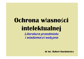 Ochrona własności intelektualnej Literatura przedmiotu i wiadomości wstępne dr inż. Robert Stachniewicz SZCZEGÓŁOWY PROGRAM PRZEDMIOTU Rodzaj studiów stacjonarne I stopnia Kierunek studiów Budownictwo Specjalność Kod przedmiotu Nazwa przedmiotu (zgodna z planem studiów) ECTS B07300 Ochrona własności intelektualnej 1 Jednostka (katedra/zakład) realizująca przedmiot Semestr WBiIS Katedra Podstaw Budownictwa i Ochrony Budowli Rodzaj (forma) zajęć dydaktycznych Wykład Liczba godzin w semestrze VII 15 Treści kształcenia 1. Omówienie zakresu przedmiotu i wiadomości wstępne (własność intelektualna, własność przemysłowa, prawo wyłączne). 2. Własność przemysłowa – podstawowe pojęcia. Ochrona własności przemysłowej w Polsce. 3. Własność przemysłowa cd. Postępowanie przed Urzędem Patentowym, 4. Własność przemysłowa cd. Organizacje i porozumienia międzynarodowe dotyczące własności przemysłowej. 5. Własność intelektualna w uczelniach. Rola rzecznika patentowego, własność „chroniona” i „nie chroniona”. 6. Własność intelektualna w uczelniach cd. Własność jawna i know-how. 7. Własność intelektualna w uczelniach cd. Prawa autorskie i prawo własności przemysłowej. 8. Prawa autorskie - objaśnienie wybranych pojęć, podstawy prawne. 9. Prawa autorskie cd. Rodzaje utworów, prawa twórców, utwory pracownicze. 10. Prawa autorskie w odniesieniu do prac dyplomowych. Zgodny z prawem sposób korzystania z utworów osób trzecich. 11. Rodzaje informacji patentowej. Zawartość opisu patentu i systemy klasyfikacyjne. 12. Rodzaje informacji patentowej cd. Informacja źródłowa o patentach i bazy danych dotyczące patentów. 13. Wykorzystanie informacji patentowej. 14. Podsumowanie materiału dotyczącego ochrony własności intelektualnej. 15. Test sprawdzający. Forma oraz warunki zaliczenia zajęć Test pisemny LITERATURA PRZEDMIOTU Książki: Nowak T.: Ochrona własności intelektualnej, wybrane zagadnienia. Wydaw. Politechniki Białostockiej, 2008., Michniewicz G.: Ochrona własności intelektualnej. Wydawnictwo: C.H. Beck, 2010., Załucki M. (red.): Prawo własności intelektualnej : Repetytorium. "Difin", 2008. Sieńczyło-Chlabicz, J.(red.): Prawo własności intelektualnej. LexisNexis Polska, 2009. Szewc A.: Szczególne aspekty ochrony własności intelektualnej. Zeszyty Naukowe – Politechnika Opolska. Oficyna Wydawnicza Politechniki Opolskiej, 2009. Nowińska E.: Polskie prawo własności intelektualnej : prawo autorskie, prawo wynalazcze, prawo znaków towarowych. Twigger, 1998. LITERATURA PRZEDMIOTU Ustawy Źródła krajowe: 1. Ustawa z dnia 4 lutego 1994 r. o prawie autorskim i prawach pokrewnych (Dz.U. 1994 Nr 24 poz.83 z późniejszymi zmianami). 2. Ustawa z dnia 30 czerwca 2000 r. Prawo własności przemysłowej (Dz.U. 2001 Nr 49 poz.508 z późniejszymi zmianami). 3. Ustawa z dnia 16 kwietnia 1993 r. o zwalczaniu nieuczciwej konkurencji (Dz.U. nr 47 poz. 211). 4. Ustawa z dnia 11 kwietnia 2001 r. o rzecznikach patentowych (Dz.U. 2001 nr 49 poz. 509). 5. Ustawa z dnia 16 luty 2007 r. o ochronie konkurencji i konsumentów (Dz.U. 2007 nr 50 poz. 331). 6. Ustawa z dnia 23 sierpnia 2007 r. o przeciwdziałaniu nieuczciwym praktykom rynkowym (Dz.U. 2007 nr 171 poz. 1206 ). 7. Ustawa z dnia 27 lipca 2001 r. o ochronie baz danych (Dz.U. 2001 nr 128 poz.1402 z późniejszymi zmianami). 8. Ustawa z dnia 27 lipca 2005 r. Prawo o szkolnictwie wyższym (Dz.U. 2005 nr 164 poz. 1365) w kwestiach dotyczących akademickich inkubatorów przedsiębiorczości, centrów transferu technologii (art. 86) oraz pierwszeństwa do opublikowania pracy dyplomowej studenta (art. 239). LITERATURA PRZEDMIOTU Źródła międzynarodowe: 1. Konwencja Paryska o ochronie własności przemysłowej z dnia 20 marca 1883r. 2. Konwencja Berneńska o ochronie dzieł literackich i artystycznych z dnia 9 września 1886r. oraz obowiązujący obecnie Akt Paryski z dnia 24 lipca 1971r. 3. Konwencja o ustanowieniu Światowej Organizacji Własności Intelektualnej (World Intellectual Property Organization - WIPO) – Sztokholm, z dnia 14 lipca 1967r. 4. Inne konwencje i traktaty oraz porozumienia m.in..Porozumienie w sprawie Handlowych Aspektów Praw Własności Intelektualnej (Agreement on Trade-Related Aspects of Intellectual Property Rights - TRIPS) – Marrakesz z dnia 15 kwietnia 1994r. wraz z protokołem zmieniającym (Genewa, 6 grudnia 2005r.). 5. We wspólnocie UE kilkadziesiąt Rozporządzeń i Dyrektyw dot. Ochrony praw autorskich i praw pokrewnych, wynagrodzeń z tytułu ich odsprzedaży, egzekwowania praw własności intelektualnej, nieuczciwych praktyk handlowych i zbliżenia ustawodawstw państw członkowskich odnoszących Sie do znaków towarowych. DEFINICJE Własność intelektualna – wszystkie rodzaje praw (osobistych i majątkowych) dotyczących wytworów ludzkiego umysłu tzn. działalności intelektualnej w dziedzinie przemysłowej, naukowej, literackiej, artystycznej. Własność przemysłowa – zaliczamy do niej wynalazki, wzory użytkowe, wzory przemysłowe, technologie, sekrety przemysłowe i handlowe, znaki towarowe i usługowe, nazwy handlowe, oznaczenia i nazwy pochodzenia (geograficzne) Przykłady własności intelektualnej z życia codziennego: R R TM – (TradeMark) oznacza znak towarowy (bez informacji o rejestracji), SM – (ServiceMark) oznacza znak usługowy (j.w. np. wyznaczone osoby mające tytuł Certified Novell Engineer(sm)), ® – (Registered) oznacza, że znak towarowy, przy którym widnieje dany symbol jest zarejestrowany, © – (Copyright) oznacza zastrzeżenie praw autorskich do znaku towarowego. Używanie powyższych znaków nie jest obowiązkowe ale zalecane. WIEDZA Wiedza niechroniona (wolna) Wiedza chroniona w pełni dostępna chroniona przez utajnienie (know-how) chroniona prawnie rejestracja bez rejestracji Własność przemysłowa wynalazki wzory użytkowe oznaczenia pochodzenia wzory przemysłowe Utwory, w 