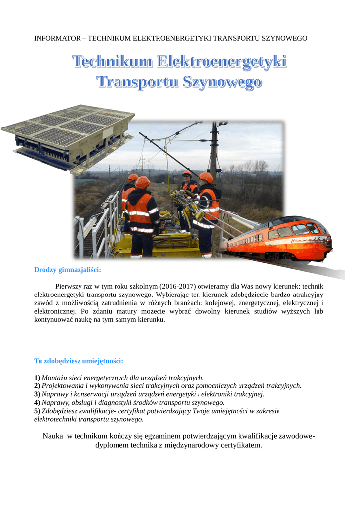 INFORMATOR – TECHNIKUM ELEKTROENERGETYKI TRANSPORTU SZYNOWEGO Drodzy gimnazjaliści: Pierwszy raz w tym roku szkolnym (2016-2017) otwieramy dla Was nowy kierunek: technik elektroenergetyki transportu szynowego. Wybierając ten kierunek zdobędziecie bardzo atrakcyjny zawód z możliwością zatrudnienia w różnych branżach: kolejowej, energetycznej, elektrycznej i elektronicznej. Po zdaniu matury możecie wybrać dowolny kierunek studiów wyższych lub kontynuować naukę na tym samym kierunku. Tu zdobędziesz umiejętności: 1) Montażu sieci energetycznych dla urządzeń trakcyjnych. 2) Projektowania i wykonywania sieci trakcyjnych oraz pomocniczych urządzeń trakcyjnych. 3) Naprawy i konserwacji urządzeń urządzeń energetyki i elektroniki trakcyjnej. 4) Naprawy, obsługi i diagnostyki środków transportu szynowego. 5) Zdobędziesz kwalifikacje- certyfikat potwierdzający Twoje umiejętności w zakresie elektrotechniki transportu szynowego. Nauka w technikum kończy się egzaminem potwierdzającym kwalifikacje zawodowedyplomem technika z międzynarodowy certyfikatem. Informacja o kierunku kształcenia: Technikum elektroenergetyki transportu szynowego- nauka trwa 4 lata Po ukończeniu uczeń- absolwent otrzymuje średnie wykształcenie, maturę, dyplom technika elektroenergetyki transportu szynowego . W czasie nauki uczniowie zdobywają wiedzę teoretyczna i praktyczną w zakresie: -budowy urządzeń i instalacji energetyki transportu szynowego -budowy i modernizacji sieci energetycznej -obsługi wszystkich urządzeń sterujących i napędowych transportu szynowego Na zajęciach praktycznych i praktyce zawodowej zetkniesz się z urządzeniami przy których po ukończeniu szkoły będziesz pracował Przedmioty zawodowe: - Elektrotechnika i elektronika - Sieci zasilające i trakcje elektryczne - Środki transportu szynowego - Język obcy w transporcie szynowym - Miernictwo i diagnostyka w transporcie szynowym - Montaż i utrzymanie sieci zasilających i trakcji elektrycznej - Eksploatacja środków transportu szynowego - Praktyka zawodowa Kwalifikacje: - Montaż i eksploatacja sieci zasilających oraz trakcji elektrycznej (E.28) - Montaż i eksploatacja środków transportu szynowego (E.26) Perspektywy zatrudnienia: Po ukończeniu szkoły możesz podjąć pracę w całej branży taboru szynowego w kraju i za granicą. Możesz pracować w elektroenergetyce – budowa, remonty i modernizacja sieci elektroenergetycznej niskich i wysokich napięć. Dobrze przygotowany technik elektroenergetyk znajdzie zatrudnienie niemal we wszystkich gałęziach przemysłu przy obsłudze, naprawie, konserwacji i modernizacji urządzeń elektrycznych i elektroenergetycznych. W czasie nauki oferujemy bardzo dobrze przygotowaną kadrę pedagogiczną z przedmiotów humanistycznych i zawodowych. Zapewniamy pełną realizację programu dydaktycznego ze wszystkich przedmiotów zawodowych, a tym samym przygotowania Was do przyszłej pracy zawodowej o tej specjalności. W realizacji tej pomoże nam szybko modernizująca się u nas kolei z cała infrastrukturą. Ten kierunek to nowość i szansa dla Ciebie skorzystaj z naszej oferty edukacyjnej. Serdecznie zapraszamy