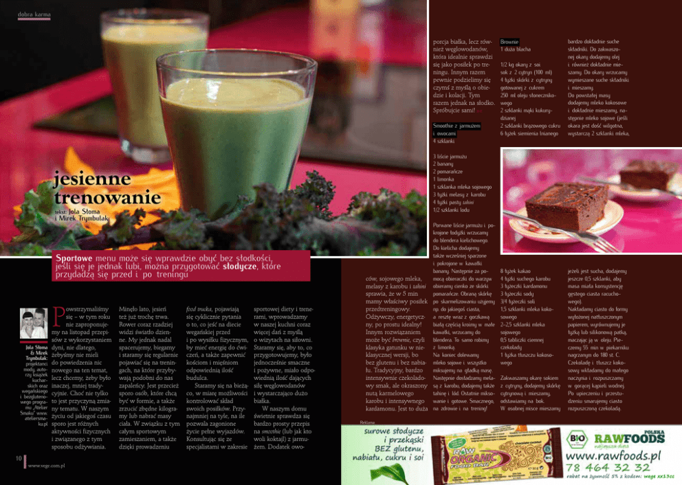 dobra karma porcja białka, lecz również węglowodanów, która idealnie sprawdzi się jako posiłek po treningu. Innym razem pewnie podzielimy się czymś z myślą o obiedzie i kolacji. Tym razem jednak na słodko. Spróbujcie sami! Smoothie z jarmużem i owocami 4 szklanki Jola Słoma i Mirek Trymbulak tekst: Sportowe menu może się wprawdzie obyć bez słodkości, jeśli się je jednak lubi, można przygotować słodycze, które przydadzą się przed i po treningu P Jola Słoma & Mirek Trymbulak: projektanci mody, autorzy książek kucharskich oraz wegańskiego i bezglutenowego programu „Atelier Smaku” www. ateliersmaku.pl Minęło lato, jesień też już trochę trwa. Rower coraz rzadziej widzi światło dzienne. My jednak nadal spacerujemy, biegamy i staramy się regularnie pojawiać się na treningach, na które przybywają podobni do nas zapaleńcy. Jest przecież sporo osób, które chcą być w formie, a także zrzucić zbędne kilogramy lub nabrać masy ciała. W związku z tym całym sportowym zamieszaniem, a także dzięki prowadzeniu 1/2 kg okary z soi sok z 2 cytryn (100 ml) 4 łyżki skórki z cytryny gotowanej z cukrem 250 ml oleju słonecznikowego 2 szklanki mąki kukurydzianej 2 szklanki brązowego cukru 6 łyżek siemienia lnianego bardzo dokładnie suche składniki. Do zakwaszonej okary dodajemy olej i również dokładnie mieszamy. Do okary wrzucamy wymieszane suche składniki i mieszamy. Do powstałej masy dodajemy mleko kokosowe i dokładnie mieszamy, następnie mleko sojowe (jeśli okara jest dość wilgotna, wystarczą 2 szklanki mleka, 3 liście jarmużu 2 banany 2 pomarańcze 1 limonka 1 szklanka mleka sojowego 3 łyżki melasy z karobu 4 łyżki pasty tahini 1/2 szklanki lodu jesienne trenowanie owstrzymaliśmy się – w tym roku nie zaproponujemy na listopad przepisów z wykorzystaniem dyni, nie dlatego, żebyśmy nie mieli do powiedzenia nic nowego na ten temat, lecz chcemy, żeby było inaczej, mniej tradycyjnie. Choć nie tylko to jest przyczyną zmiany tematu. W naszym życiu od jakiegoś czasu sporo jest różnych aktywności fizycznych i związanego z tym sposobu odżywiania. Brownie 1 duża blacha food trucka, pojawiają się cyklicznie pytania o to, co jeść na diecie wegańskiej przed i po wysiłku fizycznym, by mieć energię do ćwiczeń, a także zapewnić kościom i mięśniom odpowiednią ilość budulca. Staramy się na bieżąco, w miarę możliwości kontrolować skład swoich posiłków. Przynajmniej na tyle, na ile pozwala zagonione życie pełne wyjazdów. Konsultując się ze specjalistami w zakresie sportowej diety i trenerami, wprowadzamy w naszej kuchni coraz więcej dań z myślą o wizytach na siłowni. Staramy się, aby to, co przygotowujemy, było jednocześnie smaczne i pożywne, miało odpowiednią ilość dających siłę węglowodanów i wystarczająco dużo białka. W naszym domu świetnie sprawdza się bardzo prosty przepis na smoothie (lub jak kto woli koktajl) z jarmużem. Dodatek owo- Porwane liście jarmużu i pokrojone łodyżki wrzucamy do blendera kielichowego. Do kielicha dodajemy także wcześniej sparzone i pokrojone w kawałki banany. Następnie za poców, sojowego mleka, mocą obieraczki do warzyw melasy z karobu i tahini obieramy cienko ze skórki pomarańcze. Obraną skórkę sprawia, że w 5 min mamy właściwy posiłek po skarmelizowaniu użyjemy np. do jakiegoś ciasta, przedtreningowy. Odżywczy, energetycz- a resztę wraz z gorzkawą białą częścią kroimy w małe ny, po prostu idealny! kawałki, wrzucamy do Innym rozwiązaniem może być brownie, czyli blendera. To samo robimy klasyka gatunku w nie- z limonką. Na koniec dolewamy klasycznej wersji, bo bez glutenu i bez nabia- mleko sojowe i wszystko miksujemy na gładką masę. łu. Tradycyjny, bardzo intensywnie czekolado- Następnie dosładzamy melawy smak, ale okraszony są z karobu, dodajemy także tahinę i lód. Ostatnie miksonutą karmelowego karobu i intensywnego wanie i gotowe. Smacznego, kardamonu. Jest to duża na zdrowie i na trening! 8 łyżek kakao 4 łyżki suchego karobu 3 łyżeczki kardamonu 3 łyżeczki sody 3/4 łyżeczki soli 1,5 szklanki mleka kokosowego 2–2,5 szklanki mleka sojowego 0,5 tabliczki ciemnej czekolady 1 łyżka tłuszczu kokosowego Zakwaszamy okarę sokiem z cytryny, dodajemy skórkę cytrynową i mieszamy, odstawiamy na bok. W osobnej misce mieszamy jeżeli jest sucha, dodajemy jeszcze 0,5 szklanki, aby masa miała konsystencję gęstego ciasta racuchowego). Nakładamy ciasto do formy wyłożonej natłuszczonym papierem, wyrównujemy je łyżką lub silikonową patką, maczając ją w oleju. Pieczemy 55 min w piekarniku nagrzanym do 180 st. C. Czekoladę i tłuszcz kokosowy wkładamy do małego naczynia i rozpuszczamy w gorącej kąpieli wodnej. Po upieczeniu i przestudzeniu smarujemy ciasto rozpuszczoną czekoladą. Reklama 10 11 www.vege.com.pl dobra karma