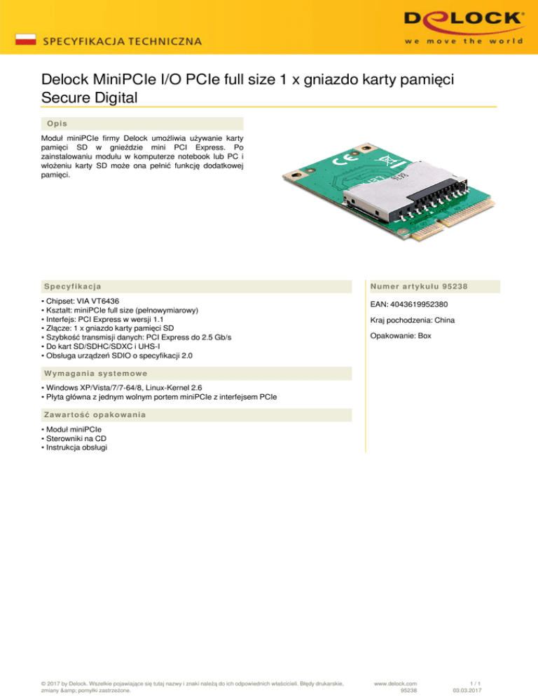 Delock MiniPCIe I/O PCIe full size 1 x gniazdo karty pamięci Secure Digital Opis Moduł miniPCIe firmy Delock umożliwia używanie karty pamięci SD w gnieździe mini PCI Express. Po zainstalowaniu modułu w komputerze notebook lub PC i włożeniu karty SD może ona pełnić funkcję dodatkowej pamięci. Specyfikacja • Chipset: VIA VT6436 • Kształt: miniPCIe full size (pełnowymiarowy) • Interfejs: PCI Express w wersji 1.1 • Złącze: 1 x gniazdo karty pamięci SD • Szybkość transmisji danych: PCI Express do 2.5 Gb/s • Do kart SD/SDHC/SDXC i UHS-I • Obsługa urządzeń SDIO o specyfikacji 2.0 Numer artykułu 95238 EAN: 4043619952380 Kraj pochodzenia: China Opakowanie: Box Wymagania systemowe • Windows XP/Vista/7/7-64/8, Linux-Kernel 2.6 • Płyta główna z jednym wolnym portem miniPCIe z interfejsem PCIe Zawartość opakowania • Moduł miniPCIe • Sterowniki na CD • Instrukcja obsługi © 2017 by Delock. Wszelkie pojawiające się tutaj nazwy i znaki należą do ich odpowiednich właścicieli. Błędy drukarskie, zmiany & pomyłki zastrzeżone. Powered by TCPDF (www.tcpdf.org) www.delock.com 95238 1/1 03.03.2017