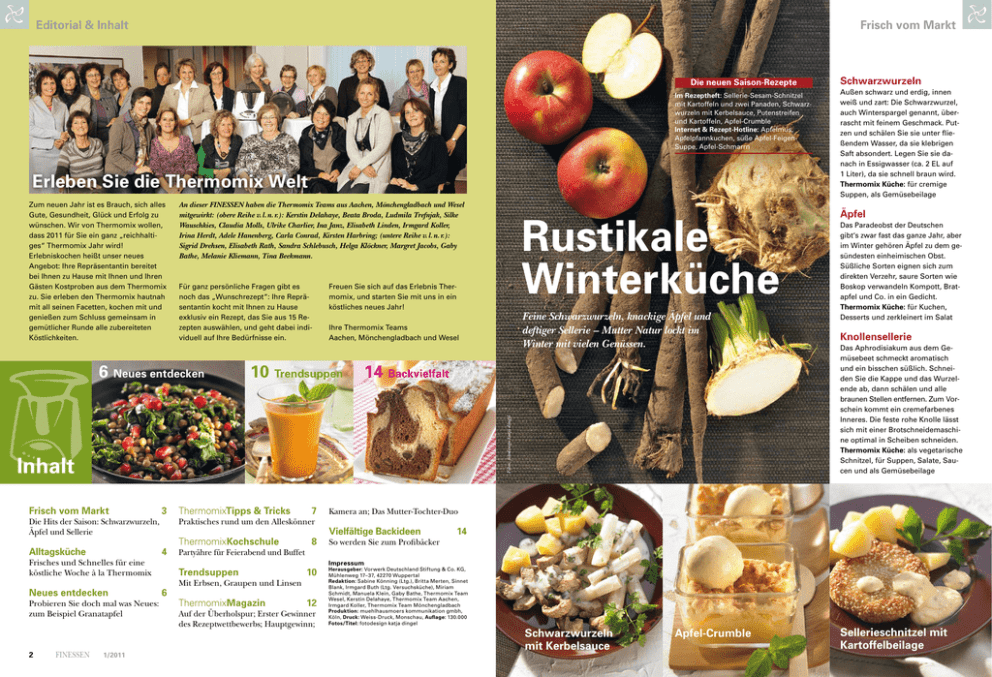 Editorial & Inhalt Frisch vom Markt Schwarzwurzeln Die neuen Saison-Rezepte Außen schwarz und erdig, innen weiß und zart: Die Schwarzwurzel, auch Winterspargel genannt, überrascht mit feinem Geschmack. Putzen und schälen Sie sie unter fließendem Wasser, da sie klebrigen Saft absondert. Legen Sie sie danach in Essigwasser (ca. 2 EL auf 1 Liter), da sie schnell braun wird. Thermomix Küche: für cremige Suppen, als Gemüsebeilage Im Rezeptheft: Sellerie-Sesam-Schnitzel mit Kartoffeln und zwei Panaden, Schwarzwurzeln mit Kerbelsauce, Putenstreifen und Kartoffeln, Apfel-Crumble Internet & Rezept-Hotline: Apfelmus, Apfelpfannkuchen, süße Apfel-FeigenSuppe, Apfel-Schmarrn Erleben Sie die Thermomix Welt Zum neuen Jahr ist es Brauch, sich alles Gute, Gesundheit, Glück und Erfolg zu wünschen. Wir von Thermomix wollen, dass 2011 für Sie ein ganz „reichhaltiges“ Thermomix Jahr wird! Erlebniskochen heißt unser neues Angebot: Ihre Repräsentantin bereitet bei Ihnen zu Hause mit Ihnen und Ihren Gästen Kostproben aus dem Thermomix zu. Sie erleben den Thermomix hautnah mit all seinen Facetten, kochen mit und genießen zum Schluss gemeinsam in gemütlicher Runde alle zubereiteten Köstlichkeiten. An dieser FINESSEN haben die Thermomix Teams aus Aachen, Mönchengladbach und Wesel mitgewirkt: (obere Reihe v. l. n. r.): Kerstin Delahaye, Beata Broda, Ludmila Trefnjak, Silke Wauschkies, Claudia Molls, Ulrike Charlier, Ina Janz, Elisabeth Linden, Irmgard Koller, Irina Herdt, Adele Hanenberg, Carla Conrad, Kirsten Harbring; (untere Reihe v. l. n. r.): Sigrid Drehsen, Elisabeth Rath, Sandra Schlebusch, Helga Klöckner, Margret Jacobs, Gaby Bathe, Melanie Kliemann, Tina Beekmann. Für ganz persönliche Fragen gibt es noch das „Wunschrezept“: Ihre Repräsentantin kocht mit Ihnen zu Hause exklusiv ein Rezept, das Sie aus 15 Rezepten auswählen, und geht dabei individuell auf Ihre Bedürfnisse ein. Freuen Sie sich auf das Erlebnis Thermomix, und starten Sie mit uns in ein köstliches neues Jahr! Frisch vom Markt 3 Die Hits der Saison: Schwarzwurzeln, Äpfel und Sellerie Alltagsküche 10 Trendsuppen 4 Neues entdecken Probieren Sie doch mal was Neues: zum Beispiel Granatapfel 1/2011 ThermomixTipps & Tricks 7 Praktisches rund um den Alleskönner Frisches und Schnelles für eine köstliche Woche à la Thermomix FINESSEN Feine Schwarzwurzeln, knackige Äpfel und deftiger Sellerie – Mutter Natur lockt im Winter mit vielen Genüssen. Ihre Thermomix Teams Aachen, Mönchengladbach und Wesel Knollensellerie Das Aphrodisiakum aus dem Gemüsebeet schmeckt aromatisch und ein bisschen süßlich. Schneiden Sie die Kappe und das Wurzel ende ab, dann schälen und alle braunen Stellen entfernen. Zum Vorschein kommt ein cremefarbenes Inneres. Die feste rohe Knolle lässt sich mit einer Brotschneidemaschine optimal in Scheiben schneiden. Thermomix Küche: als vegetarische Schnitzel, für Suppen, Salate, Saucen und als Gemüsebeilage 14 Backvielfalt Inhalt 2 Rustikale Winterküche Das Paradeobst der Deutschen gibt‘s zwar fast das ganze Jahr, aber im Winter gehören Äpfel zu dem gesündesten einheimischen Obst. Süßliche Sorten eignen sich zum direkten Verzehr, saure Sorten wie Boskop verwandeln Kompott, Bratapfel und Co. in ein Gedicht. Thermomix Küche: für Kuchen, Desserts und zerkleinert im Salat Fotos: fotodesign katja dingel 6 Neues entdecken Äpfel ThermomixKochschule Partyähre für Feierabend und Buffet Trendsuppen 6 8 10 Mit Erbsen, Graupen und Linsen ThermomixMagazin 12 Auf der Überholspur; Erster Gewinner des Rezeptwettbewerbs; Hauptgewinn; Kamera an; Das Mutter-Tochter-Duo Vielfältige Backideen 14 So werden Sie zum Profibäcker Impressum Herausgeber: Vorwerk Deutschland Stiftung & Co. KG, Mühlenweg 17–37, 42270 Wuppertal Redaktion: Sabine Könning (Ltg.), Britta Merten, Sinnet Blank, Irmgard Buth (Ltg. Versuchsküche), Miriam Schmidt‚ Manuela Klein, Gaby Bathe, Thermomix Team Wesel, Kerstin Delahaye, Thermomix Team Aachen, Irmgard Koller, Thermomix Team Mönchengladbach Produktion: muehlhausmoers kommunikation gmbh, Köln, Druck: Weiss-Druck, Monschau, Auflage: 130.000 Fotos/Titel: fotodesign katja dingel Schwarzwurzeln mit Kerbelsauce Apfel-Crumble Sellerieschnitzel mit Kartoffelbeilage FINESSEN 6/2010 3 Trendsuppen Erbsen Aussehen: Typische Suppenerbsen sind die gelben und grünen Schälerbsen. Je größer sie sind, desto mehliger sind sie im Geschmack und machen Suppen und Co. sämig. Verwendung: Suppen, Eintöpfe, Pürees Neue Thermomix Rezepte Im Rezeptheft: Mediterrane Erbsencremesuppe, Grünkohlsuppe mit Graupen, Linsen-Orangen-Suppe, Ägyptische Linsensuppe, Linsenspinat mit Granatapfelkernen Graupen Aussehen: Bei den ovalen Körnern handelt es sich um geschälte, geschliffene und polierte Gerstenkörner. Es gibt sie als grobe, mittlere und feine Variante. Zubereitung im Thermomix: Graupen werden nicht eingeweicht, je nach Größe garen sie circa 30–40 Min. Verwendung: Suppeneinlage, Risotto Neues mit Erbsen, Graupen Linsen Hülsenfrüchte und Getreide machen sich stadtfein und schlüpfen in neue Rollen! Das Ergebnis: Erbsen mit Thymian, Graupen mit Grünkohl und Linsen mit Nelken und Zimt. Freuen Sie sich auf einen neuen Geschmack. Mediterrane Erbsensuppe mit Lorbeer, Nelkenpulver und Thymian 10 FINESSEN 1/2011 E Lust auf mehr? Erbsen, Graupen, Linsen à la Thermomix rbsen, Graupen und Linsen kamen früher als preiswerte Sattmacher auf den Tisch. Heute befreien immer mehr Köche sie von ihrem angestaubten Image und kombinieren diese Klassiker mit neuen Zutaten. Auch die Thermomix Versuchsküche ist neuen Trends immer auf der Spur und hat die drei unter die Lupe genommen. Lassen Sie sich überraschen, und genießen Sie die neuen Suppen Löffel für Löffel. Ägyptische Linsensuppe mit Nelken, Kreuzkümmel und Knoblauch Blättern Sie doch mal in unseren Kochbüchern, dort finden Sie weitere Ideen für das leckere Trio. Pirates Cooking: Linsen mit Spätzle, So koche ich gerne: Linse